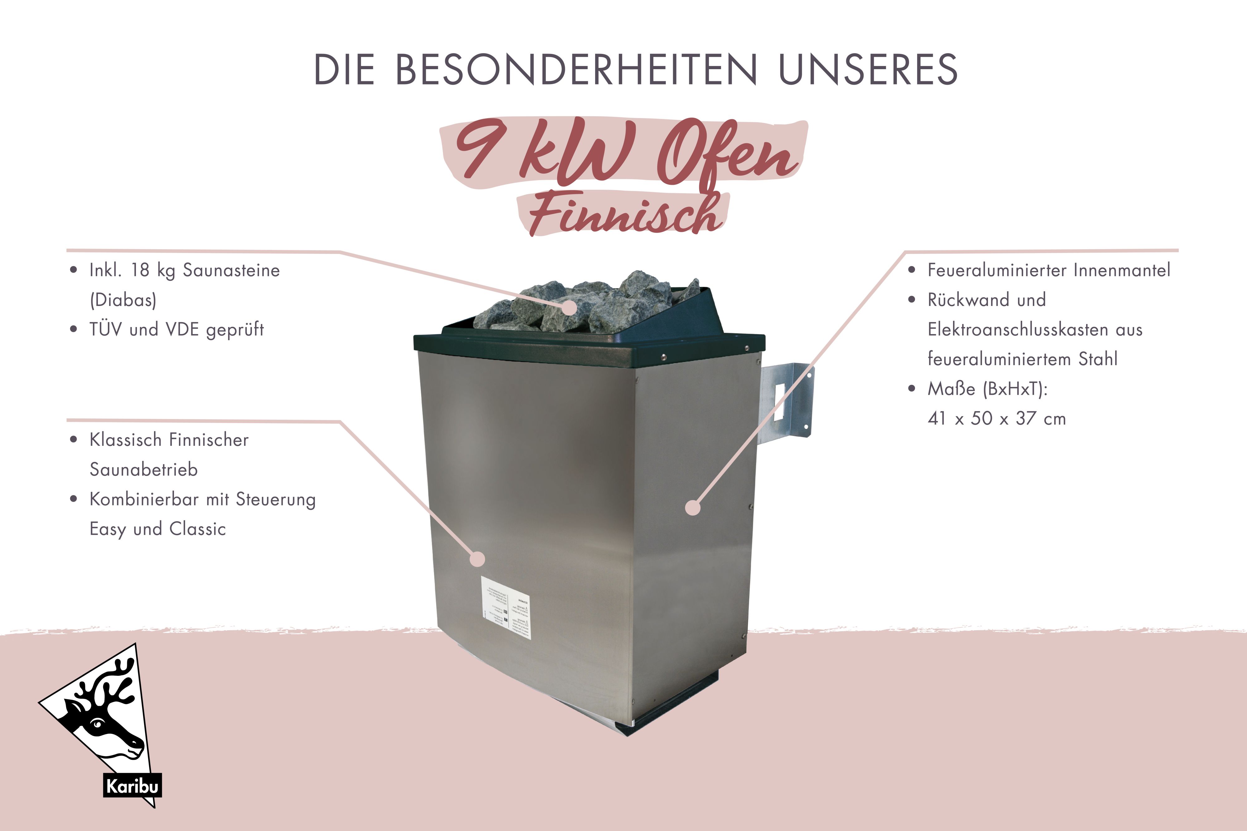 - Ofentyp: Klassischer Elektroofen für finnische Sauna