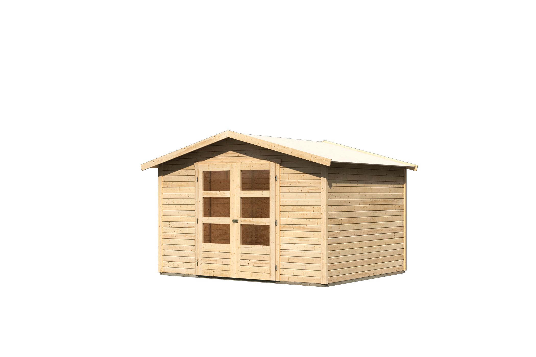 Ein klassisches Gartenhaus - unter diesem Motto lässt sich das Gartenhaus Amberg 5 zusammenfassen. Das Satteldachhaus besteht aus 19mm starker, nordischer Fichte im klassischen Steck- und Schraubsystem. Dieses ermöglicht einen einfachen und schnellen Aufbau, wofür kein großes handwerkliches Geschick erforderlich ist. Das Satteldach mit einer Dachfläche von 9,1 m² macht aus dem Gartenhaus einen echten Klassiker und ein Muss für Ihren Garten. Das Gartenhaus ist in der Farbe Terragrau und in Naturbelassen erhältlich, lässt sich ganz individuell gestalten und lässt sich so optimal Ihren Wünschen und Bedürfnissen anpassen. Die Doppelflügeltür mit drei Lichtausschnitten pro Türflügel rundet das Äußere des Gartenhauses ab und lässt Tageslicht hinein. Geschützt vor unbefugten Eindringen wird das Gartenhaus mit einer Sicherheitsüberfalle. Auch der Innenraum bietet viele Gestaltungsmöglichkeiten. Mit einem Innenmaß von (BxT) 301,5 x 241,5 cm eignet es sich ideal für eine gemütliche Sitzlounge, die zum Entspannen im eigenen Garten einlädt. Durch die klassische Optik des Gartenhauses fügt es sich in das Gesamtbild des Gartens optimal ein. Runden Sie Ihr Gartenhaus mit dem passenden Zubehör ab. Durch eine Holzdachrinne, Dachschindeln als Dachbedeckung oder den passenden Fußboden verleihen Sie Ihrem Gartenhaus den letzten Schliff. Erweitern Sie die Möglichkeiten im eigenen Garten mit dem Gartenhaus Amberg 5.