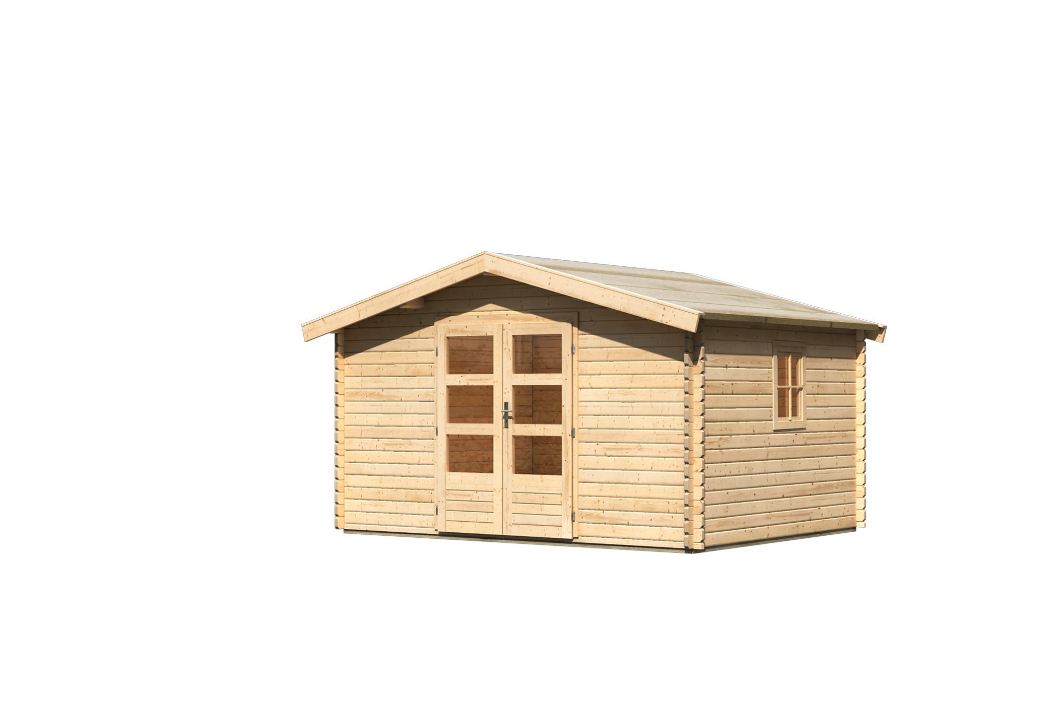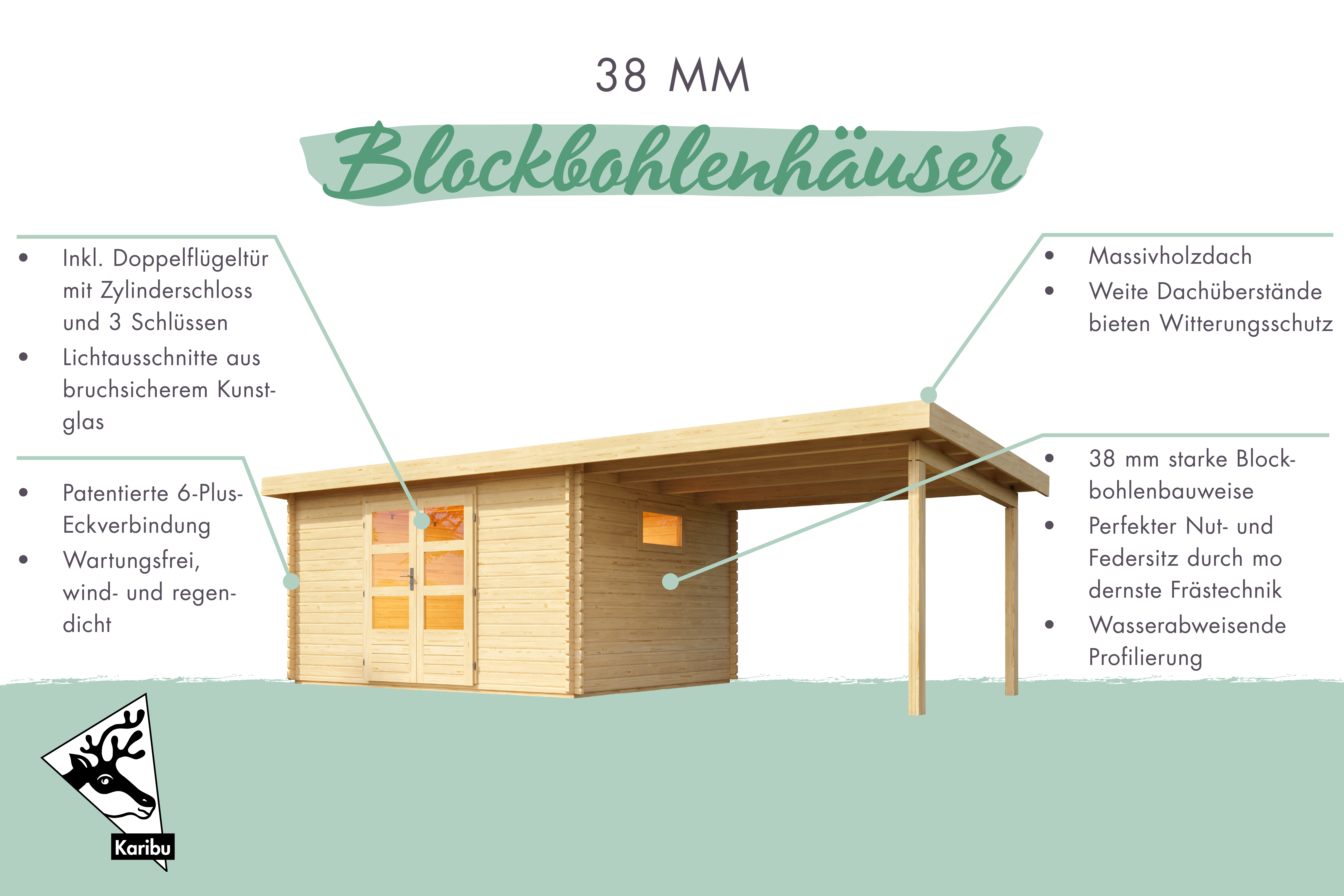 Das Meldorf 5 wird aus 38 mm starken Wandbohlen aus nordischer Fichte in klassischer Bockbohlenbauweise gefertigt und gewährleistet somit einen einfachen Aufbau und eine sehr stabile Konstruktion. Bei dieser Bauweise werden die Wandbohlen reihum aufgestapelt, beginnend mit einer halben Bohle für eine glatte und stabile Auflage, und dann miteinander verschraubt. Unsere patentierte 6-Plus-Eckverbindung garantiert eine sehr hohe Regen- und Winddichte. Durch die Doppelnut und -feder sind die Wände extrem stabil. Die in den Eckverbindungen sitzenden Vorbohrungen für die Verschraubung der Blockbohlen sind werkseitig vorgefertigt und verkürzen die Montage enorm. Das Satteldach besteht aus Massivholdach. Der vordere Dachüberstand von 270 cm schützt den Eingangsbereich darüber hinaus wirkungsvoll. Die Grundfläche beträgt 11,5 m² bei einem umbauten Raum von 22,2 m³. Mit einer Seitenhöhe von 188 cm und einer Firsthöhe von 242 cm bietet das Gerätehaus optimale Raumnutzung. Das Gartenhaus ohne Anbauten hat ein Sockelmaß von 372 cm x 282 cm. Bei den Blockbohlenhäusern kommt hierzu noch das Maß der überstehenden Blockbohlenköpfe. Bodenbalken sorgen für den Schutz von unten und werden unter das Gartenhaus gelegt. Durch die Kesseldruckimprägnierung der Bodenbalken sind diese vor Witterungseinflüssen und holzzersetzenden Pilzen bereits geschützt. Die praktische und vormontierte Tür sorgt mit Ihren großzügigen Abmessungen und dem Massivholzrahmen für einen einfachen Zutritt in das Gartenhaus und sichert den Inhalt nebenbei effektiv vor unbefugtem Zugriff. Die Verglasung der Lichtausschnitte sorgt für großzügigen Tageslichteinfall.