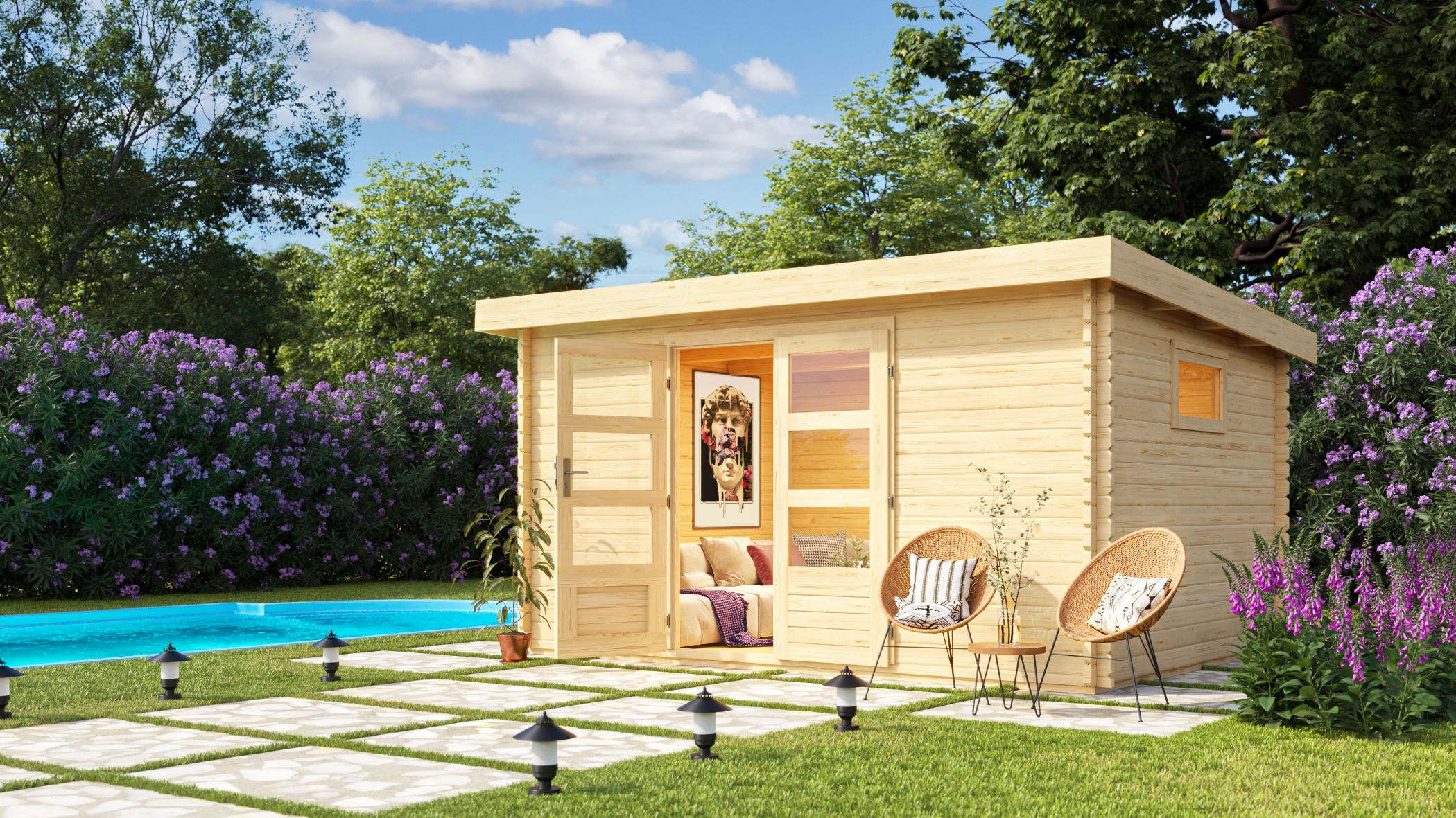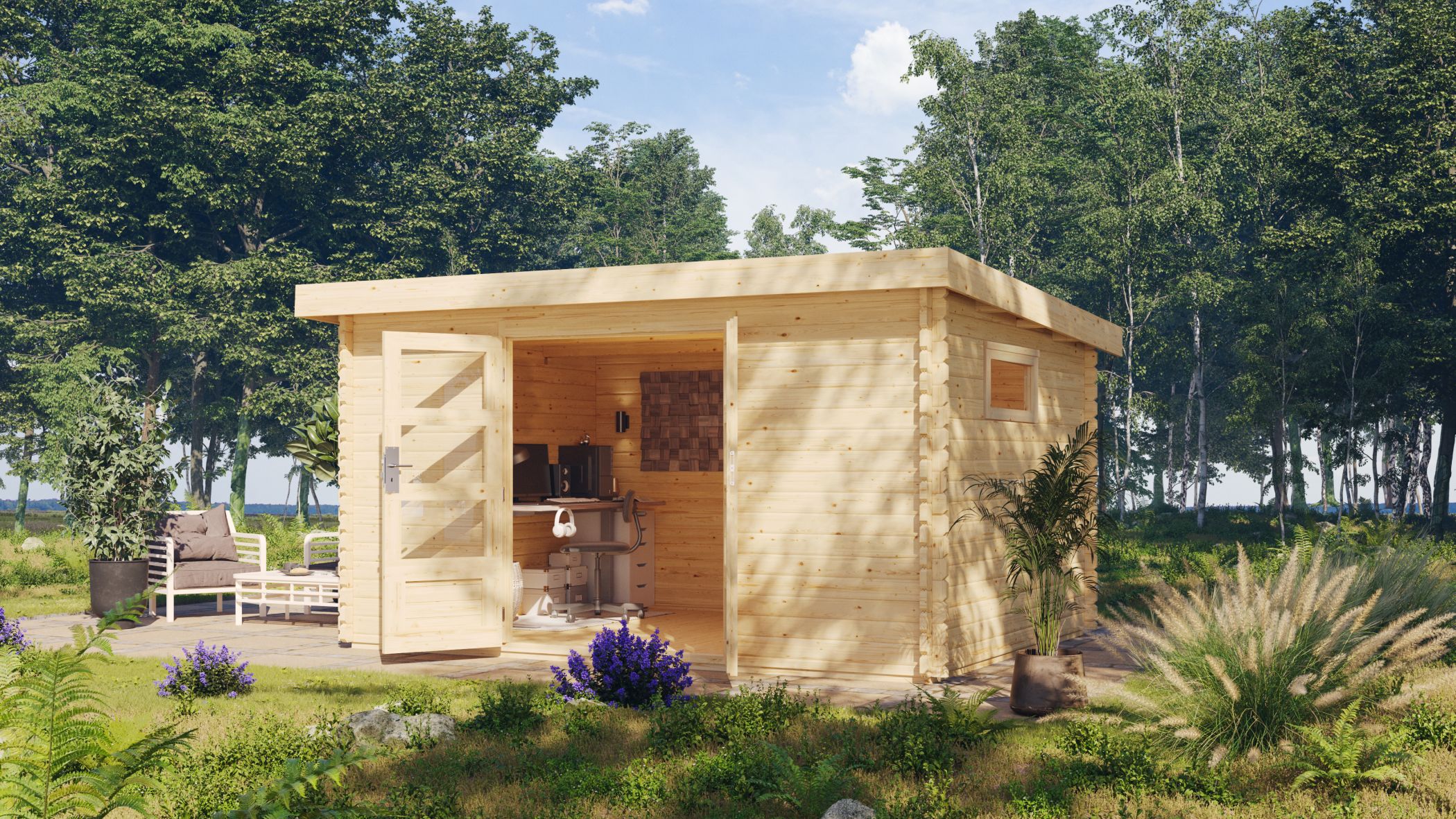 Hinweis: Fußboden und Dacheindeckung optional erhältlich (nicht im Lieferumfang des Hauses enthalten)!
