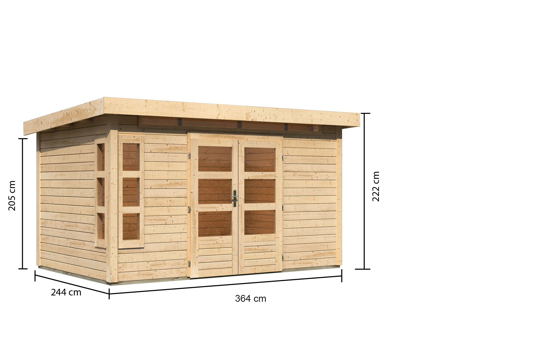 Betreten wird das Gartenhaus Kastorf duch eine moderne Doppelflügeltür mit 6 Lichtausschnitten aus Kunstglas. Mit einem Zylinderschloss und 3 Schlüsseln wird das Gartenhaus abgeschlossen. Zusätzlich kann das Gartenhaus Kastorf mit einem Anbaudach in der Breite von 2,60 m und 3,20 m ergänzt werden. Passend dazu kann eine Seiten- und/oder Rückwand gewählt werden, um einen geschützen Außenbereich zu schaffen.