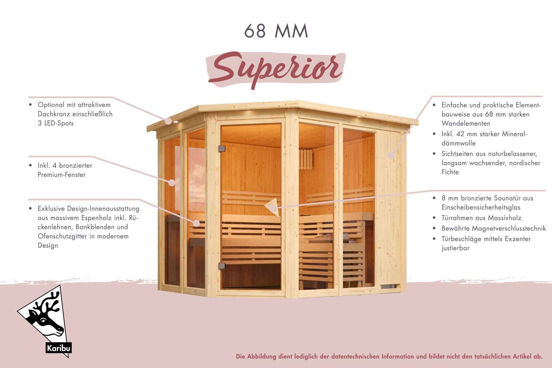 Die 68 mm Sauna Askja gehört zu unseren Superior-Saunen und hat ein Außenmaß von 216 x 234 cm ohne Dachkranz. Das bedeutet, dass im Lieferumfang 2 bronzierte Fenster, optional ein Dachkranz mit 3 LED-Spots, Rückenlehnen, Bankblenden, Liegen und ein Ofenschutzgitter aus Espe enthalten sind. Die formschöne Sauna hat eine Front aus bronziertem Glas, dazu gehört auch die Saunatür mit Karibu-Türgriff mit einem Durchgangsmaß von 64 x 173 cm. Die Wände und das Dach bestehen aus Massivholz mit 42 mm starker Mineraldämmwolle, welche ganz einfach in der Elementbauweise zusammengebaut werden.
