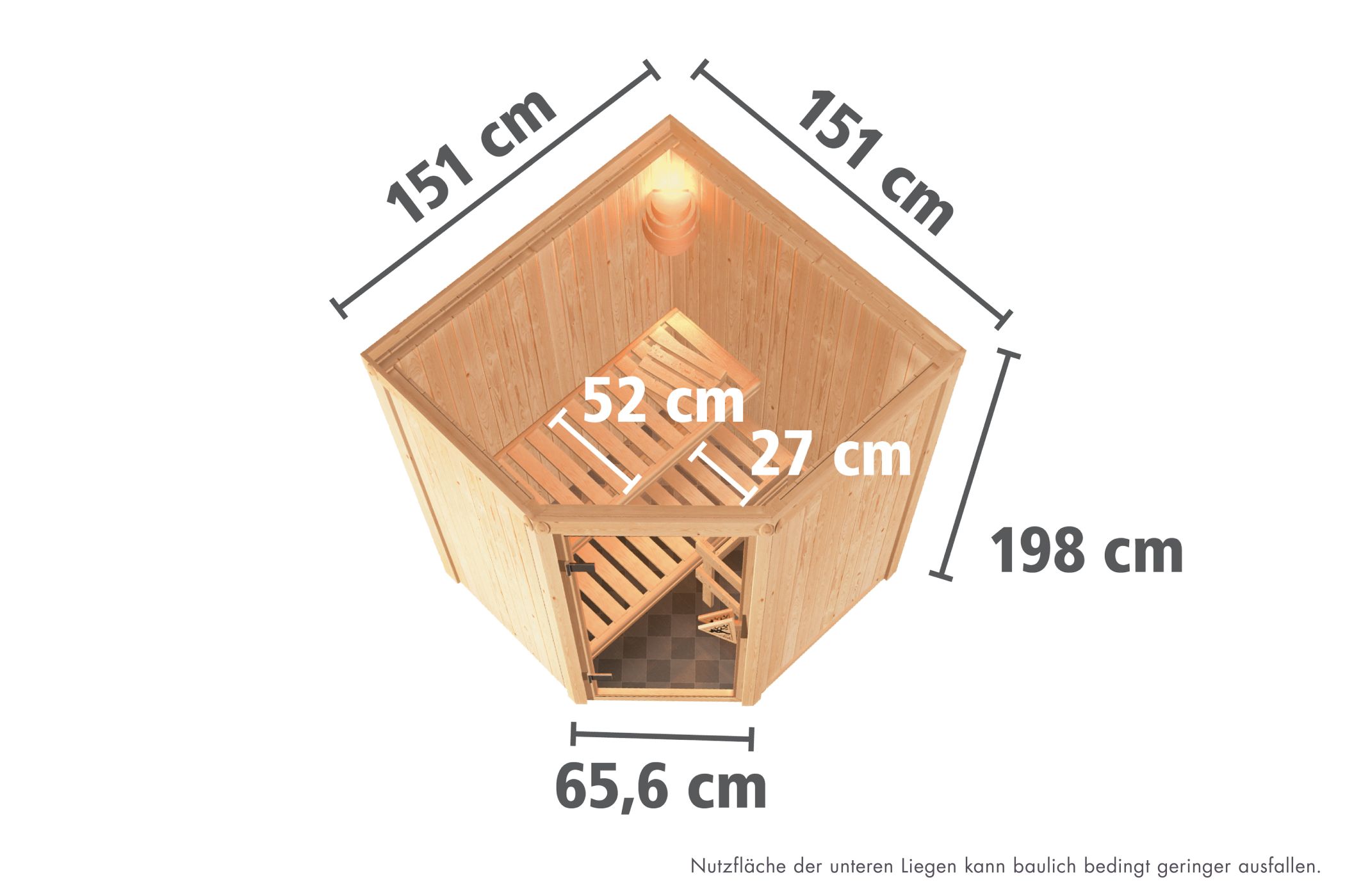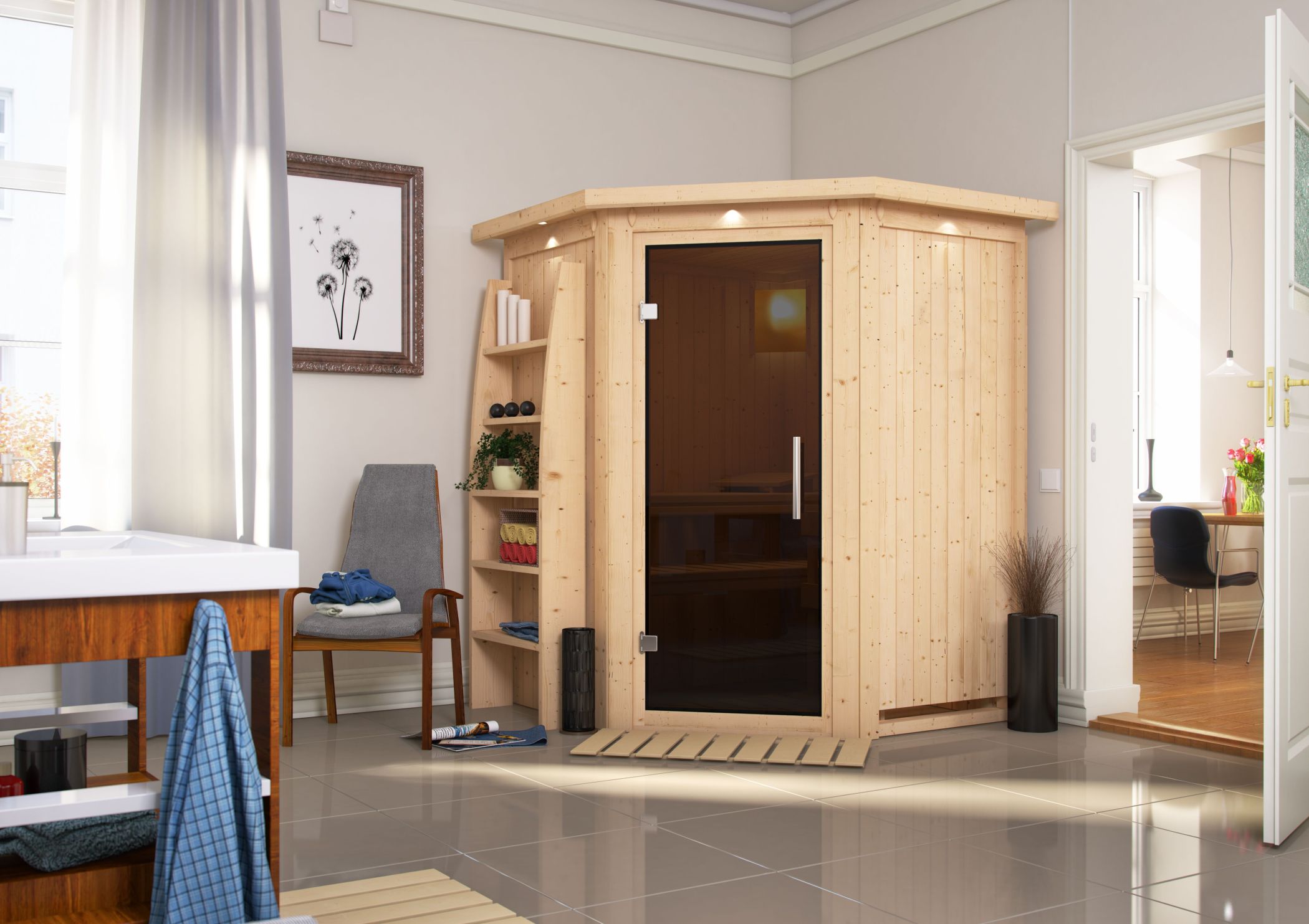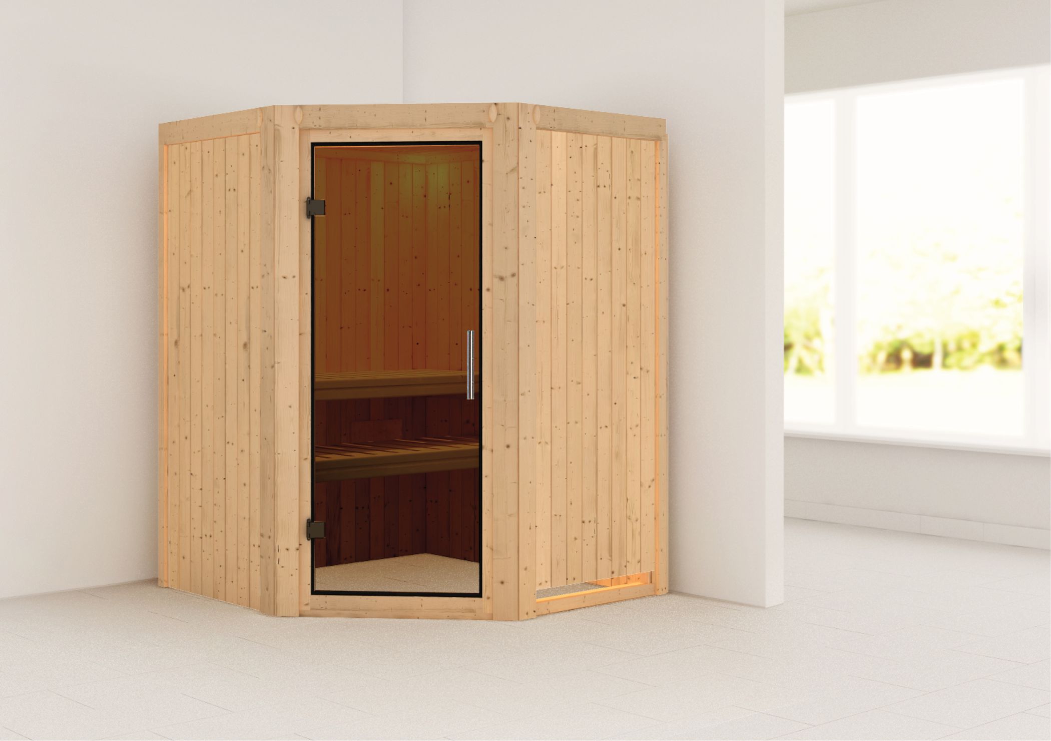 Karibu Innensauna "Sauna Nanja" 2 Personen 230 V ohne Ofen Glastür (grau getönt)