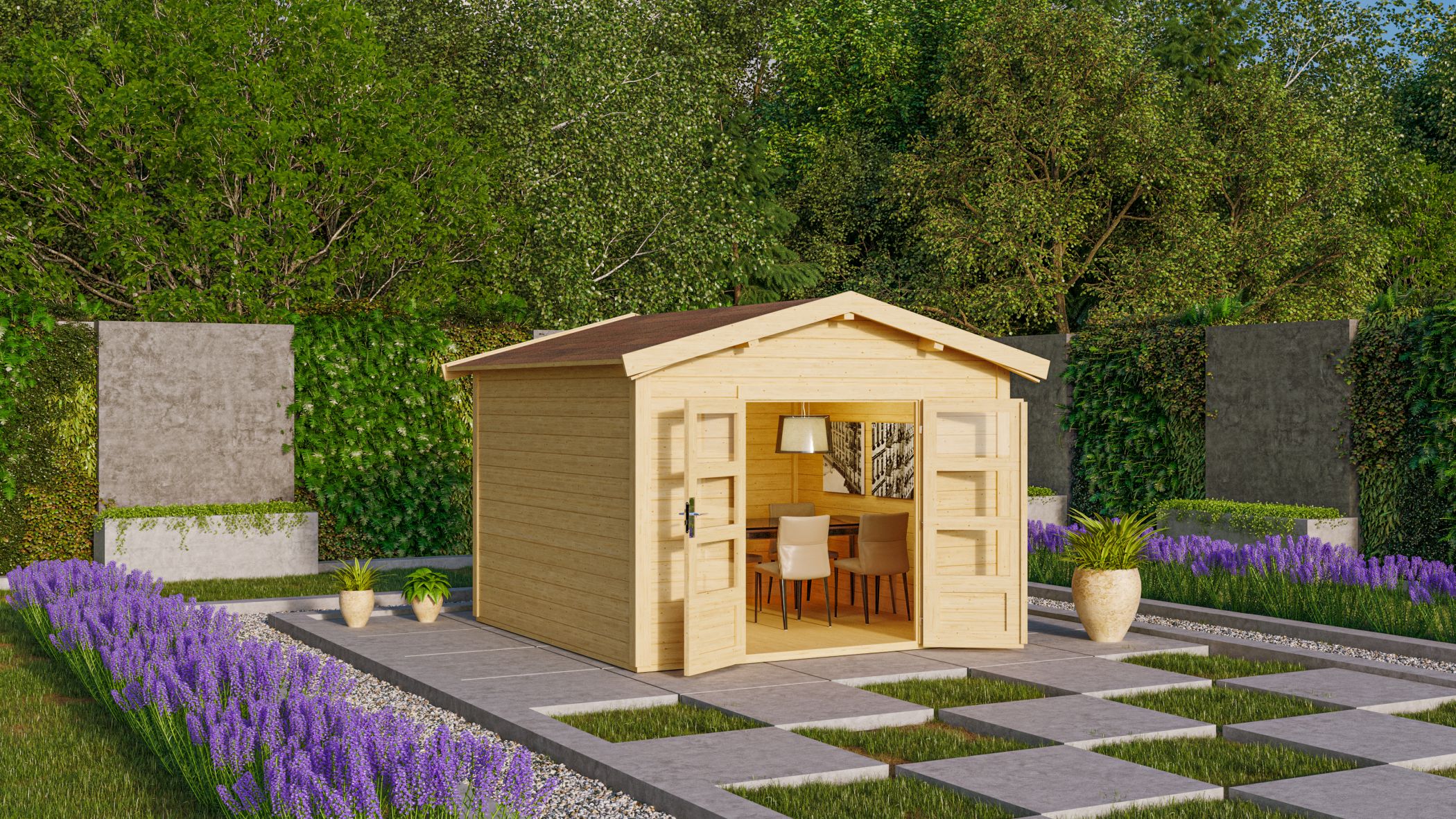 Zudem lässt sich die Tür vom Theres 7 ebenfalls in die Seite einsetzen, so kann das Gartenhaus individuell aufgebaut werden.