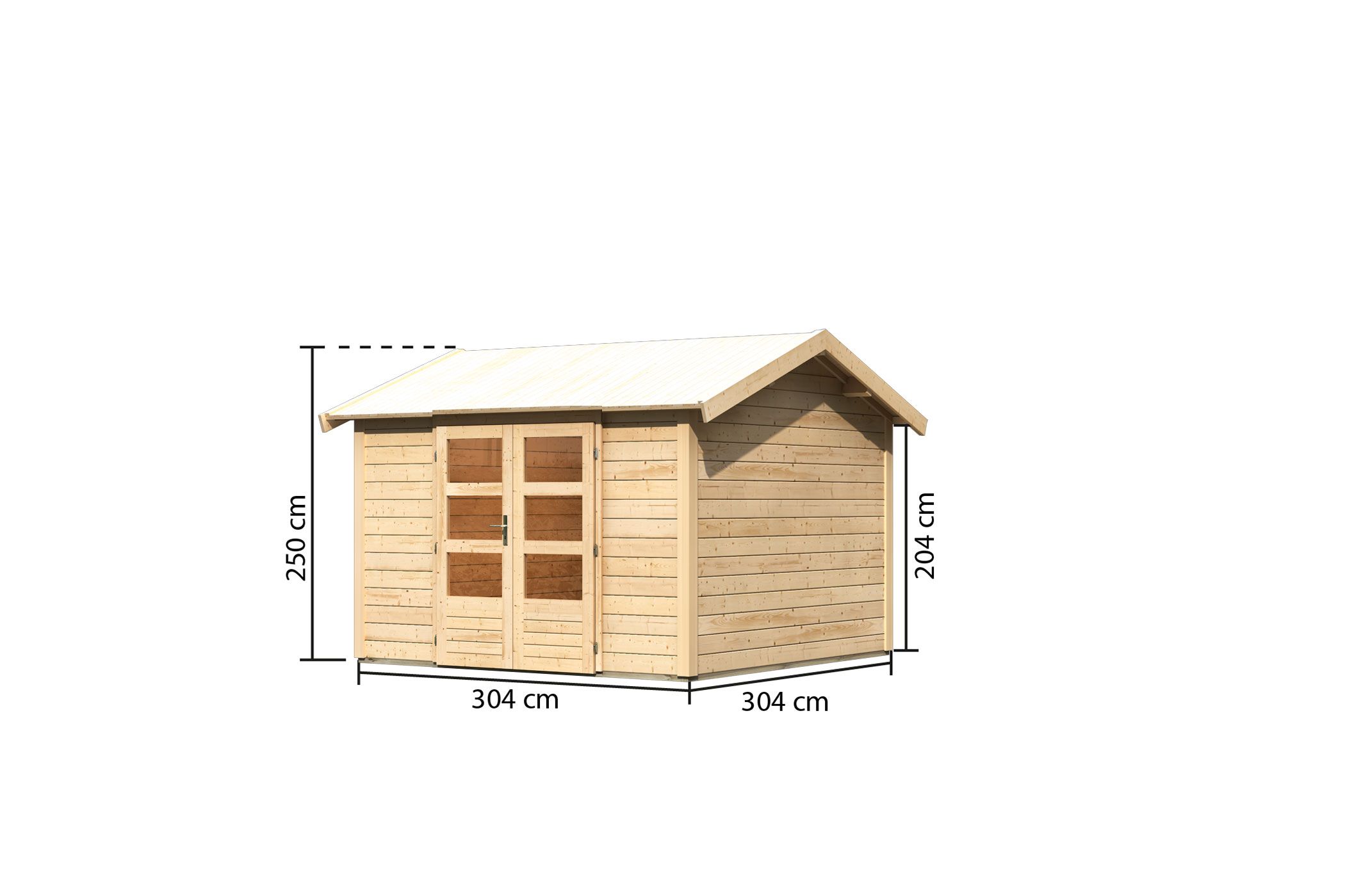 Das Gartenhaus Theres 7 hat ein Außenmaß von 304 x 304 cm. Das klassische Satteldach gibt dem Gartenhaus seine schöne, klassische Optik. Durch die moderne Doppelfügeltür mit je 3 Lichtausschnitten pro Türflügel gelangt viel Tageslicht in das Innere des Gartenhauses. Abgeschlossen wird es mit dem im Lieferumfang enthaltendem Zylinderschloss inklusive 3 Schlüsseln. Das Dach wird durch optionale Dachschindeln oder Bitumendachbahnen geschützt, so haben Sie lange Freude am Gartenhaus.
