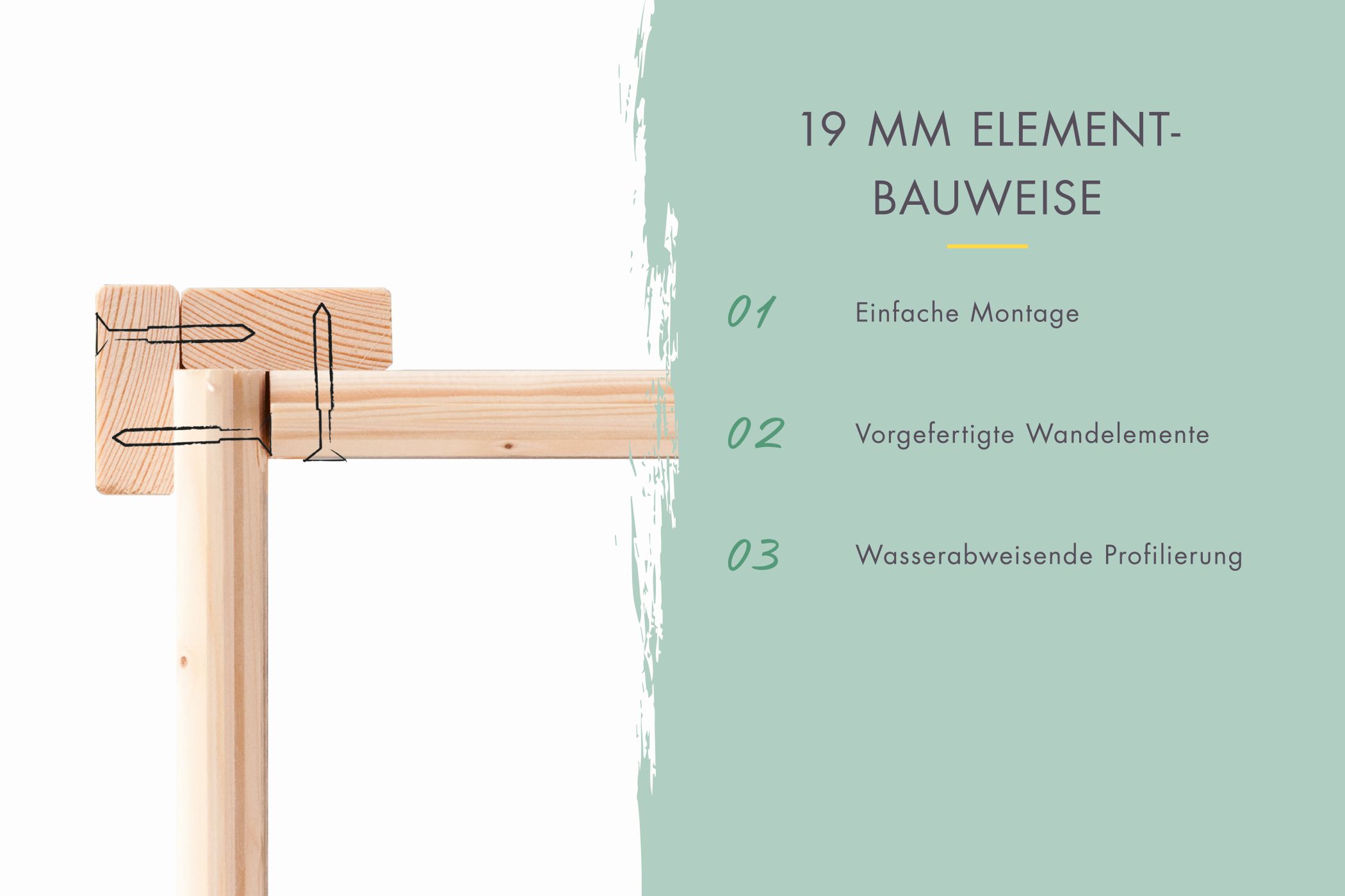 Das Verkaufshaus besteht aus 19 mm starkem, nordischem Fichtenholz. Durch die vormontierten Elemente ist eine einfache und schnelle Montage möglich. Durch diese Eigenschaften bietet unser Verkaufshaus 1 viel Platz für unbegrenzte Möglichkeiten.