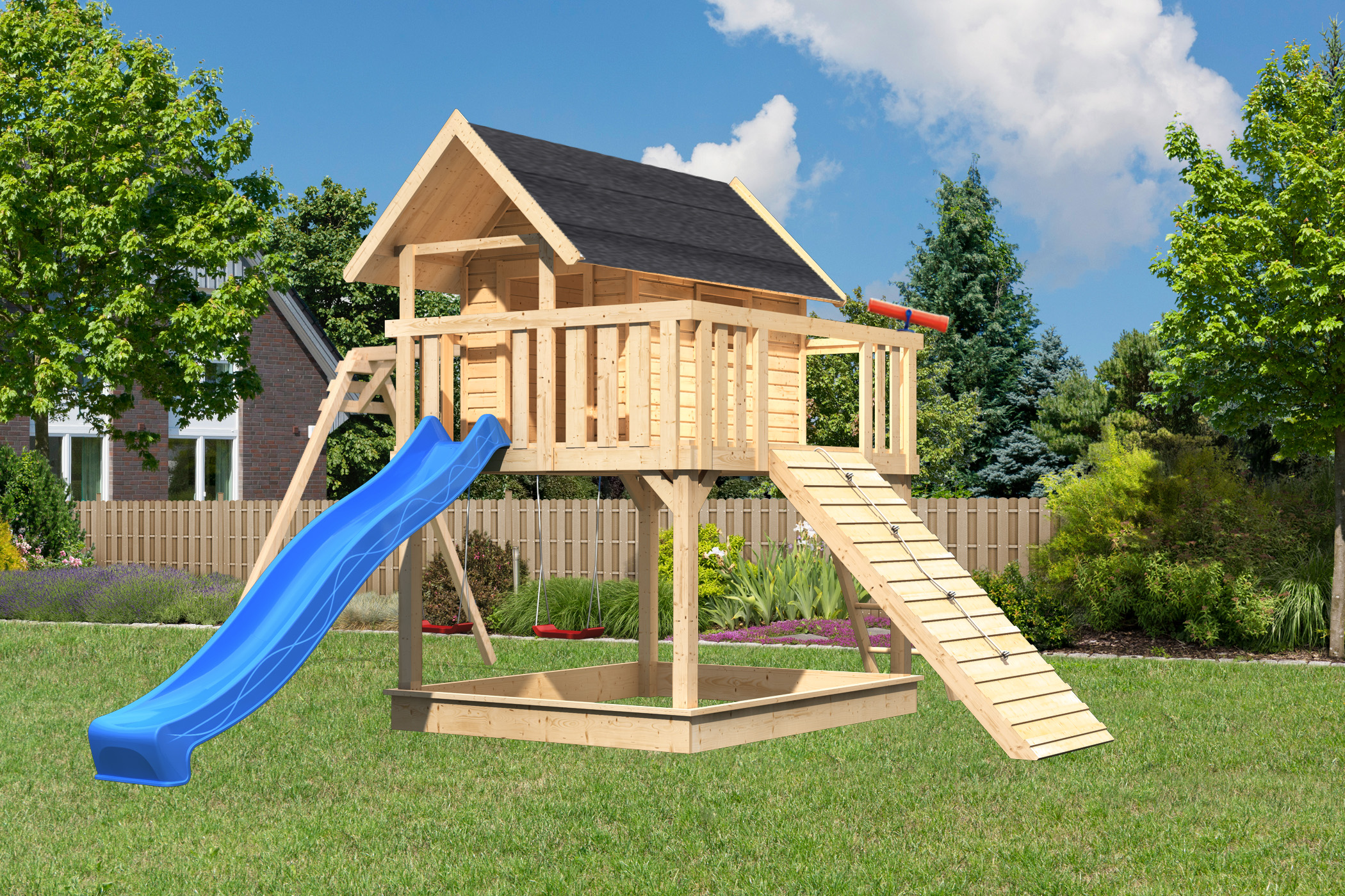 Das Außenmaß dieses Hauses beträgt 198 cm x 243 cm x 329,5 cm und bietet somit unglaublich viel Platz um die Fantasie anzukurbeln. Das Haus wird mit einem Satteldach aus Massivholz geschützt. Die 5,9 m² große Dachfläche bietet auch der Terrasse noch Schutz und sorgt für unbeschwertes Spielvergnügen, egal zu welcher Jahreszeit. Unsere Stelzenhäuser bieten mit einer 300 cm langen Rutsche in vielen Farben sowie weiterem umfangreichem Zubehör alles, was das Kinderherz begehrt.