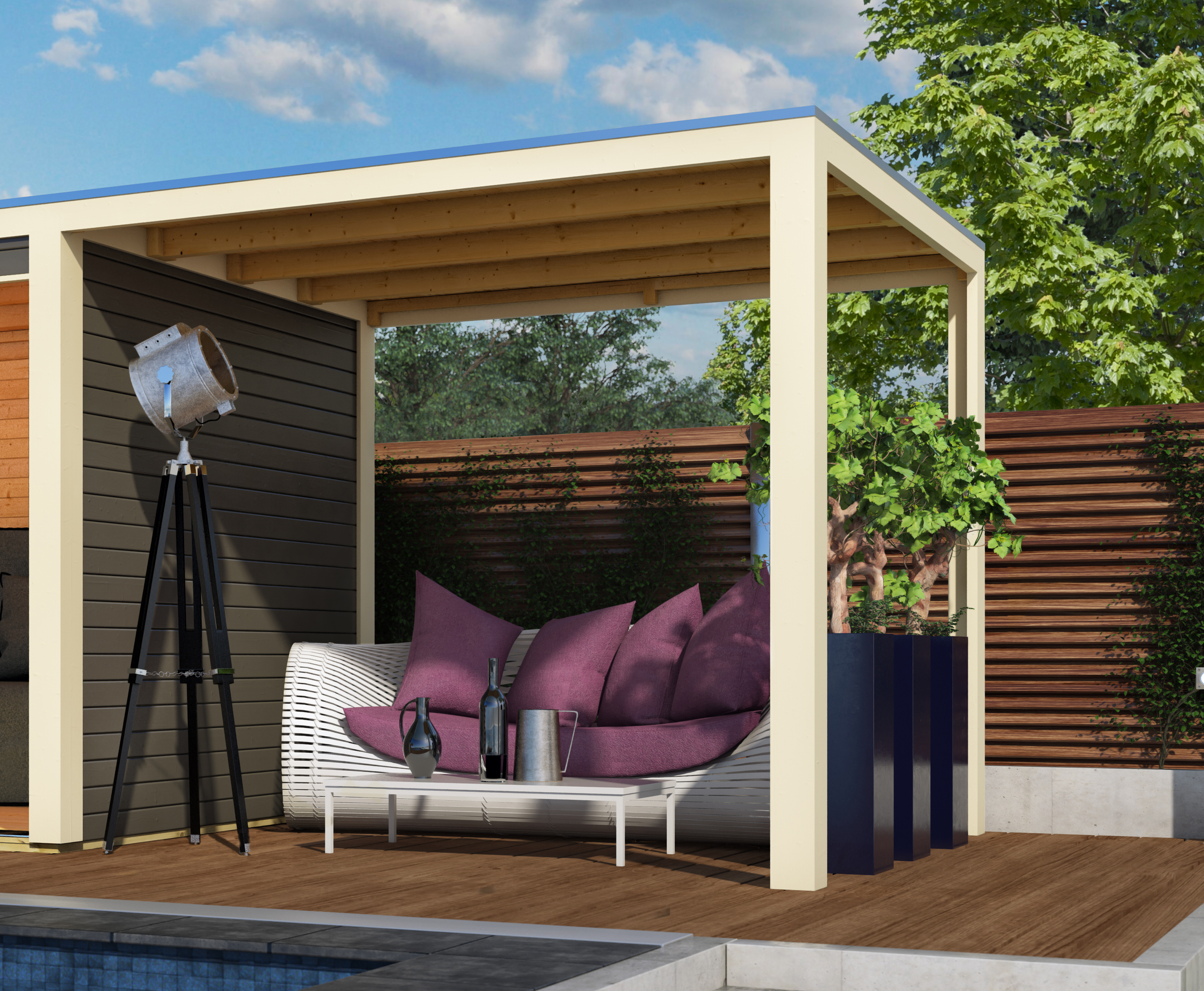 Ergänze das Saunahaus Hygge / Cuben mit einem Anbaudach mit einer Breite von 200 cm.