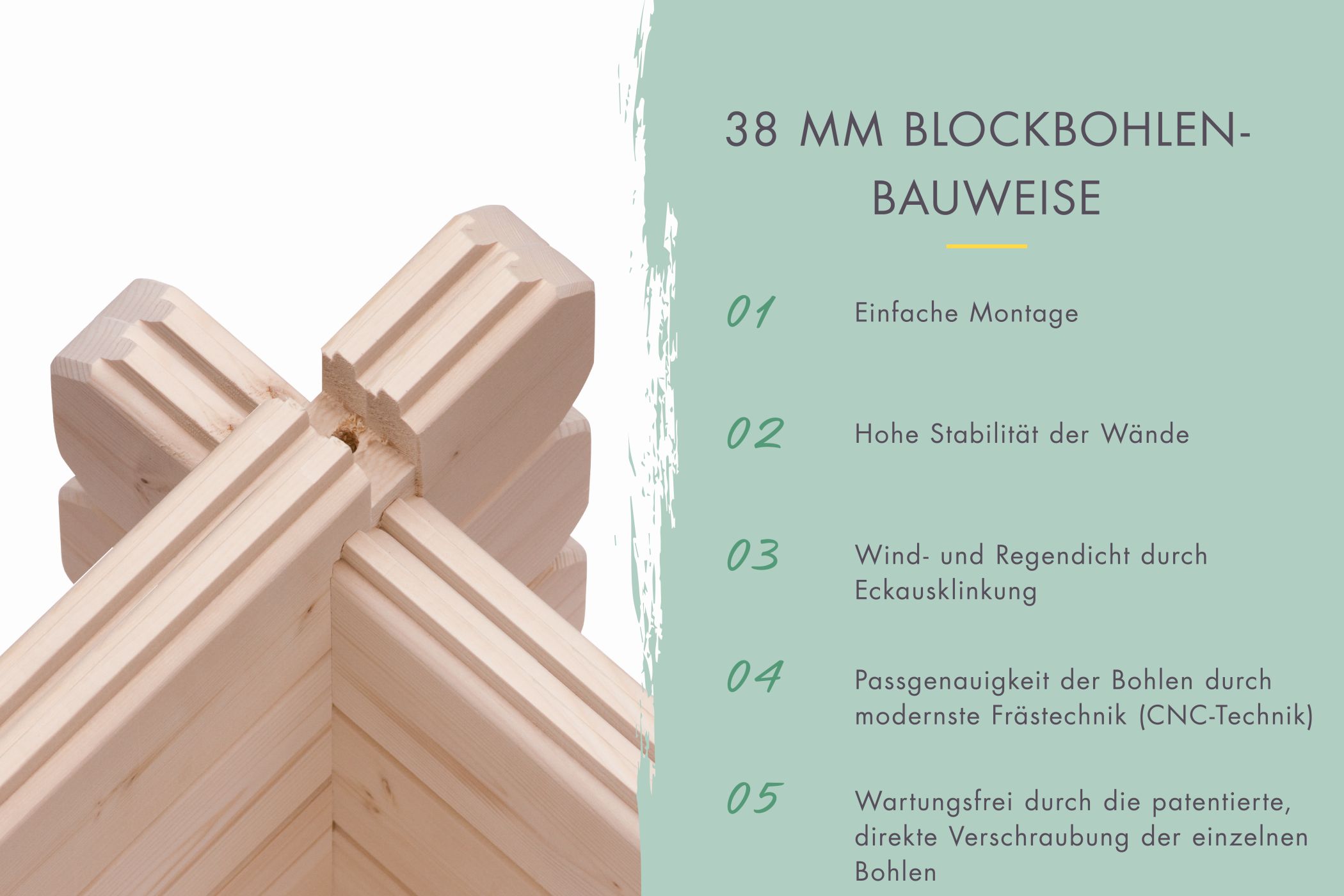 - 38mm Blockbohlenbauweise mit patentierter 6-Plus Eckverbindung