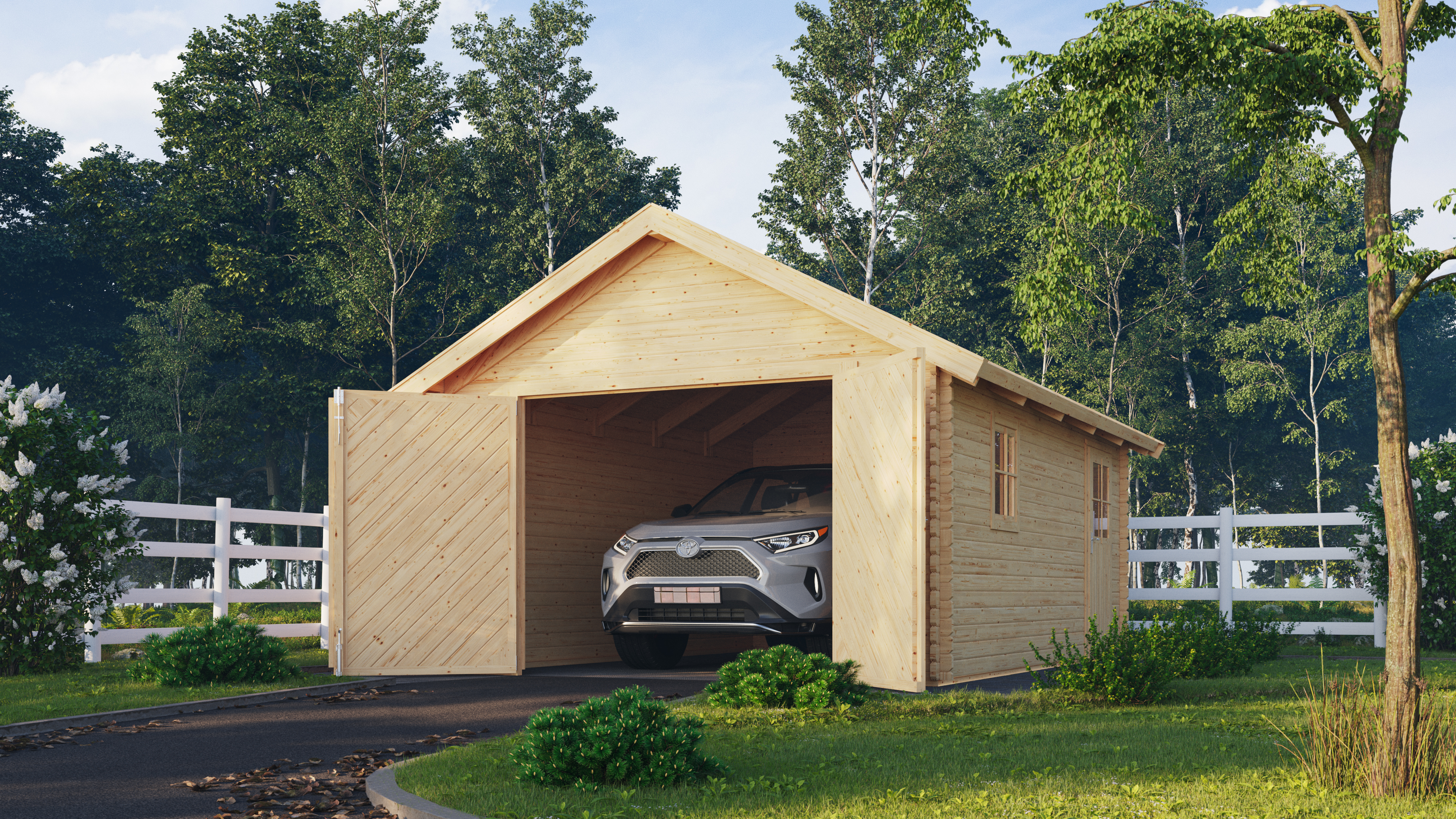 Kein lästiges Kratzen im Winter, keine Blüten oder Pollen auf der Scheibe und vor Diebstahl gesichert, das ist der Traum eines jeden Autobesitzers. Mit der Blockbohlengarage mit Satteldach kann dieser Traum problemlos in Erfüllung gehen. Die Garage besteht aus 38 mm starken Wandbohlen, die in Blockbohlenbauweise montiert werden. Durch die patentiere 6-Plus-Eckverbindung erhält diese besondere Konstruktion eine zusätzliche Stabilität. Das klassische Satteldach besteht aus Massivholzbrettern und schützt Ihren PKW vor der Witterung. Ausgekleidet mit unseren optional erhältlichen Dachschindeln runden Sie die klassische Optik gekonnt ab und bietet Ihrem Eigentum einen Schutz über viele Jahre. Durch ein Vollholzgaragentor mit einem Durchfahrtsmaß von (BxT) 240 x 193 cm inkl. Profilbeschlägen, sowie einer Sicherheitsüberfalle und einer Einflügeltür in der Seite mit einem Lichtausschnitt inkl. eines Zylinderschlosses mit drei Schlüsseln gelangen Sie in das Innere der Blockbohlengarage. Ein im Lieferumfang enthaltenes, frei positionierbares Dreh-/Kippfenster lässt Tageslicht in den Raum und bietet so eine natürliche Lichtquelle. Doch nicht nur Ihrem PKW kann die Blockbohlengarage einen optimalen Schutz bieten. Durch ein Außenmaß von 387 x 537 cm haben Sie, neben Ihrem Auto, noch genügend Platz, um zum Beispiel Ihr Fahrrad, das Spielzeug Ihrer Kleinen oder die Wasserkisten zu verstauen. Schaffen Sie mit der Blockbohlengarage mit Satteldach einen sicheren und trockenen Ort für Ihr Eigentum auf Ihrem Grundstück.