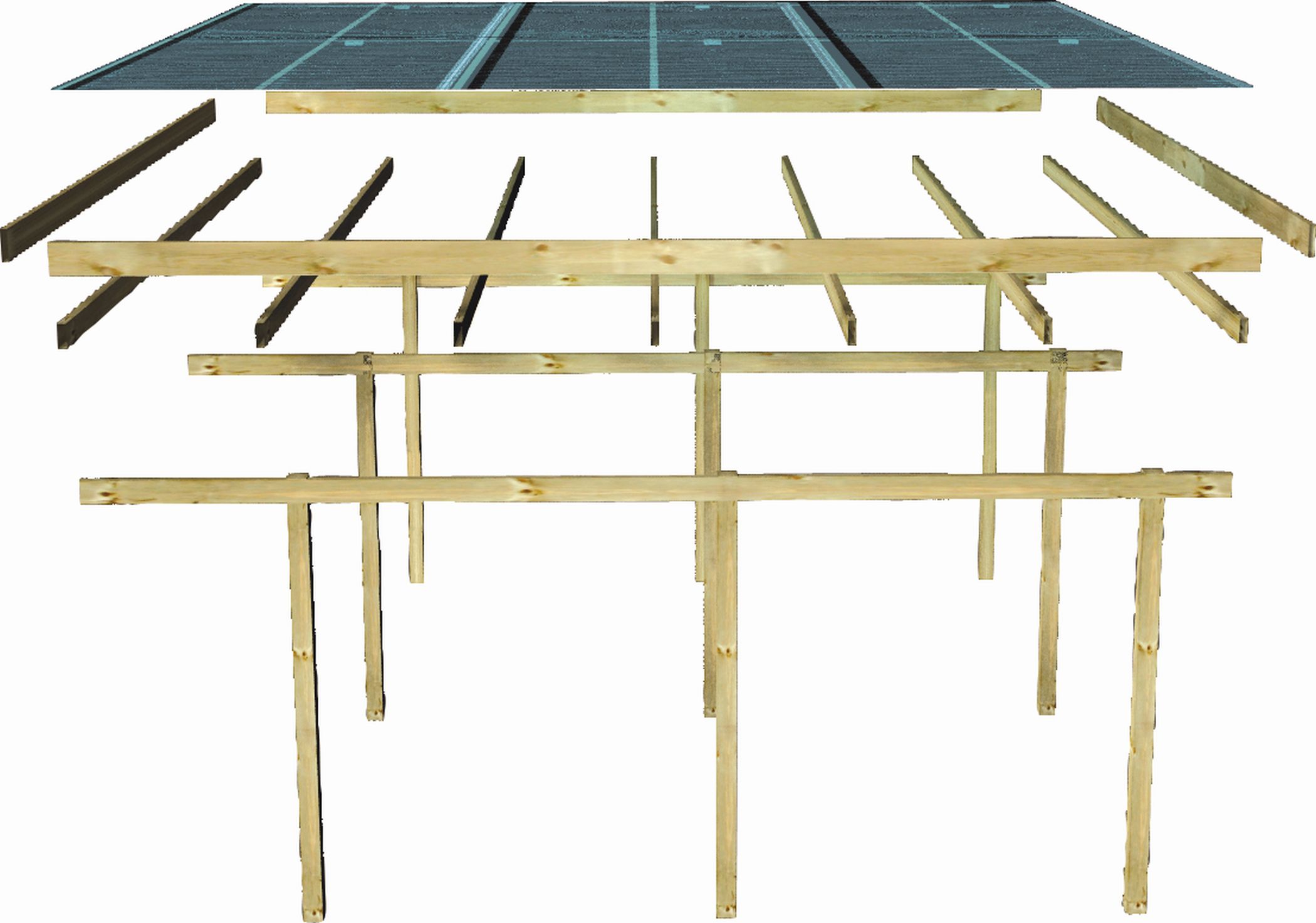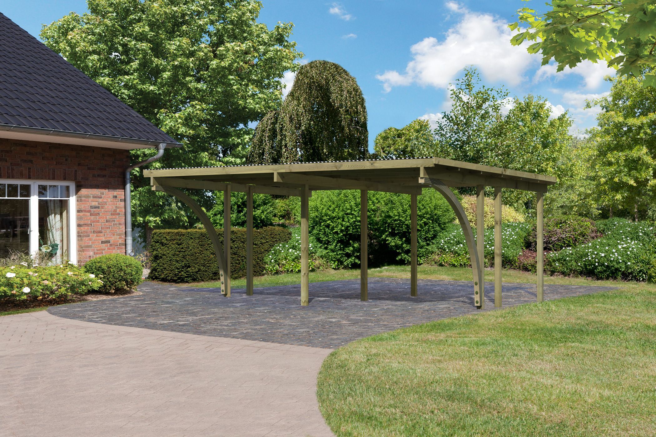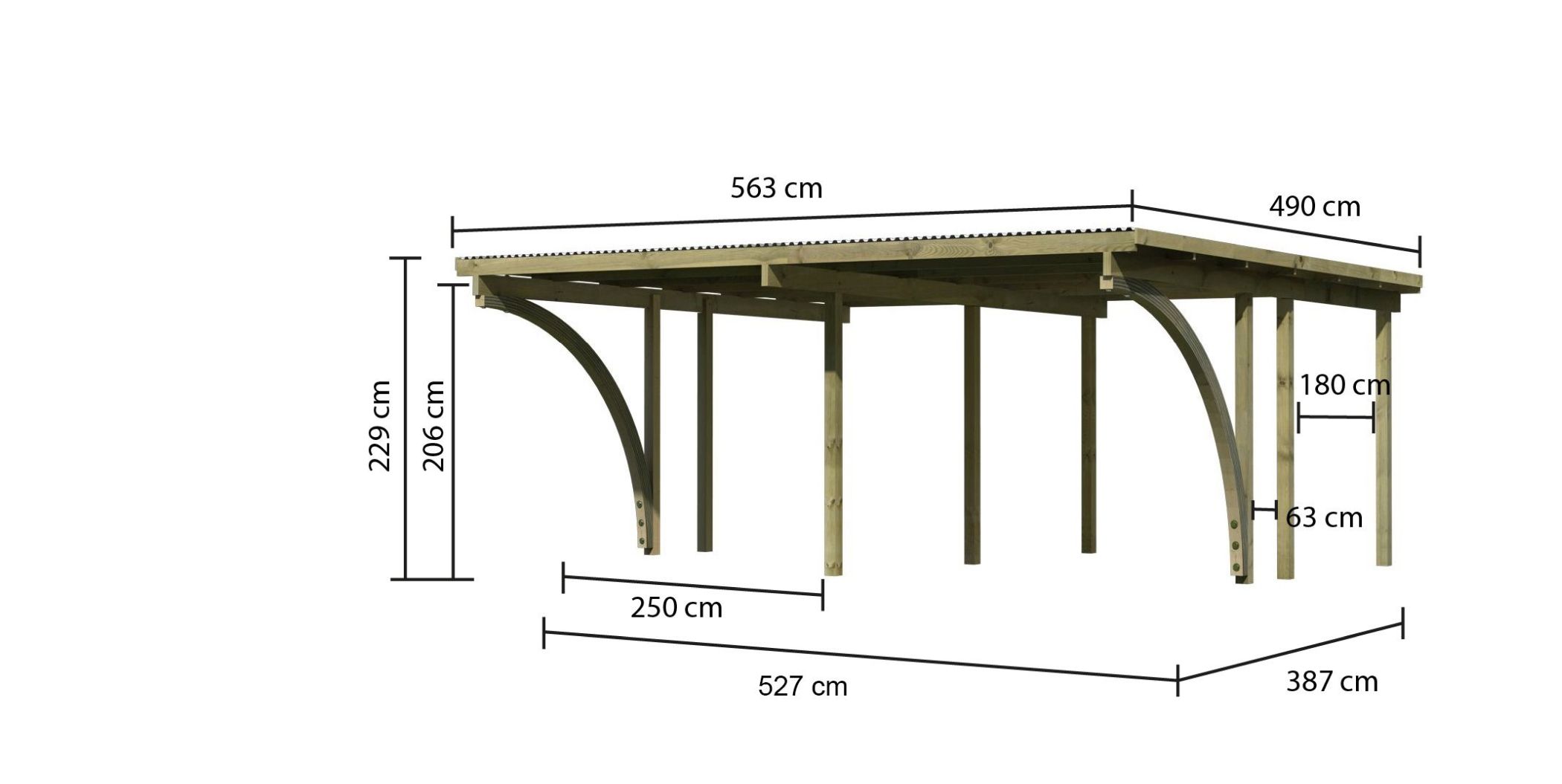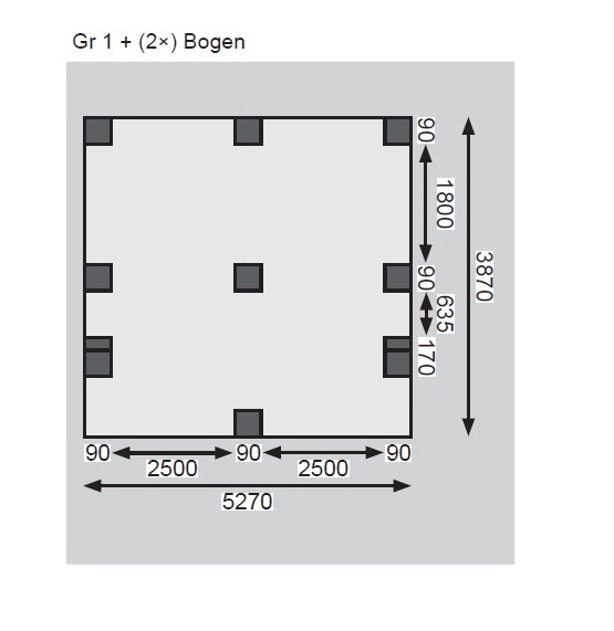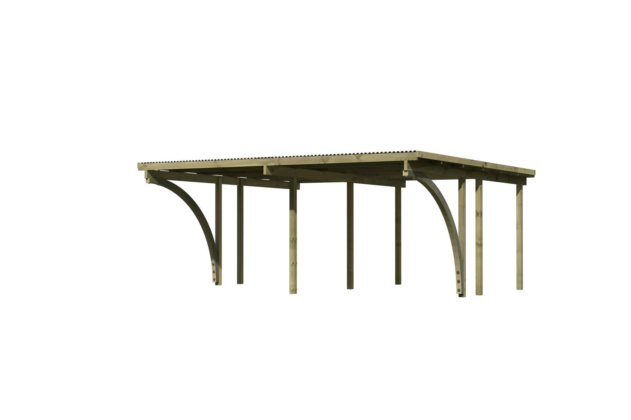 Eine Unterstellmöglichkeit, bei der gleich beide Autos geschützt sind? Dies ermöglicht Ihnen das Doppelcarport ECO 1. Vorbei ist die Zeit in der eines Ihrer Autos unter dem Carport parken konnte und der Zweitwagen ohne Schutz da stand. Nun erhalten beide den idealen Schutz vor der Witterung. Durch das schützende Dach wird ein starkes Aufheizen des Wageninneren verhindert und auch das Freikratzen der Scheiben kann mit einem Carport deutlich reduziert werden. Mit einem Außenmaß von (B x T x H) 509 x 387 x 229 cm bietet dieses genügend Platz. Eine Stellfläche hat die Breite von 250 cm und hat bestimmt auch für Ihr Auto ausreichend Platz. Das Set beinhaltet zwei Einfahrtsbögen. So ist auch das Einparken von der Seite kein Problem mehr. Das Flachdach des Carports hat eine Dachneigung von 1°und besteht aus einer 0,8 mm starken Dacheindeckung aus grauen PVC-Trapezprofilen. Getragen wird die Konstruktion von 9 x 9 cm starken Massivholzpfosten. Diese Pfosten sind kesseldruckimprägniert. Bei diesem Verfahren werden chemische Salze in das Holz gepresst, wodurch es Schutz vor der Witterung erhält und seine Lebensdauer verbessert wird. Gesichert wird Ihr Carport durch bereits im Set enthaltene H-Pfostenanker. So macht auch ein starker Wind dem Doppelcarport nichts aus. Schützen Sie Ihre Autos vor der Witterung mit dem Doppelcarport ECO 1.
