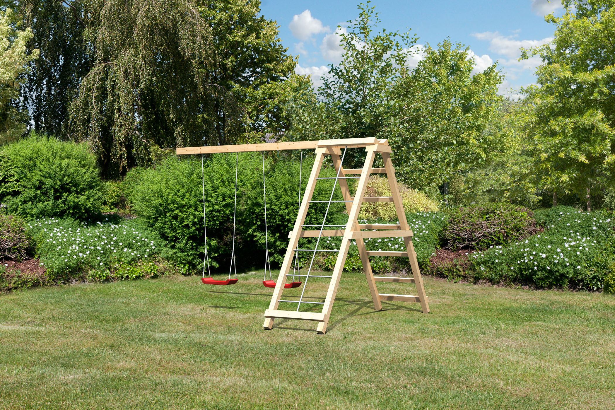 Durch den Doppelschaukelanbau mit Klettergerüst und Netzrampe können Ihre Kinder noch viel mehr toben und Spaß haben. Der Doppelschaukelanbau inkl. Klettergerüst und Netzrampe ist aus nordischer Fichte und in naturbelassen. Er hat die Maße B 308 cm x T 264 cm und eine Höhe von 213 cm. In der Lieferung enthalten sind alle Beschläge, eine Doppelschaukel, zwei rote Schaukelsitze, eine Netzrampe und eine Holzleiter.