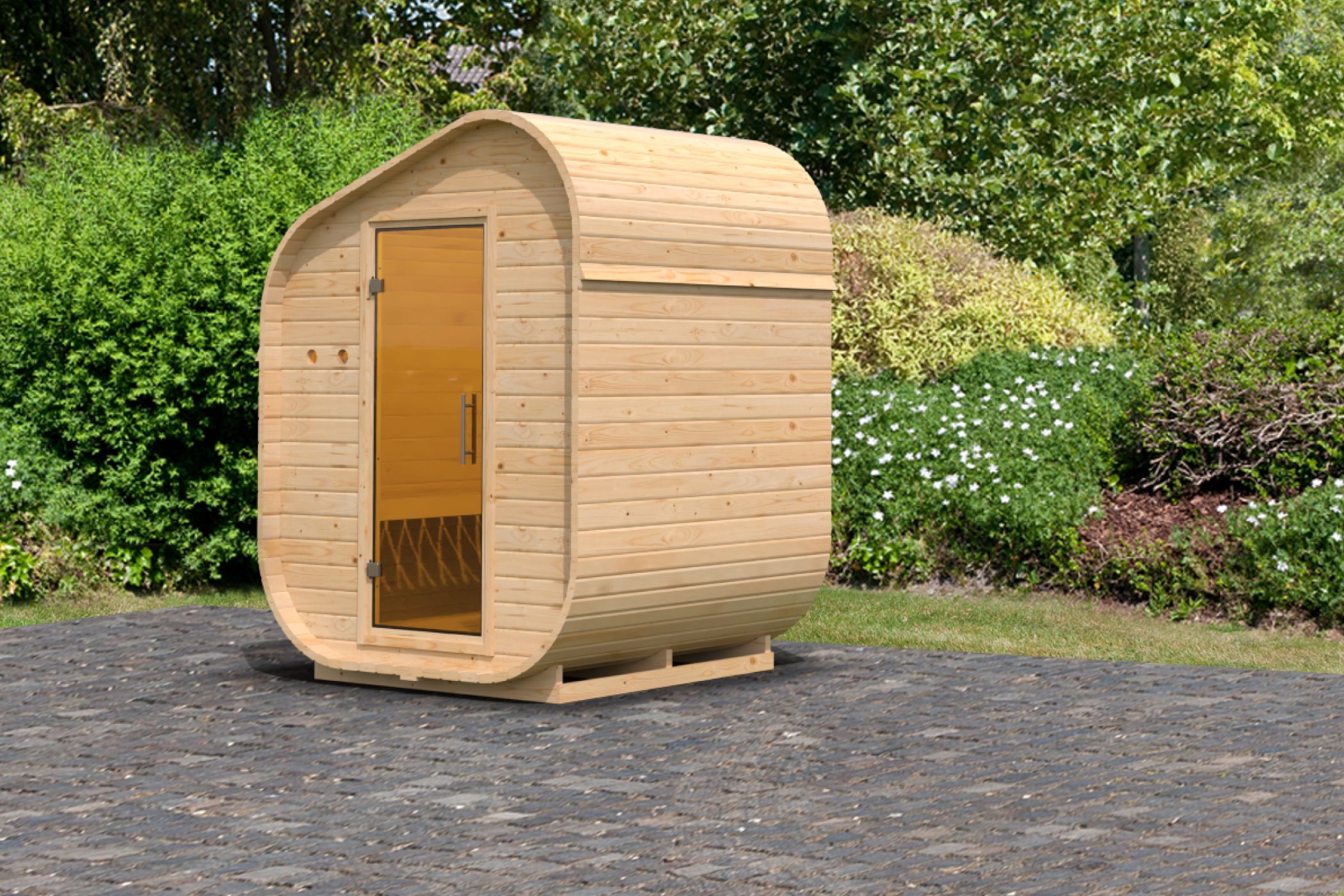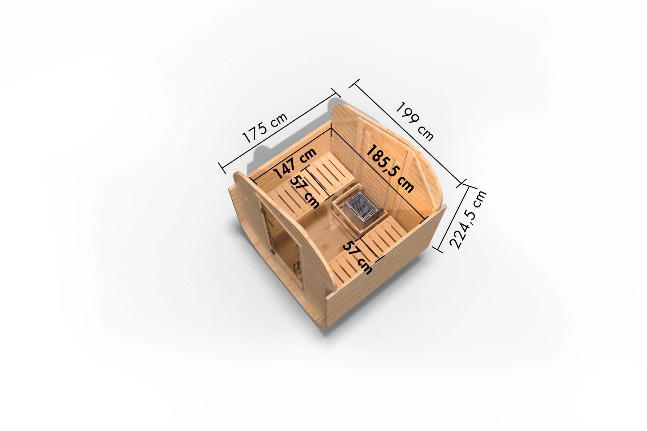 Unser Saunahaus besteht aus hochwertigen 38 mm dicken Wandbrettern aus Fichtenholz, welches im hohen Norden Europas wächst. Die Montage wird im Steck-/Schraubsystem vorgenommen. Dies bedeutet, dass die Wandbretter an senkrechten Eckpfosten montiert werden und somit ein schneller und einfacher Aufbau gewährleistet wird. Das Außenmaß von 199 cm x 175 cm sorgt für ausreichende Platzverhältnisse bei Ihrem Saunagang. Unterstrichen wird dieses Maß von den Abmessungen des Saunaraums mit 185,5 cm x 147 cm. Für die nötige Entspannung sorgen 2 Saunabänke. Von wegen innere Werte: auch von außen punktet unser Saunahaus mit Qualität und durchdachten Lösungen. Das hochwertige Tonnendach aus Massivholz sorgt dafür, dass Sie in der Sauna auch langfristig einen kühlen Kopf bewahren können. Das Thema konstruktiver Holzschutz wird mit einem Dachüberstand von 100 / 30 / 100 ausreichend berücksichtigt. So bleiben Türen und Wandbretter optimal geschützt. Unterhalb des Hauses sorgen unsere kesseldruckimprägnierten Bodenbalken in Verbindung mit dem mitgelieferten Massivholzboden für ausreichenden Schutz vor Staunässe oder aufsteigende Feuchtigkeit. Im Bereich der Sauna haben wir eine zusätzliche Zwischendecke eingezogen, wie Sie sie von unseren Innensaunen kennen. Eine massive Rahmenkonstruktion aus Vierkanthölzern mit einer eingearbeiteten Mineralwolldämmung sorgt dafür, dass die Hitze da bleibt, wo sie sein soll - nämlich im Saunaraum. Darüber hinaus sorgt die eingezogene Zwischendecke mit dem Softline-Profilholz für einen optisch schönen Abschluss.