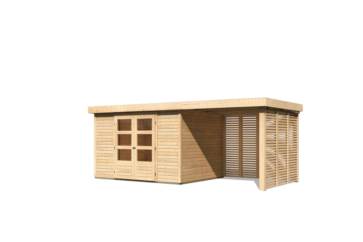 Karibu großes Gerätehaus “Askola 5” Flachdach mit Anbau/Terrasse modern aus Holz in Natur