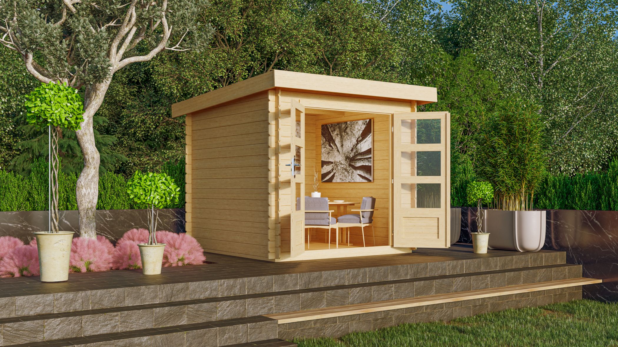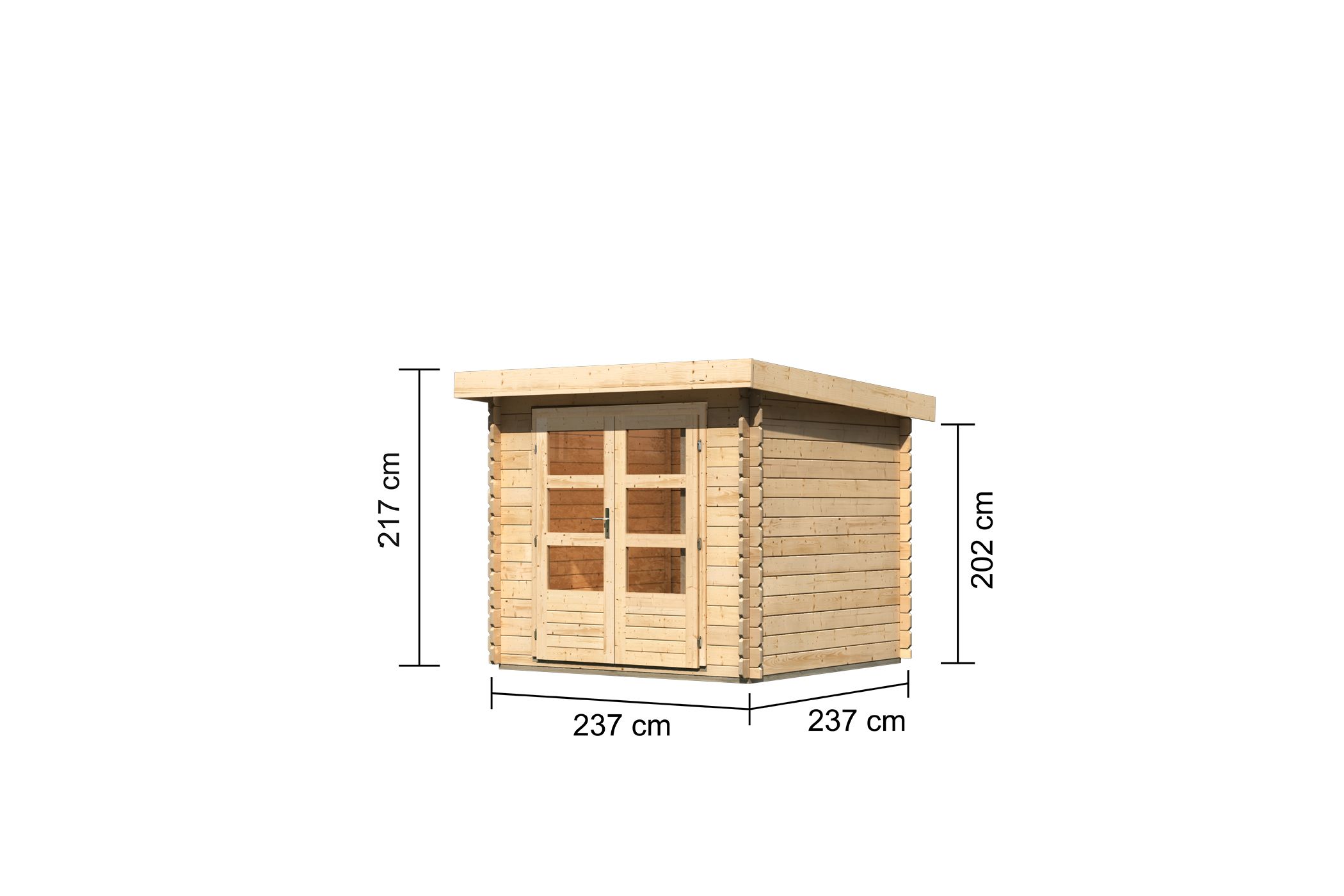 Das moderne Blockbohlenhaus mit Pultdach. Das Bastrup 2 mit 28 mm starken Bohlen besteht aus nordischem Fichtenholz. Ein großer Vorteil dieser Serie ist die patentierte 6-Plus-Eckverbindung. Zusammen sorgt dies nicht nur für eine langlebige, stabile Konstruktion, sondern auch für ein robustes Gesamtbild. Das macht das Gartenhaus Bastrup mit einem Außenmaß von (BxT) 237 x 237 cm zu einem langen, treuen und festen Begleiter im eigenen Garten. Einmal aufgebaut und eingerichtet ist das Haus nicht mehr wegzudenken. In das Innere gelangen Sie durch eine großzügige Doppelflügeltür mit drei Lichtausschnitten je Türflügel. Gesichert wird das Haus mithilfe eines Zylinderschlosses in der Tür. Durch die Lichtausschnitte gelangt Tageslicht in den Innenbereich und lässt das Haus somit nicht nur von außen strahlen. Das Gartenhaus ist in Naturbelassen erhältlich und kann durch ein optional erhältliches Anbaudach in der Breite 2 m oder 3 m im Außenbereich erweitert werden. Dies lässt viel Platz für Ihre Gestaltungsideen. Verstauen Sie zum Beispiel Ihre Gartengeräte im Inneren des Häuschens, um Ihren Garten nach getaner Arbeit ordentlich zu hinterlassen oder nutzen Sie den Innenbereich zur Lagerung Ihrer Gartenmöbel im Winter. Der zusätzliche Platz unter dem Anbaudach kann im Sommer als Schutz vor der Witterung für eine gemütliche Sitzgruppe dienen. Bereichern Sie Ihren Garten mit dem modernen Blockbohlenhaus Bastrup 2.