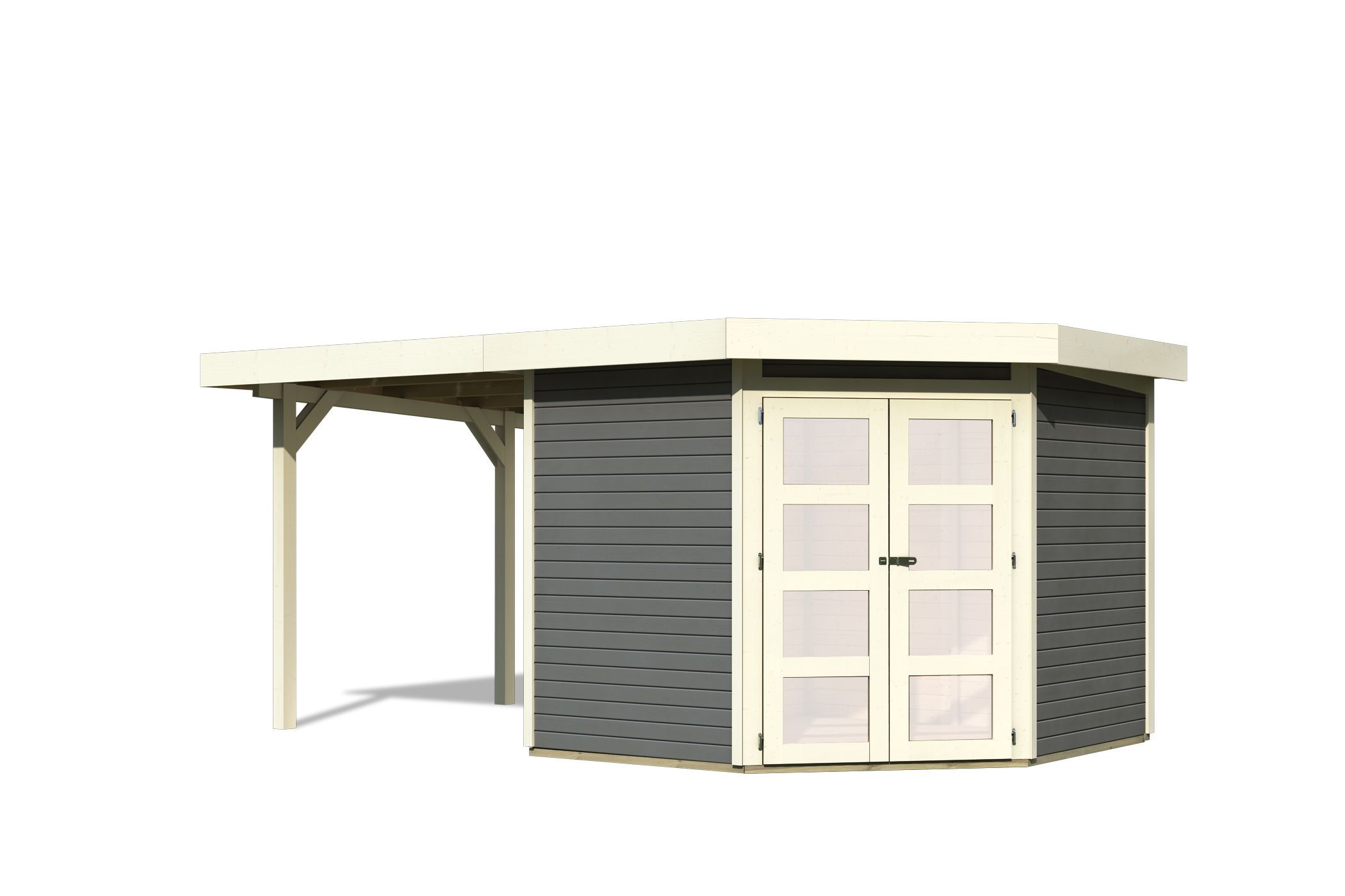 Unser Flachdach mit interessantem Grundriss. Ein Fünfeckhaus, welches das Ambiente Ihres Gartens abrundet? Ein echter Hingucker in einem sonst schlichten Umfeld? Das ist mit dem Gartenhaus Goldendorf 5 möglich. Gestalten Sie sich in Ihrem Garten Ihren eigenen Rückzugsort. Entspannen Sie in dem 234 x 238 cm großen Innenraum mit einem Buch oder genießen Sie die ersten Sonnenstrahlen unter dem optional erhältlichen Vordach. Das Gartenhaus Goldendorf ist in Terragrau erhältlich. Das moderne Terragrau mit Akzenten in elfenbeinweiß, schafft das gewisse Etwas in Ihrem Garten. Durch den integrierten Holzschutz erleichtern Sie sich die Arbeit und können direkt mit dem Aufbau beginnen. So ist für jeden garantiert das Richtige dabei. Das Innere des Gartenhauses erreichen Sie durch eine Doppelflügeltür mit vier Lichtausschnitten in Milchglasoptik, welche durch eine Sicherheitsüberfalle gleichzeitig vor unbefugtem Betreten schützt. Auch der Platz im Inneren kann frei nach den eigenen Wünschen eingerichtet werden. Egal ob mit einem gemütlichen Sofa oder einer Werkbank. Das Gartenhaus Goldendorf 5 passt sich den Vorstellungen an. Nutzen Sie die Ecke Ihres Gartens mit dem Fünfeckhaus Goldendorf 5.