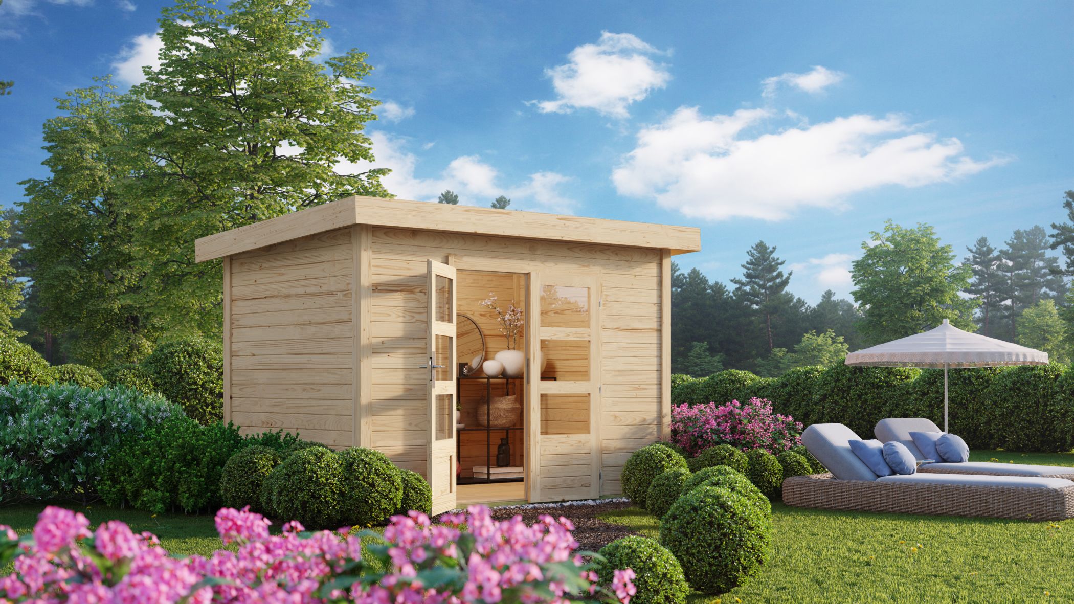 Das Gartenhaus Kandern 2, ein attraktives Pultdach in zwei Farben. Das 28 mm Pultdachhaus aus nordischem Fichtenholz mit Steck-/Schraubsystem ist sowohl in Terragrau, als auch in Naturbelassen erhältlich. Eine große Besonderheit ist das feststehende Oberlichtfenster mit den Maßen (BxH) 199,5 x 18,6 cm. Durch dieses und durch die Lichtausschnitte in der Tür fällt viel Tageslicht in den Innenraum und sorgt für eine natürliche Lichtquelle. So eignet sich das Haus nicht nur als Unterstellmöglichkeit, sondern auch als gemütlicher, geschützter Raum im eigenen Garten. Im Außenbereich lässt sich das Gartenhaus Kandern durch ein optionales Anbaudach erweitern und bietet somit noch mehr Platz für mehr Gestaltungsideen. So können Sie Ihre Gartengeräte, Möbel oder ähnliches schnell und einfach vor der Witterung schützen und haben noch länger Freude an ihnen. Auch das Haus überzeugt dank der 28 mm starken Wandbohlen mit seiner Langlebigkeit. Die Doppelflügeltür mit drei Lichtausschnitten je Türflügel und Buntbartschloss schützt das Gartenhaus vor unbefugtem Eindringen. Das Dach des Gartenhauses mit einer Dachfläche von 6,3 m² können Sie effektiv mit unserer optional erhältlichen selbstklebenden Dachfolie vor Witterungseinflüsse schützen. Ihre Gegenstände im Hausinneren werden von unten durch einen optional erhältlichen Fußboden und durch im Lieferumfang enthaltene kesseldruckimprägnierte Bodenbalken geschützt. Gestalten Sie Ihren Garten stilvoll mit dem attraktiven Pultdachhaus Kandern 2.