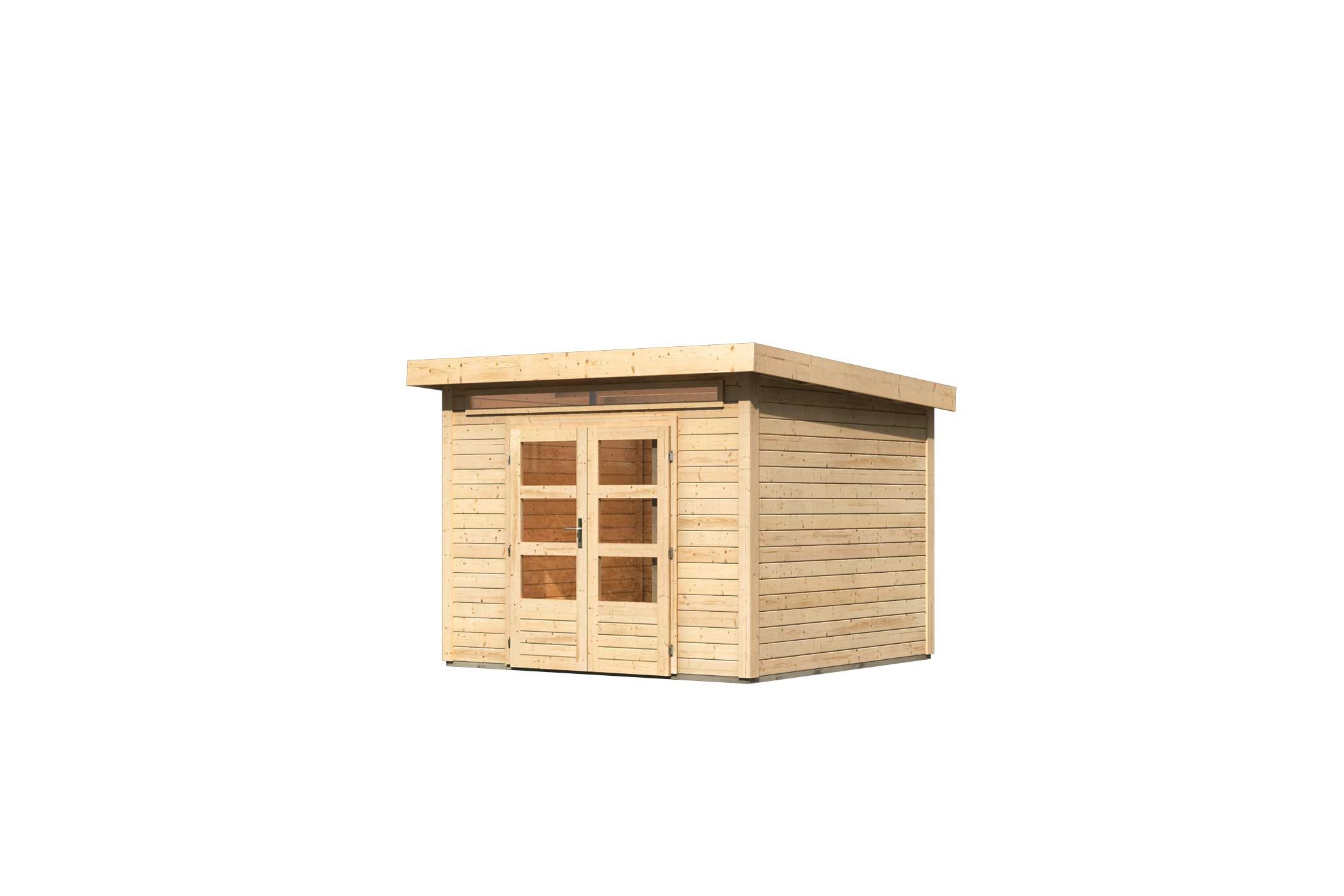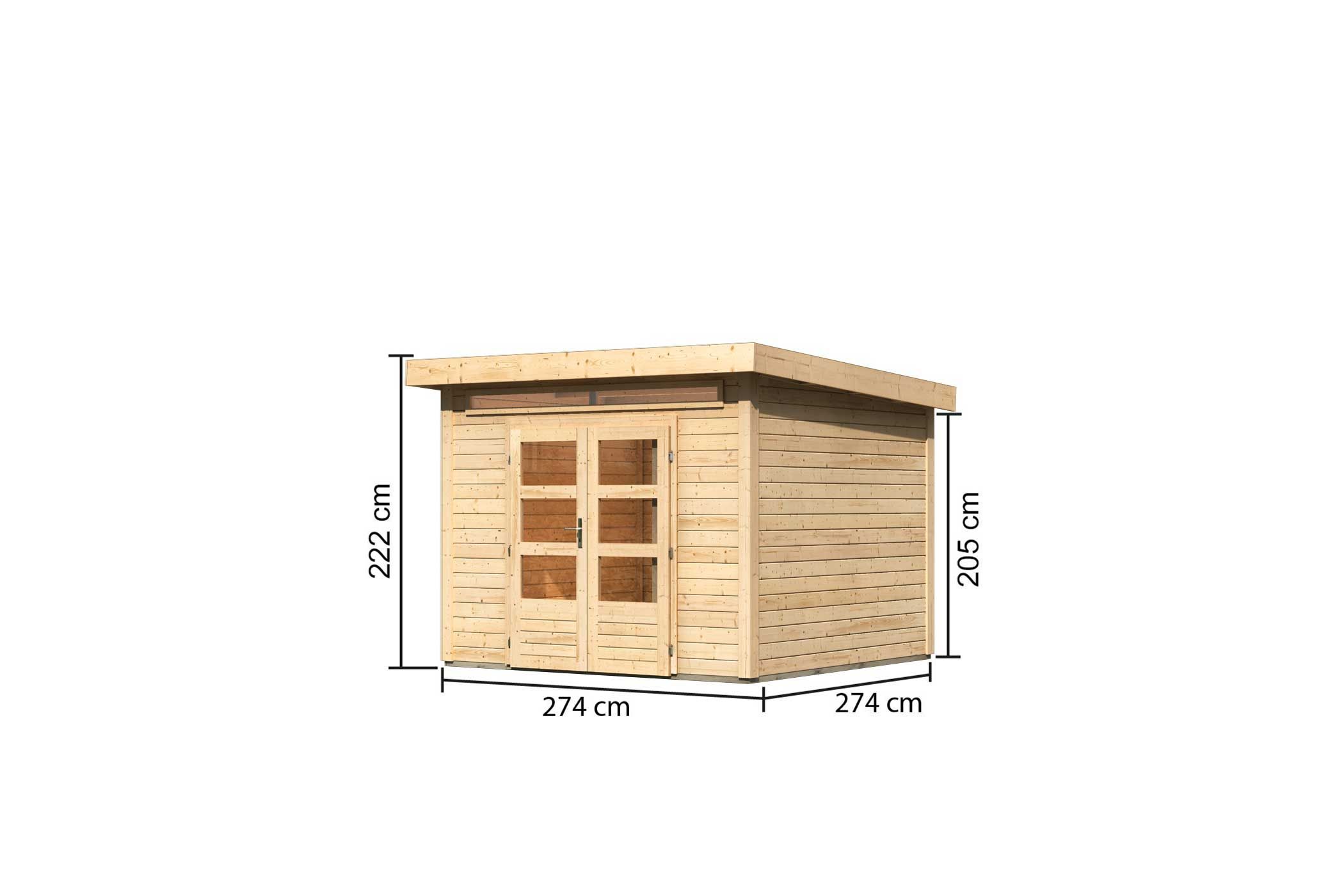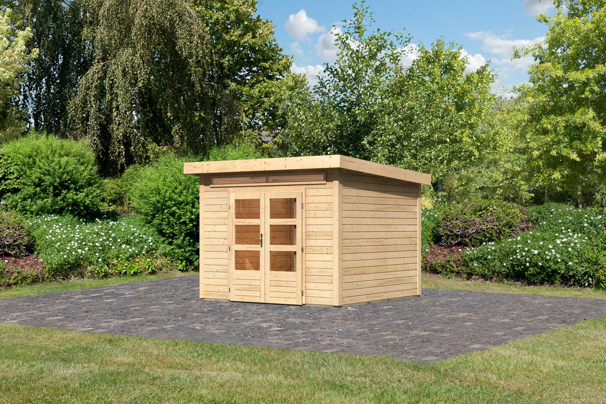 Das Gartenhaus Kandern 6, ein attraktives Pultdach in drei Farben. Das 28 mm Pultdachhaus aus nordischem Fichtenholz mit Steck-/Schraubsystem ist sowohl in Terragrau, als auch in Naturbelassen erhältlich. Eine große Besonderheit ist das feststehende Oberlichtfenster mit den Maßen (BxH) 230 x 18,5 cm. Durch dieses und durch die Lichtausschnitte in der Tür fällt viel Tageslicht in den Innenraum und sorgt für eine natürliche Lichtquelle. So eignet sich das Haus nicht nur als Unterstellmöglichkeit, sondern auch als gemütlicher, geschützter Raum im eigenen Garten. Im Außenbereich lässt sich das Gartenhaus Kandern durch ein optionales Anbaudach erweitern und bietet somit noch mehr Platz für mehr Gestaltungsideen. So können Sie Ihre Gartengeräte, Möbel oder ähnliches schnell und einfach vor der Witterung schützen und haben noch länger Freude an ihnen. Auch das Haus überzeugt dank der 28 mm starken Wandbohlen mit seiner Langlebigkeit. Die Doppelflügeltür mit drei Lichtausschnitten je Türflügel und Buntbartschloss schützt das Gartenhaus vor unbefugtem Eindringen. Das Dach des Gartenhauses mit einer Dachfläche von 9 m² können Sie effektiv mit unserer optional erhältlichen selbstklebenden Dachfolie vor Witterungseinflüsse schützen. Ihre Gegenstände im Hausinneren werden von unten durch einen optional erhältlichen Fußboden und durch im Lieferumfang enthaltene kesseldruckimprägnierte Bodenbalken geschützt. Gestalten Sie Ihren Garten stilvoll mit dem attraktiven Pultdachhaus Kandern 6.