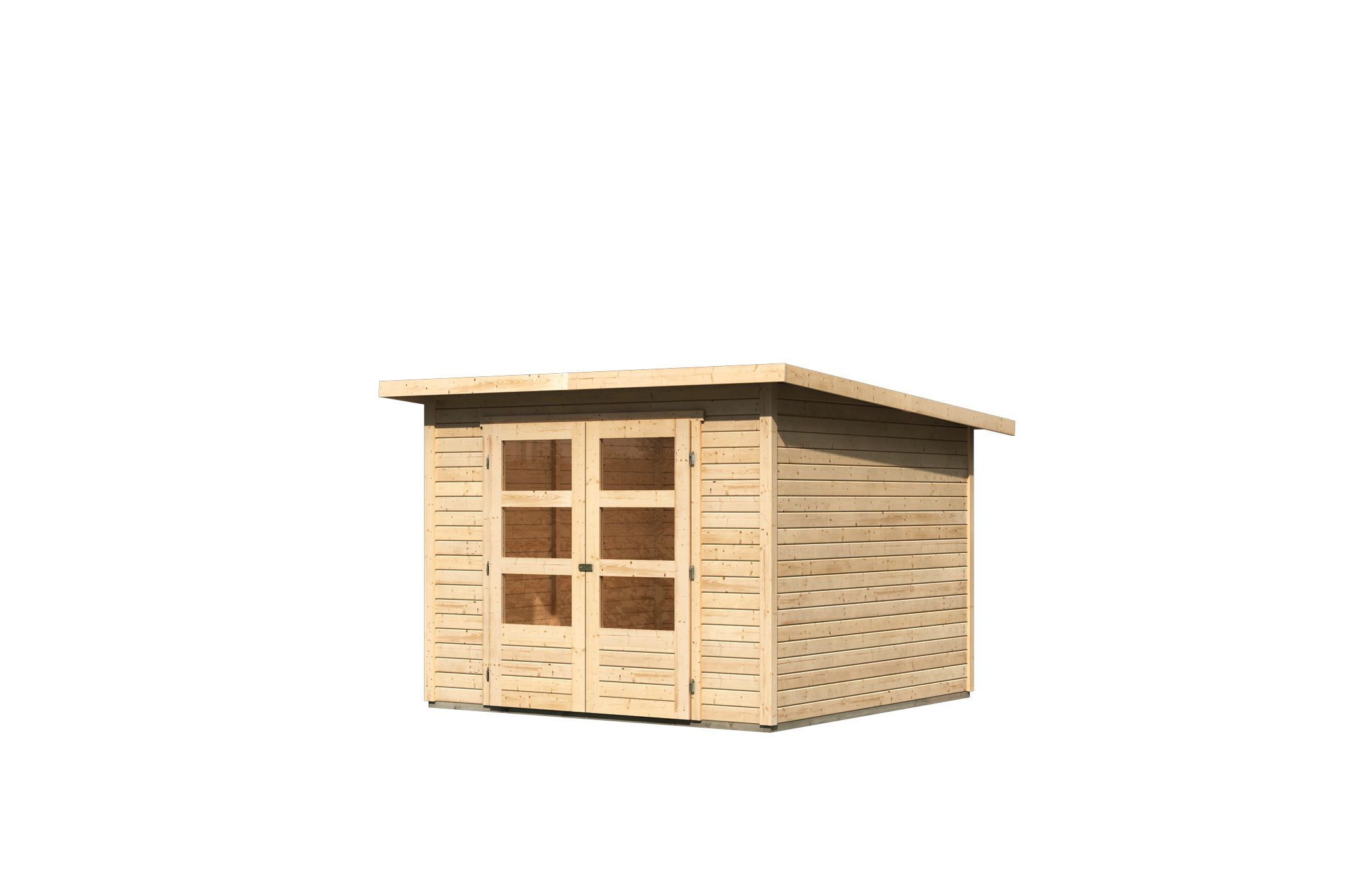 Das Gartenhaus Stockach 4 ist der Hingucker in Ihrem Garten. Das 19mm Haus überzeugt durch sein modernes Pultdach mit einer Dachfläche von 7,8 m² und den unkomplizierten Look. Dadurch hat es kein Problem sich in seine Umgebung einzufügen und passt bestimmt auch in Ihr Gartenambiente. Das Gartenhaus besteht aus nordischem Fichtenholz und wird mithilfe eines Steck- und Schraubsystems aufgebaut. Dies ermöglicht eine einfache und schnelle Montage ohne großes handwerkliches Geschick. Das Haus ist in modernem Terragrau, Schwarz und in Naturbelassen zur eigenen Gestaltung erhältlich. So bleibt es bei Ihnen wie Sie Ihr Gartenhaus Stockach gestalten und einrichten. In das Innere des Gartenhauses gelangen Sie durch eine Doppelflügeltür mit drei Lichtausschnitten pro Türflügel. Gesichert wird das Haus mit eine Sicherheitsüberfalle. Durch die Lichtausschnitte gelangt viel Tageslicht ins Innere und lässt das Haus somit nicht nur von außen strahlen. Mit einem Außenmaß von (BxT) 246 x 246 cm bietet es viel Platz für Ihre Gartenmöbel oder Gartengeräte. Das Gartenhaus wird durch kesseldruckimprägnierte Bodenbalken vor aufsteigender Feuchtigkeit geschützt. Ob als Rückzugsort im eigenen Garten oder als Unterstellmöglichkeit für Gartengerät, dass Gartenhaus Stockach 4 bietet Ihnen viele Möglichkeiten.