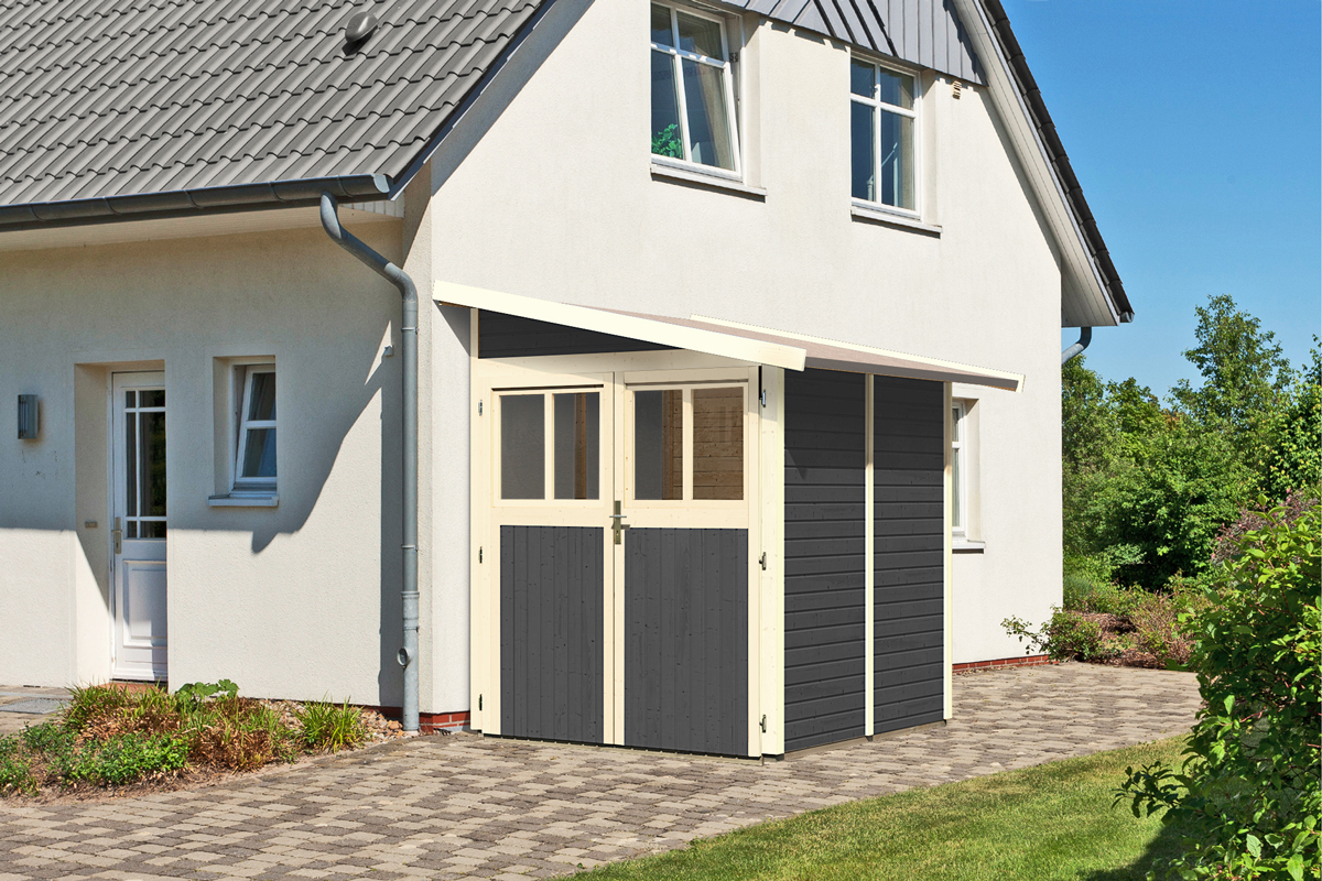 Das Gartenhaus Wandlitz 2 bietet für kleine Gärten die optimale Lösung. Da das 19 mm Gartenhaus an die Hauswand gestellt wird, verschenkt es keine Nutzfläche im Garten. Diese kann so zum Toben der Kleinen oder für eine gemütliche Hollywoodschaukel verwendet werden. Verstauen Sie Ihre Gartengeräte, wie den Rasenmäher, die Schubkarre oder die Gießkanne, im Gartenhaus Wandlitz und schützen Sie diese vor der Witterung. Auch das Lagern der Gartenmöbel im Winter ist möglich. So bleibt Ihr Garten ordentlich und Sie können das Ambiente noch mehr genießen. Mit einer Außenmaßbreite von 181 cm passt es bestimmt auch neben Ihr Haus. Die Außenmaßtiefe von 181 cm bietet ausreichend Platz für Ihre Gegenstände. Durch die vier verschiedenen Größen lässt sich das Gartenhaus ideal auf Ihre Vorstellungen anpassen. Dies ermöglicht auch die Gestaltung einer kleinen Werkstatt im Außenbereich. Das Pultdachhaus mit einer Dachfläche von 4,9 m² und die Doppelflügeltür mit einem Lichtausschnitt je Türflügel runden die Optik ab. Durch ein optional erhältliches zusätzliches Türelement lässt sich das Haus von beiden Seiten betreten und kann so auch als Durchgang in den Garten dienen. Das Gartenhaus ist in Naturbelassen und Terragrau erhältlich. Das Gartenhaus Wandlitz 2, eine smarte Alternative zum klassischen Gartenhaus.