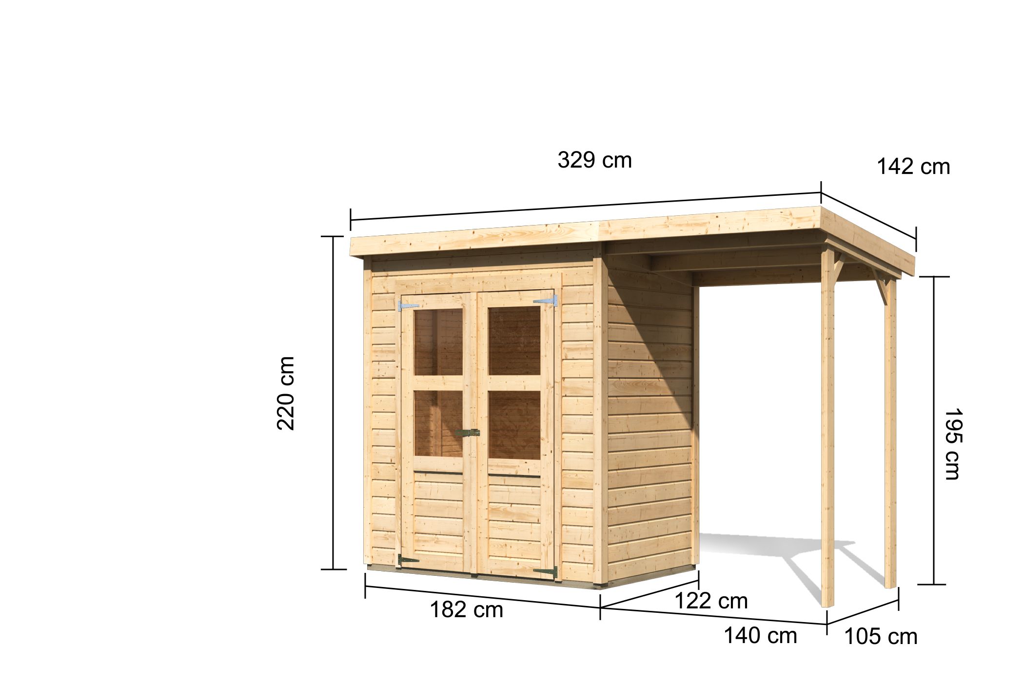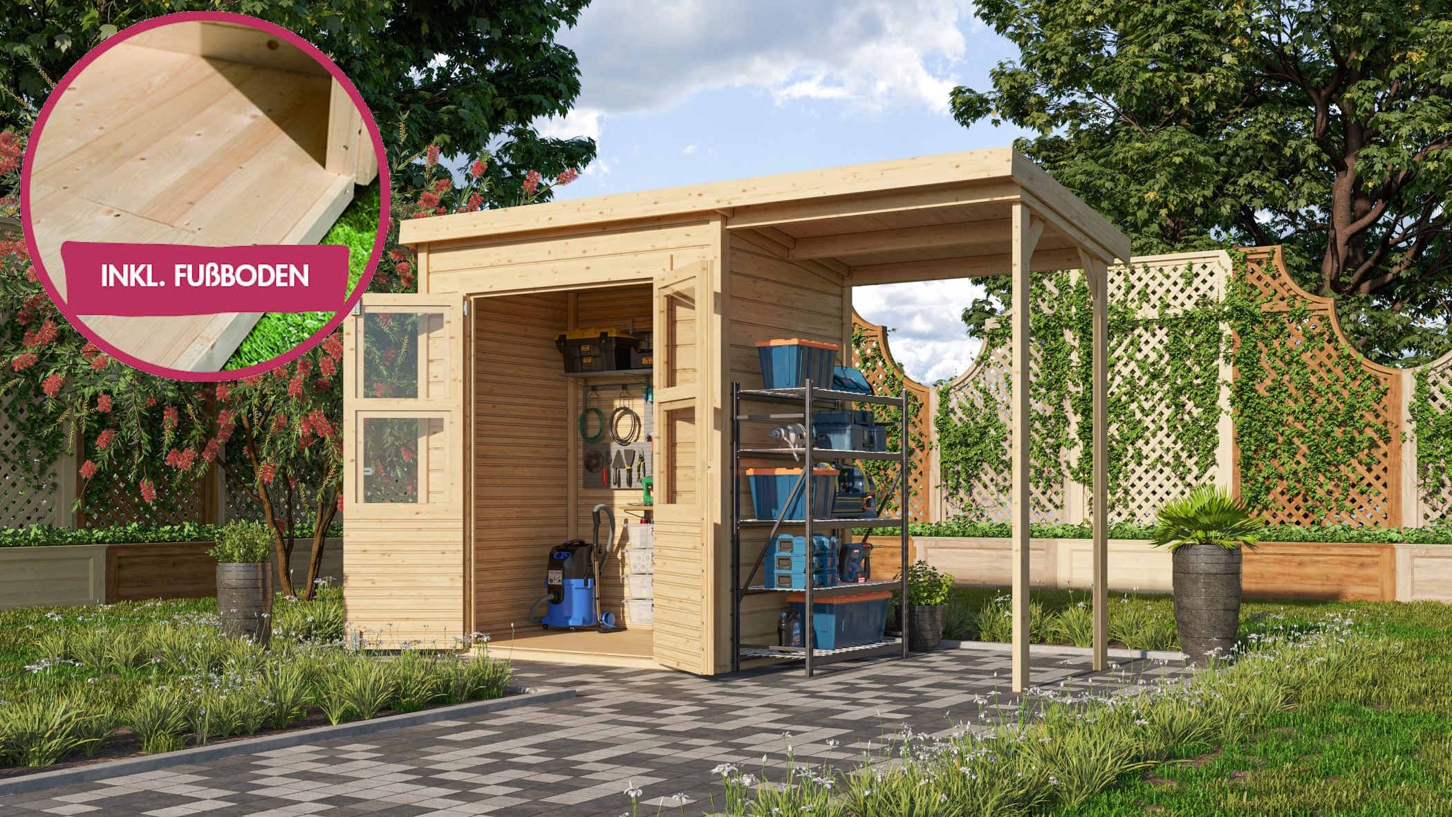 Das Gartenhaus mit optionalem Anbau. Ein Gartenhaus zum Verstauen der Gartengeräte und ein schützendes Dach für das Spielzeug Ihrer Kleinen oder als Unterstand für Fahrräder. Diese und noch viele weitere Möglichkeiten bietet das Gartenhaus Mollie A. Durch sein naturbelassenes Holz kann es durch einen farblich individuellen Anstrich auf Ihr Gartenambiente abgestimmt werden. Das Gartenhaus Mollie A setzt Ihnen hier keine Grenzen. Der Innenraum mit den Maßen (BxT) 175 x 119 cm, bietet ausreichend Platz für Ihre Gegenstände. Das Haus wird von unten mit kesseldruckimprägnierten Bodenbalken geschützt. Von oben bietet das Pultdach Schutz vor der Witterung. Die Doppelflügeltür mit zwei Lichtausschnitten je Türflügel und einer Sicherheitsüberfalle lässt viel Tageslicht in das Innere und bietet so eine natürliche Lichtquelle. Reicht Ihnen der Platz im Inneren nicht aus können Sie das Gartenhaus Mollie A mit einem optional erhältlichen Anbaudach erweitern. Das Anbaudach hat eine Breite von 144cm und eignet sich ideal als Unterstellmöglichkeit für größere Gegenstände. Das Gartenhaus Mollie A - ein Gartenhaus mit optionalem Anbau.