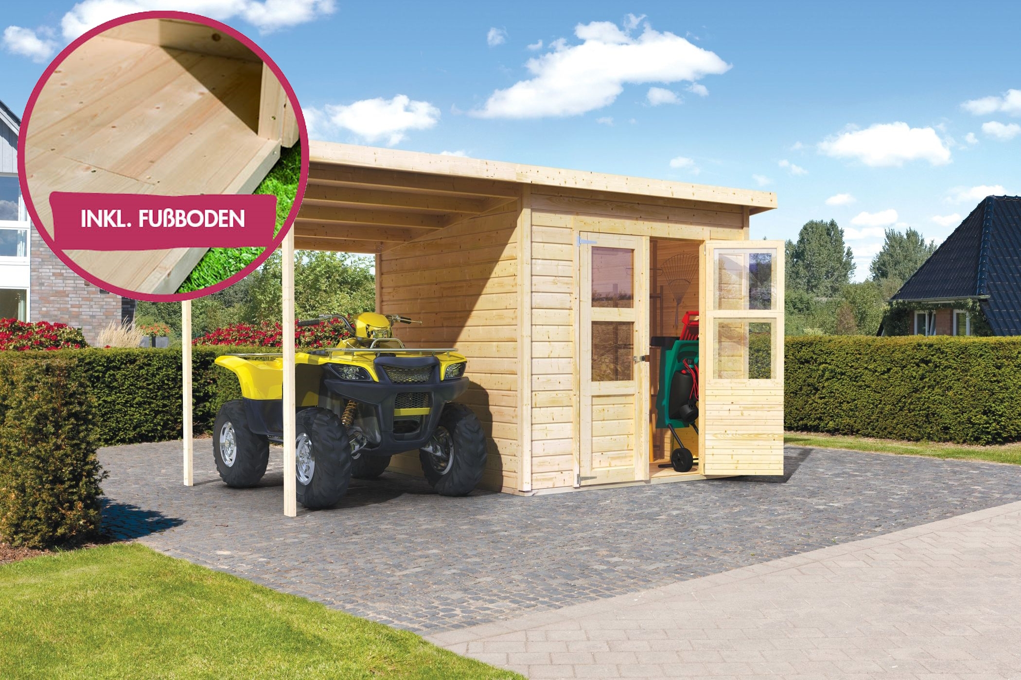 Das Gartenhaus Mollie C bietet ideal mit den Maßen von (BxT) 205 x 208 cm einen Ort um Ihre Gartengeräte oder aber die Spielzeuge der Kinder zu verstauen. Wenn dieser Platz jedoch nicht reichen sollte, können Sie optional noch das 166 cm breite Anbaudach sowie eine optional erhältliche Rückwand erwerben. Dieses könnte als Unterstand für Ihre Fahrräder dienen oder aber auch als kleine gemütliche Sitzecke genutzt werden, da es durch die Rückwand vor Wind und Wetter schützt. Das Haus kann durch sein naturbelassenes Holz von Ihnen einen individuellen Anstrich bekommen und somit sich in Ihr Garten perfekt integrieren. Vor der Witterung schützt das Pultdach, welches das Eindringen von Feuchtigkeit abhält. Für einen hellen und freundlichen Raum sorgt die moderne Doppelflügeltür die mit zwei Lichtausschnitten je Türflügel ausgestattet ist. Die Sicherheitsüberfalle ist zuständig für das unbefugte betreten Ihres Gartenhauses, womit Sie sich keine Sorgenn um das entwenden Ihrer Dinge machen müssen. Gestalten Sie das Gartenhaus Mollie C nach Ihren Wünschen und lassen Sie es ein Teil Ihres Gartens werden.