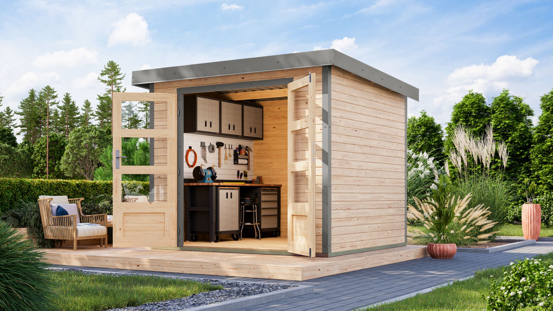 perfekte Vereinigung von Holz und Metall mit dem Hybrid-Gartenhaus von Karibu.