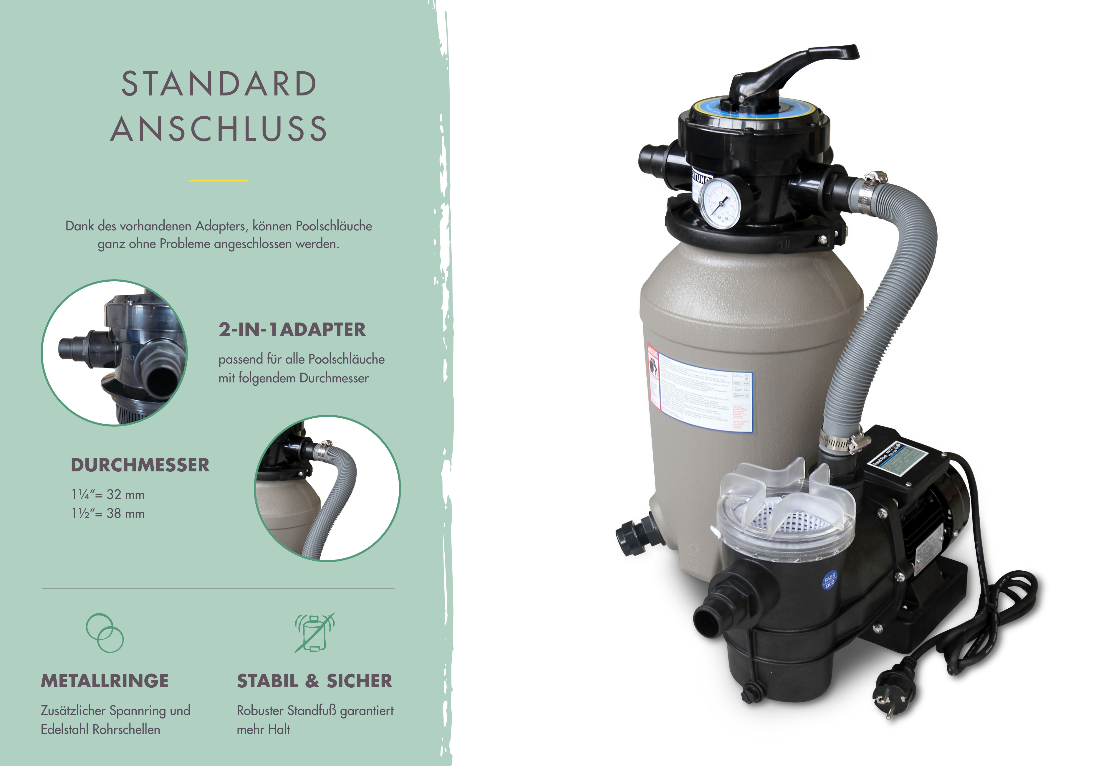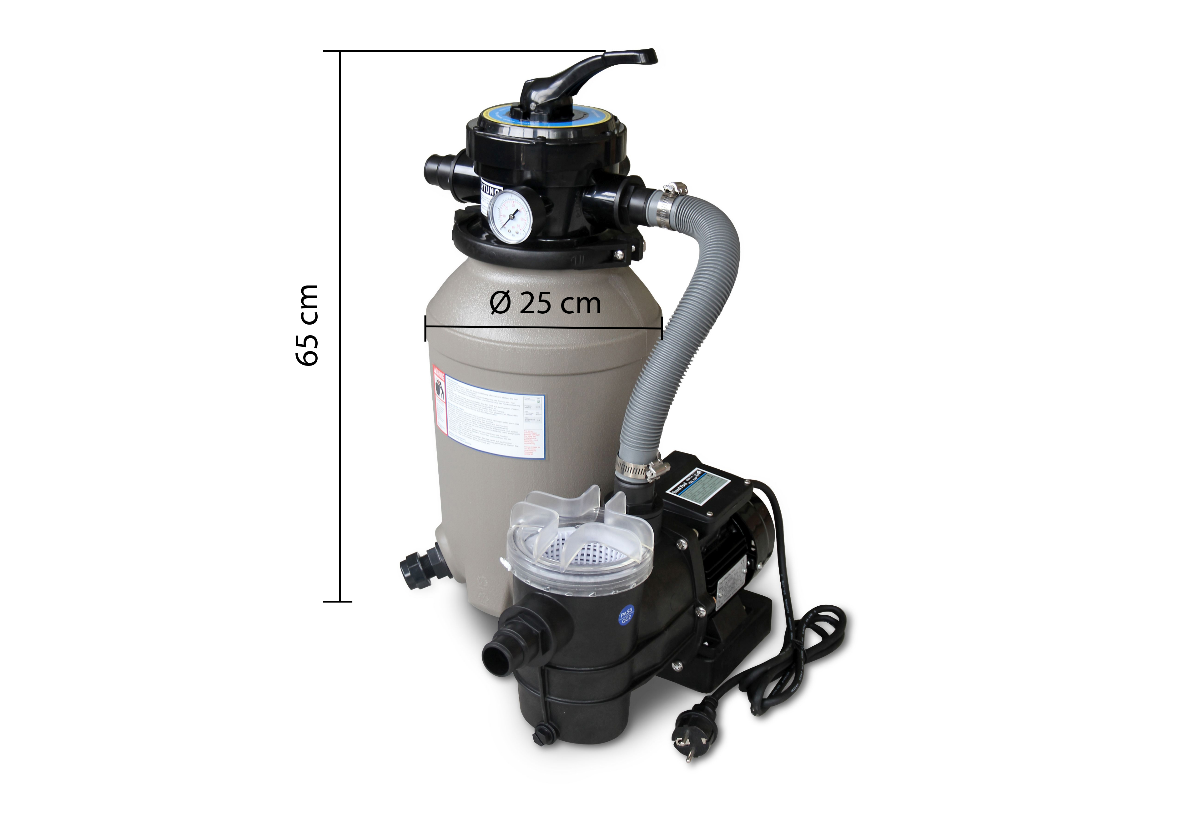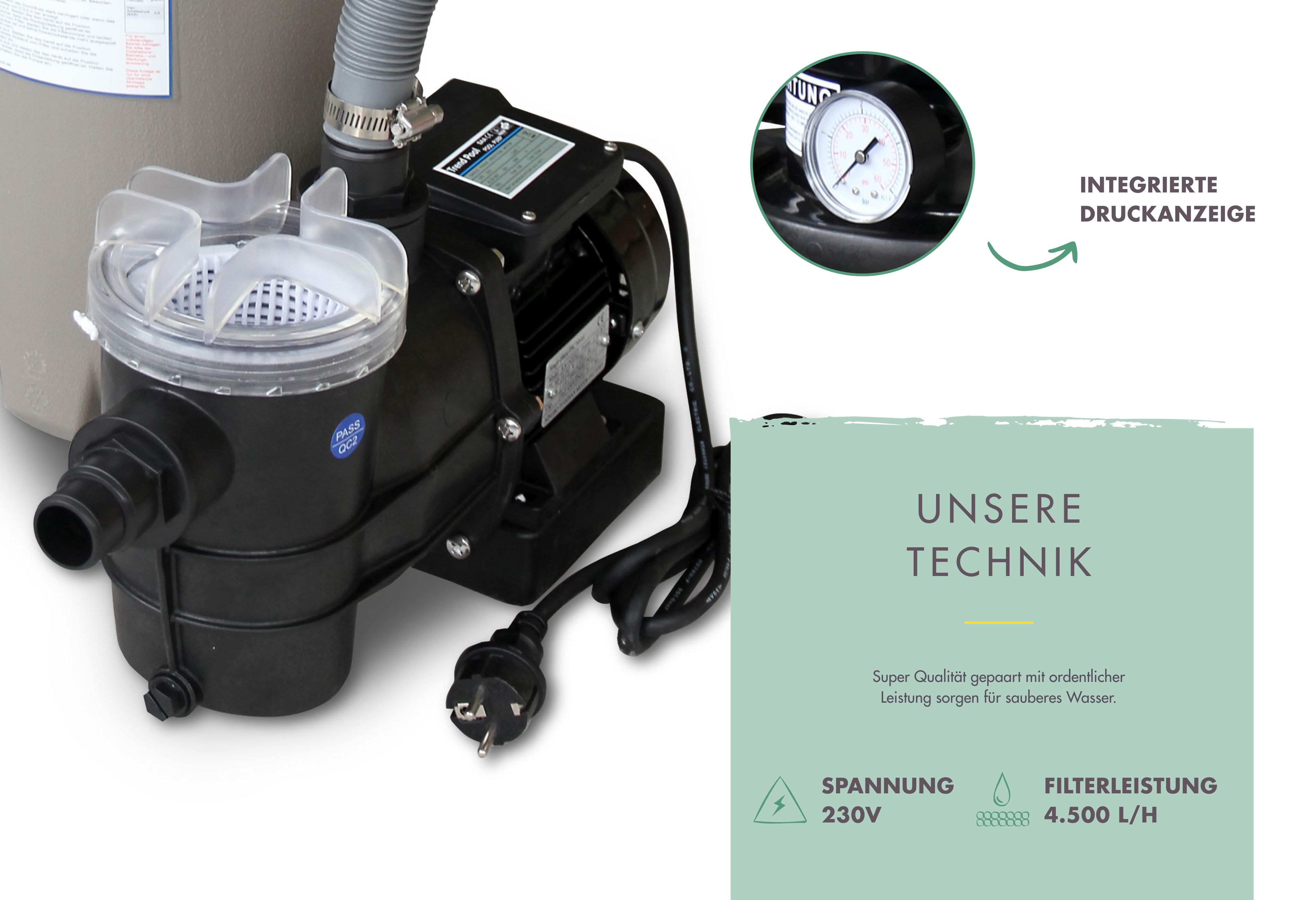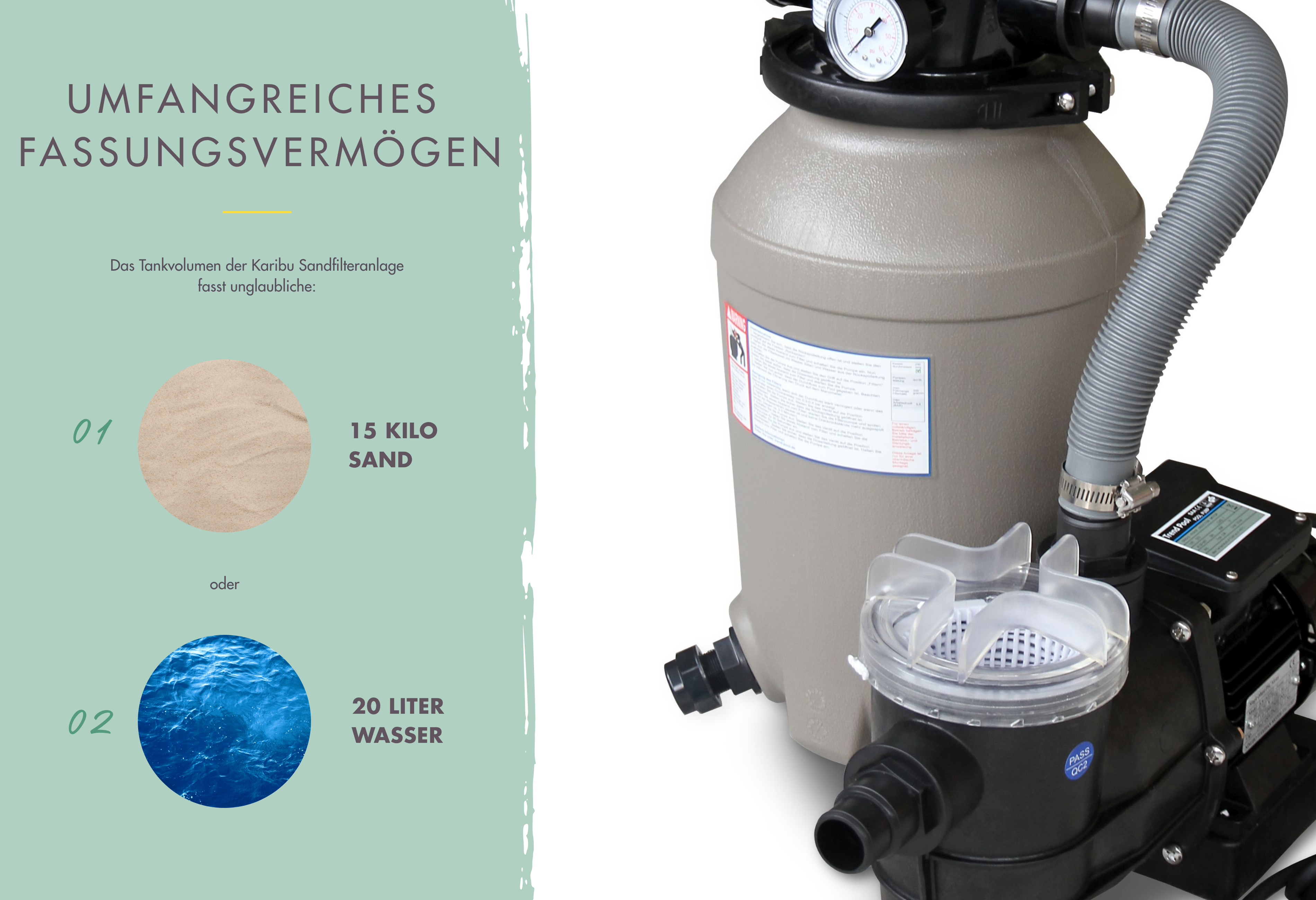 inkl. 25 kg Quarz FiltersandUm lange Freude an Ihrem Karibu-Pool zu haben ist die Pflege und Reinigung des Pools aber auch des Wassers äußerst wichtig. Mit unserer Filteranlage können Sie die Reinigung des Wassers jederzeit gewährleisten. Die Sandfilteranlage setzt sich aus einem Filterkessel mit einem Durchmesser von 30 cm, einem Anschlussschlauch und einer Pumpe zusammen. Die Pumpenleistung liegt im Normalbetrieb bei 7.500 l/h und im Filterbetrieb bei 4.500 l/h. Der Quarzsand wird in den Filterkessel gefüllt und reinigt das Wasser. Er ist feuergetrocknet und hat eine Körnung von 0,4 bis 0,8 mm. Das Wasser wird durch die Sandfilteranlage kontinuierlich und langsam gefiltert. Dies führt zu einer sehr hohen Wasserqualität. Die Pumpe wird über einen 230V-Anschluss angeschlossen. Halten Sie Ihren Pool sauber mit der Filteranlage klein.