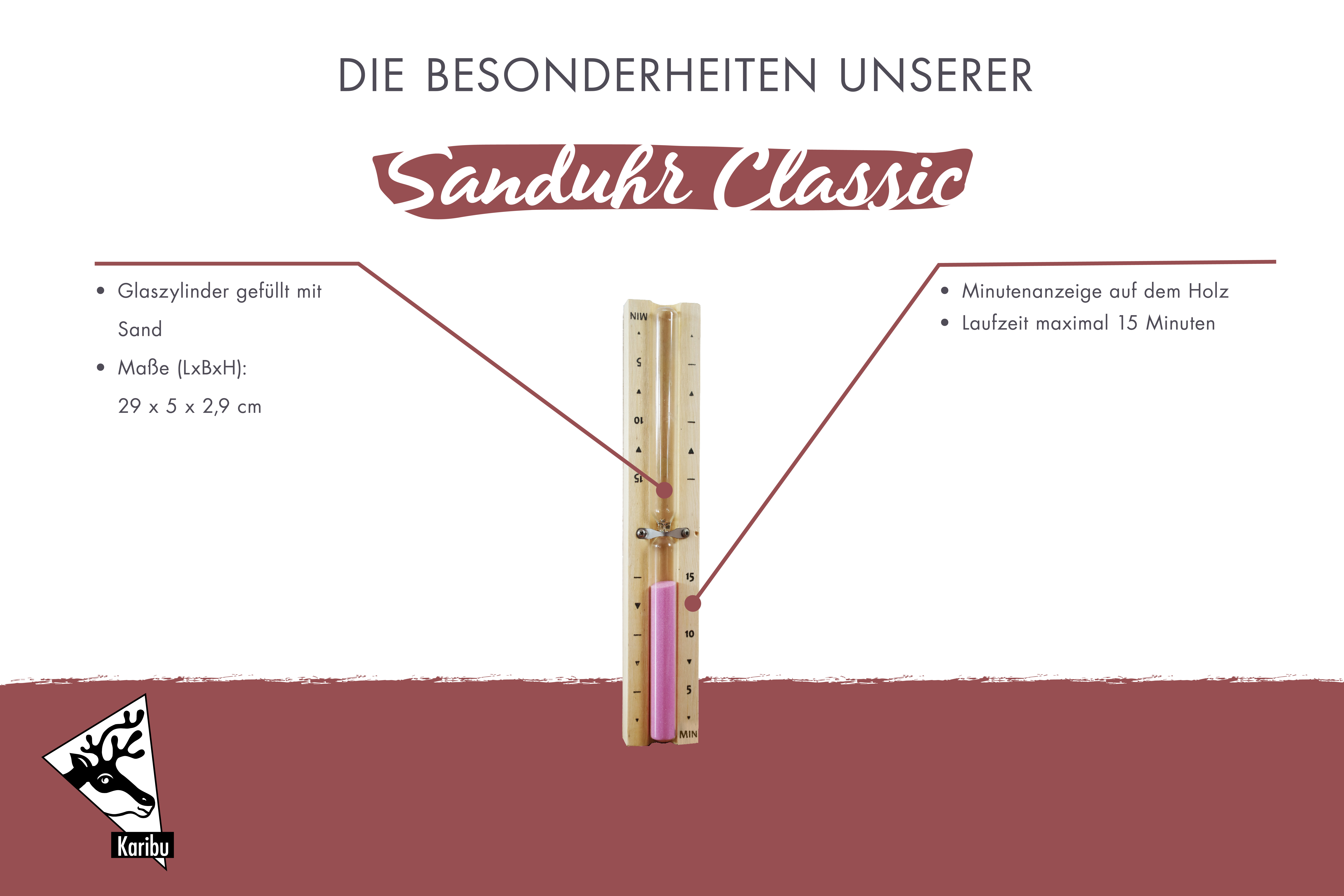Ein idealer Saunagang sollte mindestens 8 bis maximal 15 Minuten dauern, damit er seine Wirkung entfalten kann. Um die Zeit während des Saunierens immer im Blick zu haben, empfehlen wir unsere Sanduhr Classic. Sie gehört zu den Must-have´s für Saunazubehör. Die Sanduhr besteht aus einem Glaszylinder, welcher mit Sand gefüllt ist. Mithilfe einer Metallspange wird der Zylinder an einem Naturholz befestigt. Die Laufzeit der Sanduhr beträgt maximal 15 Minuten und hat ein Maß von (LxBxH) 29x5x2,9 cm. Lassen Sie die Zeit bei Ihrem perfekten Saunagang nicht aus den Augen mit der Sanduhr classic.