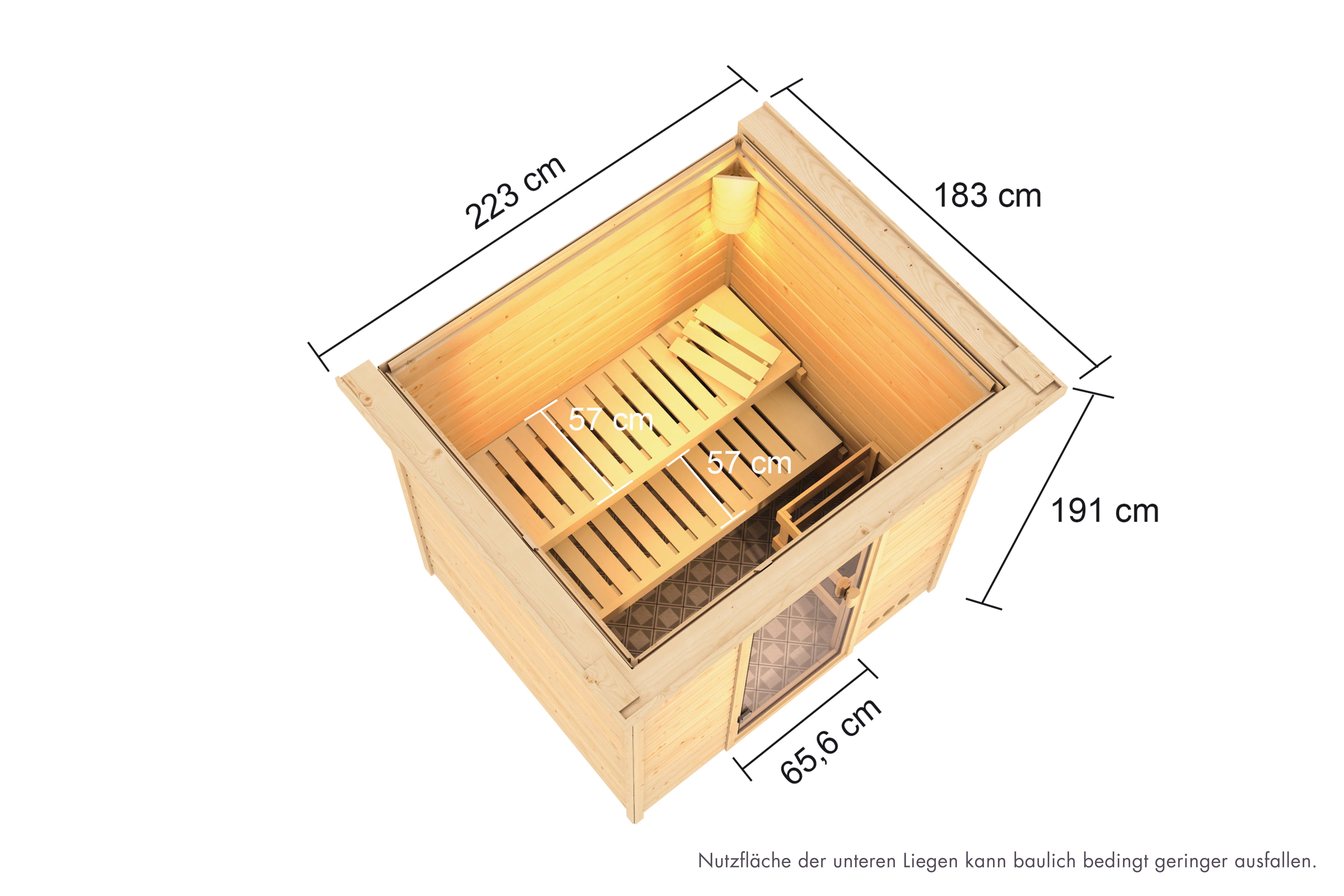 Was eignet sich für einen bislang ungenutzten Kellerraum besser, als eine eigene Sauna zum Entspannen und Wohlfühlen? Die Sauna Adelina hat ein Außenmaß von 195 x 169 cm und ist, aufgrund seiner geringen Höhe von 187 cm, ideal auch für Räume mit einer niedrigen Deckenhöhe geeignet. Die Massivholzsauna besteht aus 38mm starken Wandbohlen aus nordischer Fichte, welche im einfachen Steck- und Schraubsystem montiert werden. Durch den Fronteinstieg und die schlichte, rechteckige Form passt sie sich jeder Umgebung mühelos an. Mit einem optional wählbaren Dachkranz inkl. 3 LED-Spots, können Sie die Sauna von außen beleuchten und sie so gekonnt in Szene setzen. In den Innenraum gelangen Sie durch eine bronzierte Ganzglastür aus Einscheibensicherheitsglas. Damit beim Saunieren keine Wärme entweichen kann, wird die Tür durch eine Magnetverschlusstechnik geschlossen gehalten. Auf den, im Lieferumfang enthaltenen, Liegen können Sie den Saunagang so richtig genießen. Verschönern Sie das Ambiente in Ihrer Sauna und sorgen Sie für die größtmögliche Erholung mit unserem optional erhältlichen Zubehör. Eine Saunalampe Classic in der Ecke, eine ergonomische Kopfstütze für die perfekte Liegeposition oder eine Salzkristall Vital Sole für freies Atmen macht Ihren Saunagang zu einem perfekten Erlebnis. Entspannen Sie nach einem stressigen Arbeitstag und schöpfen Sie neue Kraft aus der angenehmen Wärme auf Ihrer Haut. Heizen Sie den Innenraum mit einem optional erhältlichen, klassischen Ofen. Dieser sorgt aufgrund seiner höheren Leistung für höhere Temperaturen und für ein angenehmes Klima im Innenraum. Der Saunaofen ist in einer Variante mit integrierter Steuerung, einer mit externer Steuerung und als Bio-Kombiofen erhältlich. Nutzen Sie Ihren Kellerraum zur Entspannung und verwandeln Sie ihn in eine Wellness-Oase mit der Massivholzsauna Sauna Adelina.
