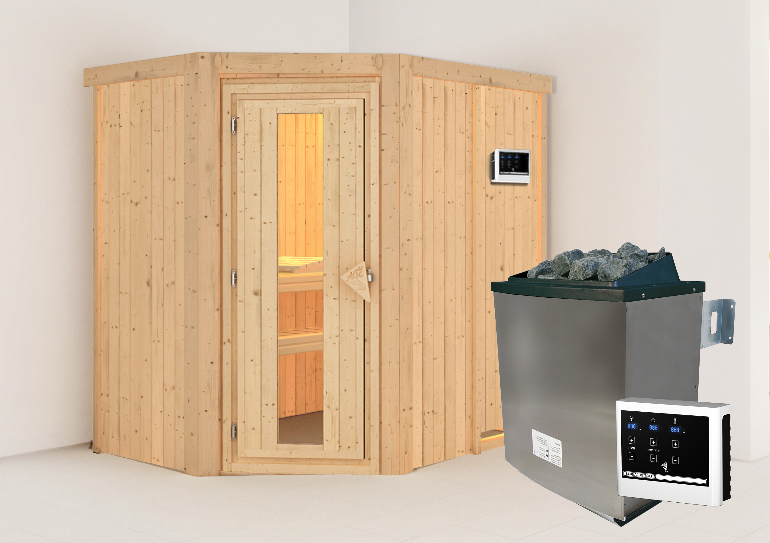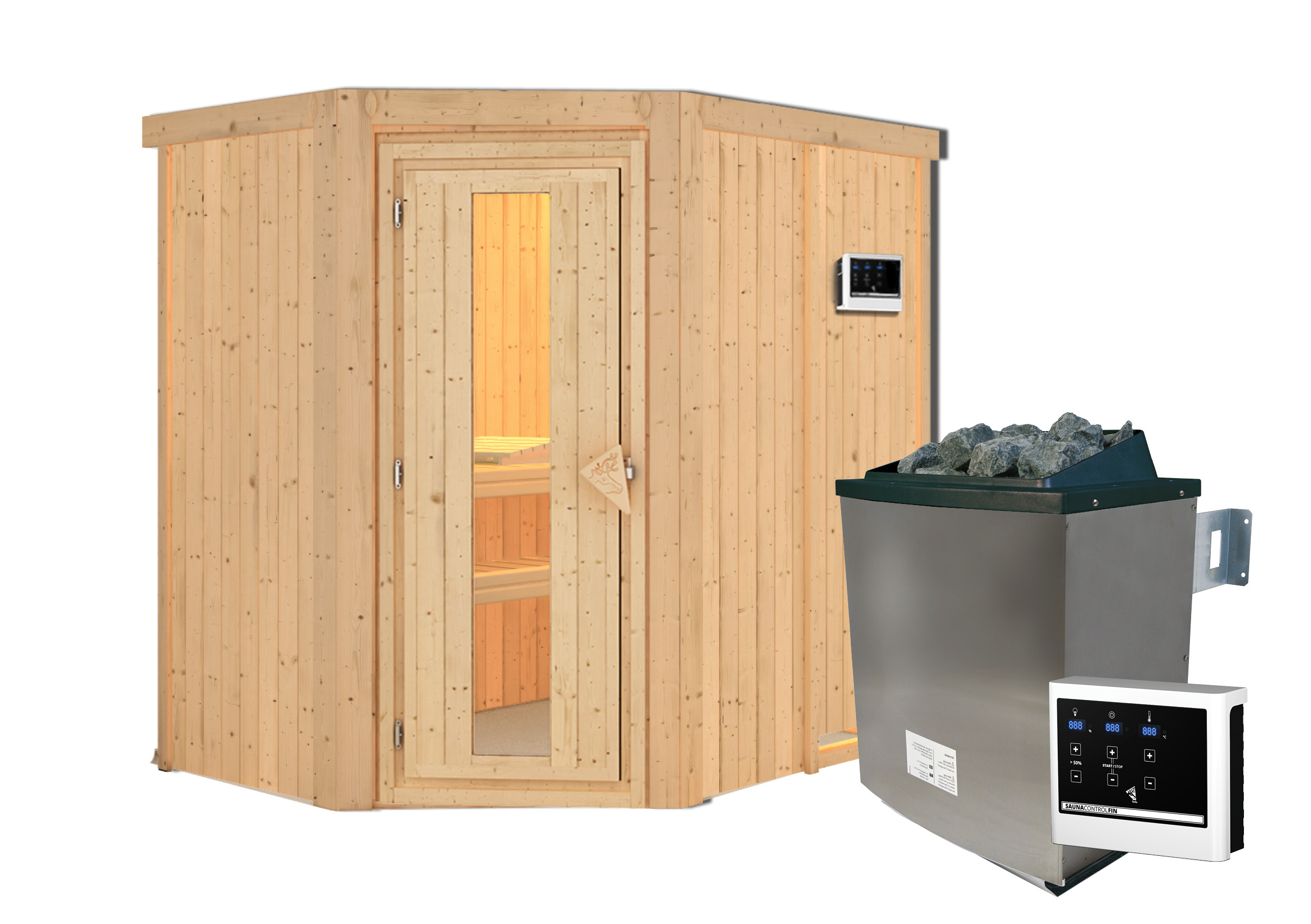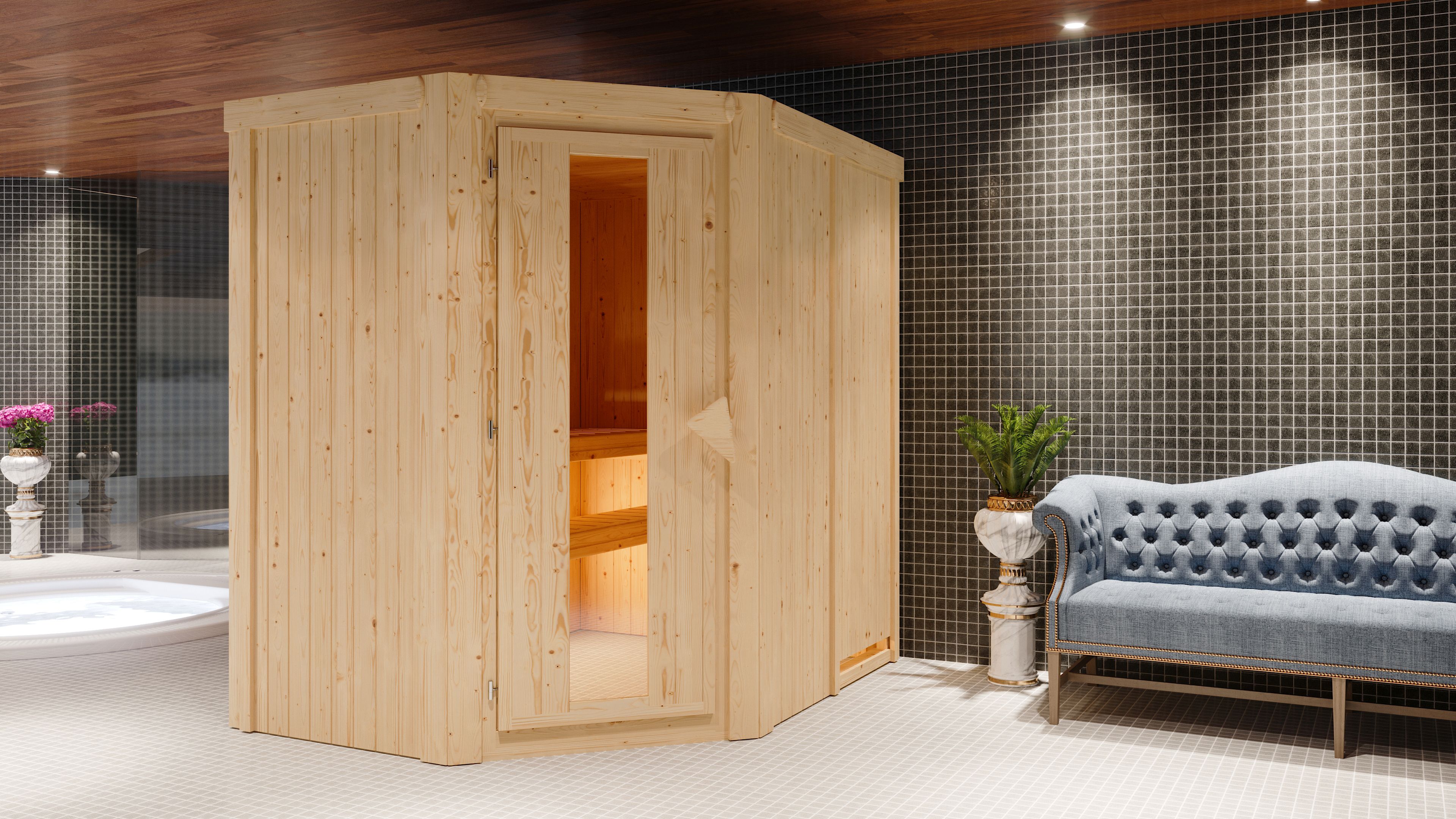 Sparen Sie wertvolle Energie mit der Systemsauna Carin. Eine 68mm starke Konstruktion, bestehend aus einer Rahmenkonstruktion mit 42mm starker Mineraldämmwolle und einer Verkleidung an der Sichtseite aus 12,5mm Spezial-Softline-Profilholz, hält die Wärme optimal im Saunainneren. Die Decke besteht aus einer 57mm starken Spezialplatte mit Mineraldämmwolle. Die Außenmaße ohne Dachkranz betragen 151 x 196 x 198cm (B/T/H). Die Sauna verfügt über 2 Saunabänke aus Espenholz zum Entspannen und Wohlfühlen. Mit einem optional erhältlichen 9kW-Saunaofen bringen Sie das Innere schnell auf Temperatur. Bei dem Ofen können Sie zwischen einer Variante mit integrierter Steuerung, einer Variante mit externer Steuerung oder einem Bio-Kombiofen wählen. So ist garantiert für jeden das Richtige dabei. Durch einen optionalen Dachkranz inkl. drei LED-Spots können Sie Ihre Sauna von außen beleuchten und sie so perfekt in Szene setzen. In den Innenraum gelangen Sie durch eine Saunatür. Hier können Sie sich zwischen vier möglichen Varianten entscheiden. Egal ob klassisch mit bronziertem Glas, modern mit graphitfarbenem Glas, schlicht mit klarem Türglas oder passend mit einer energiesparenden, wärmegedämmten Holztür mit klarem Isolierglas. Durch die vorgefertigten Wand und Deckenelemente wird Ihnen ein einfacher Aufbau ermöglicht. Passen Sie die Sauna auf Ihre Bedürfnisse an mit unserem optional erhältlichen Zubehör. Eine ergonomische Kopfstütze für den optimalen Liegekomfort, eine ergonomische Rückenlehne zur perfekten Entspannung oder eine Saunaleuchte modern für das richtige Ambiente. Genießen Sie die Ruhe nach einem anstrengenden Arbeitstag bei einem ausgiebigen Saunagang und erholen Sie sich vom Alltag. Verringern Sie den Energieverbrauch beim Saunieren mit der 68mm Systemsauna Carin.