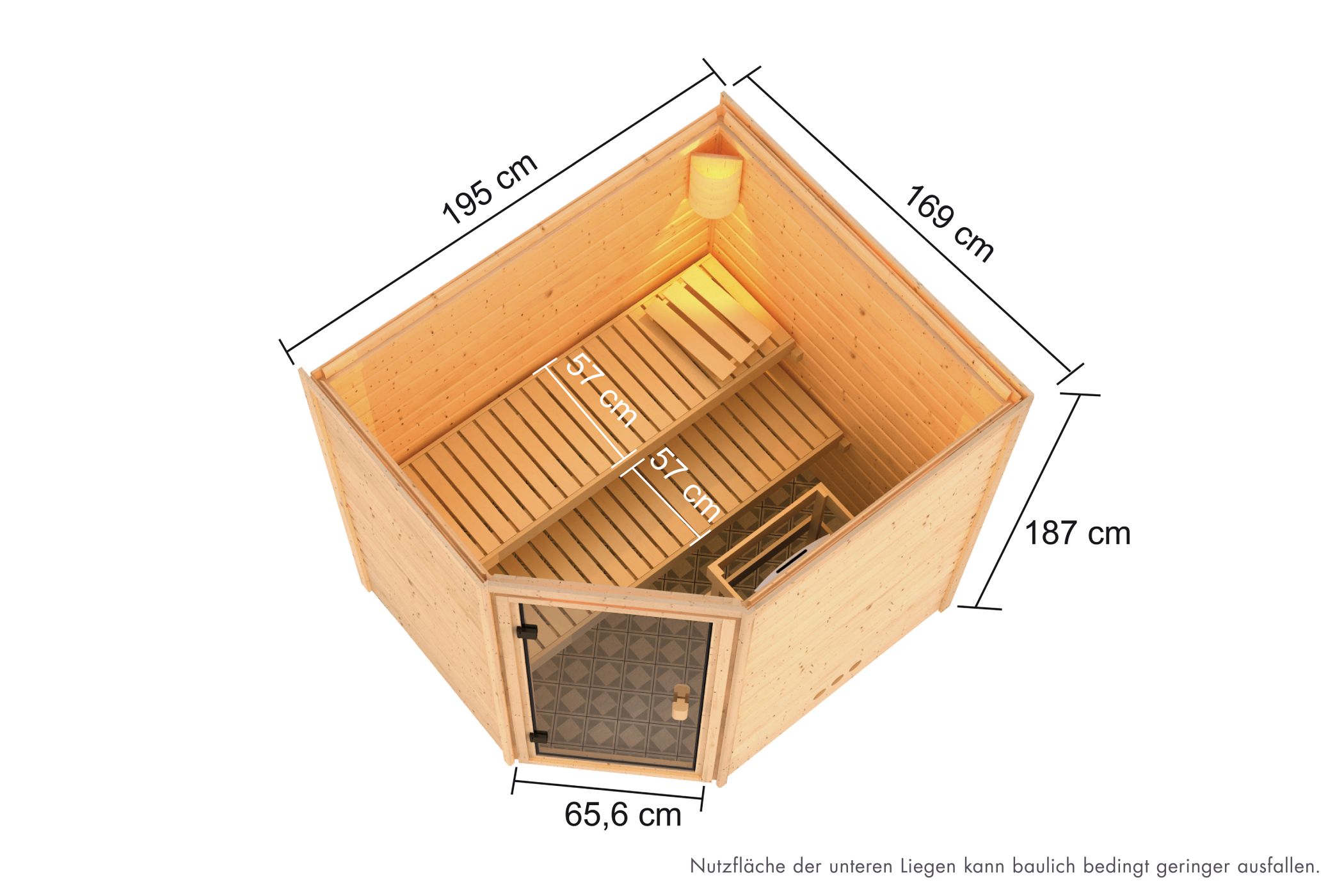 Diese Massivholzsauna aus 38 mm starken Massivholzbrettern aus hochwertiger nordischer Fichte wird im einfachen Steck-/Schraubsystem errichtet. Durch die hochwertige Saunatür mit Eckeinstieg gelangen Sie nach erfolgter Montage in den Innenraum mit 185 cm x 159 cm. Hier empfangen Sie das mitgelieferte Ofenschutzgitter sowie 2 Liege/n. Auch bei unseren Massivholzsaunen im Steck-/Schraubsystem sind alle 4 Seitenwände aus massivem Fichtenholz erstellt, sodass wir hier keinen Einsatz von Hartfaserplatten oder ähnlichem haben (außer im Dachbereich). Die Sauna mit den 4 Sichtseiten können so beliebig im Raum platziert werden. Die Dachplatten bestehen aus 57 mm Elementbauweise mit einer Mineralwolldämmung.