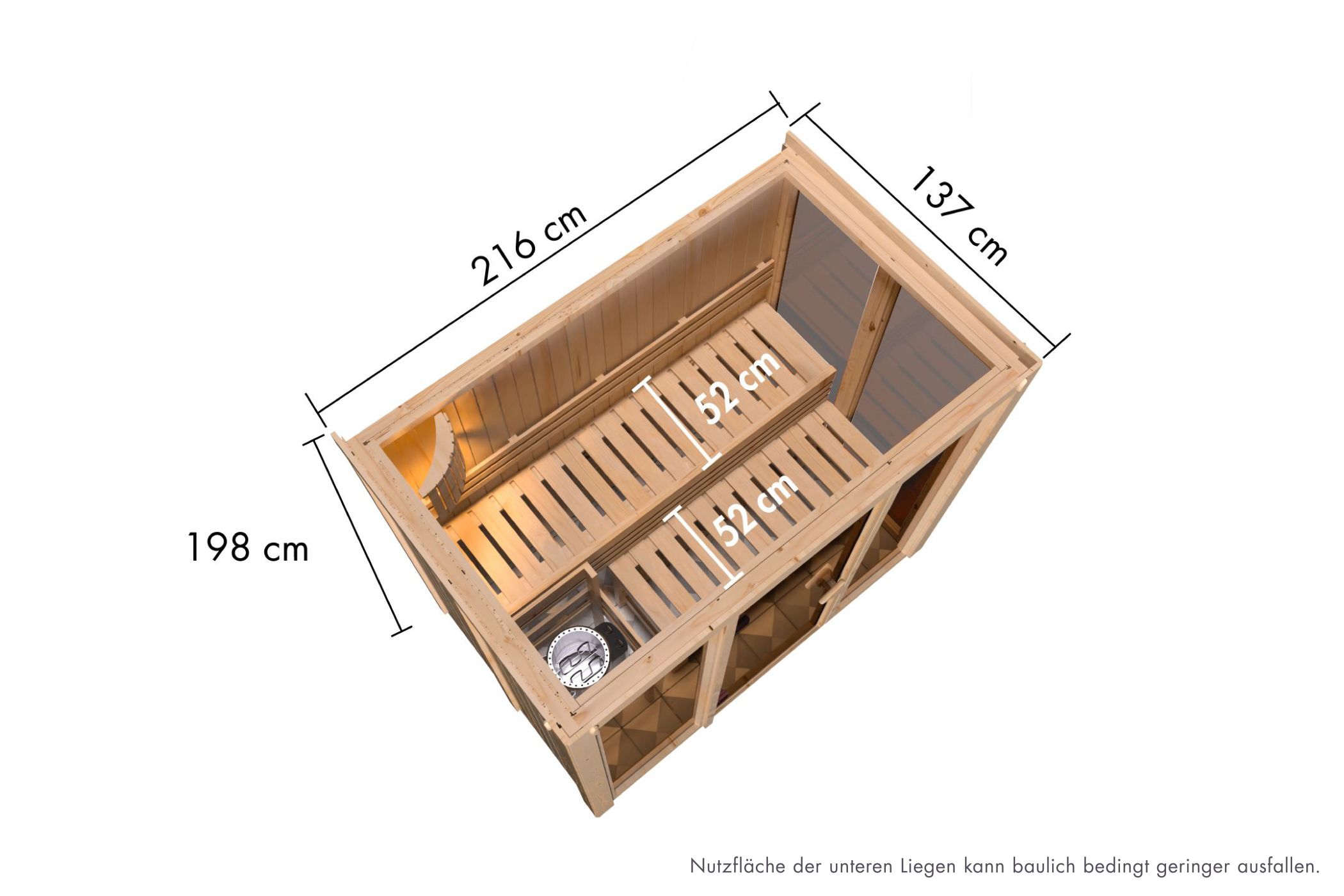Mit ihren Außenmaßen von 216 cm x 138 cm und den daraus resultierenden Innenmaßen von 200 cm x 121 cm bietet unsere Sauna für alle Anforderungen ausreichend Platz. Die 2 Liegen werden innen auf Vierkanthölzern montiert, welche aufgrund der Systembauweise in der Höhe nicht flexibel sind. Die untere Liege kann unter die obere Bank geschoben werden, was den Innenraum gefühlt großzügiger macht und so Platz zum Reinigen freigibt. Ein Ofenschutzgitter ist stets im Lieferumfang enthalten. Nur für den privathäuslichen Einsatz geeignet.