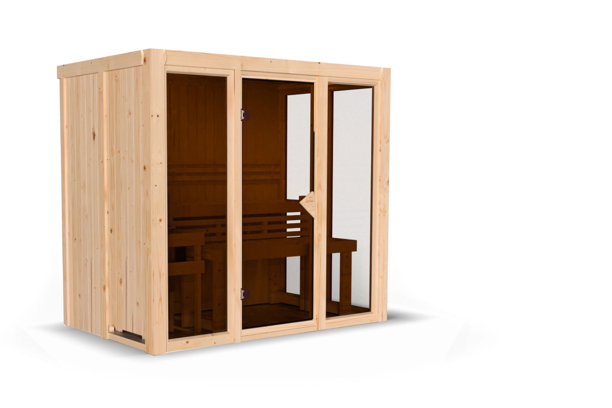 Bei unseren 68 mm-Saunen sind im Unterschied zu den 38 mm oder 40 mm Vollholz-Saunen die Rückseiten keine Sichtseiten. Diese sind, genau wie die Deckenelemente, nur auf der Innenseite mit dem Profilholz verkleidet. Außen befindet sich dann eine stabile Hartfaserplatte. Die Sauna verfügt über einen formschönen und praktischen Fronteinstieg.