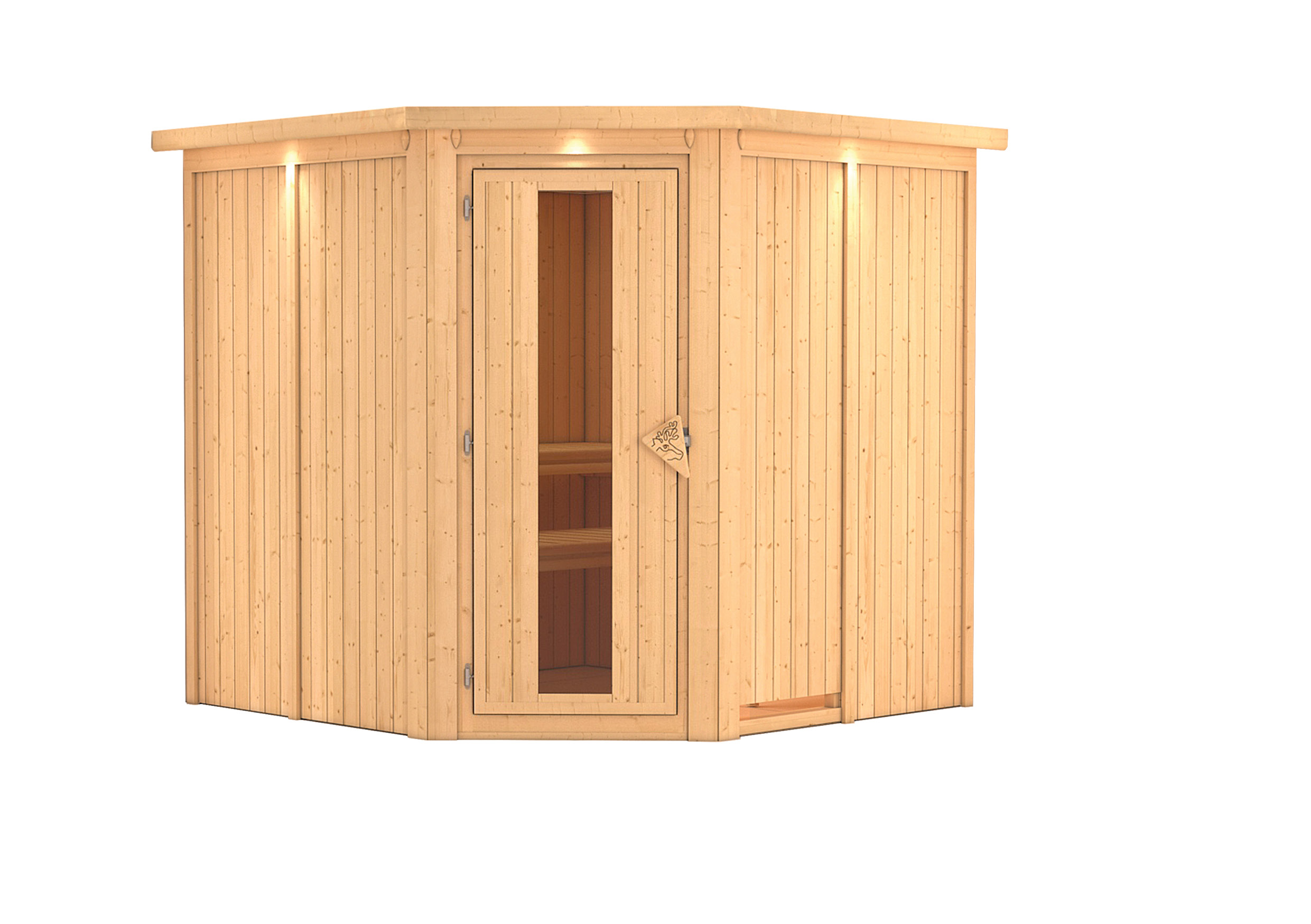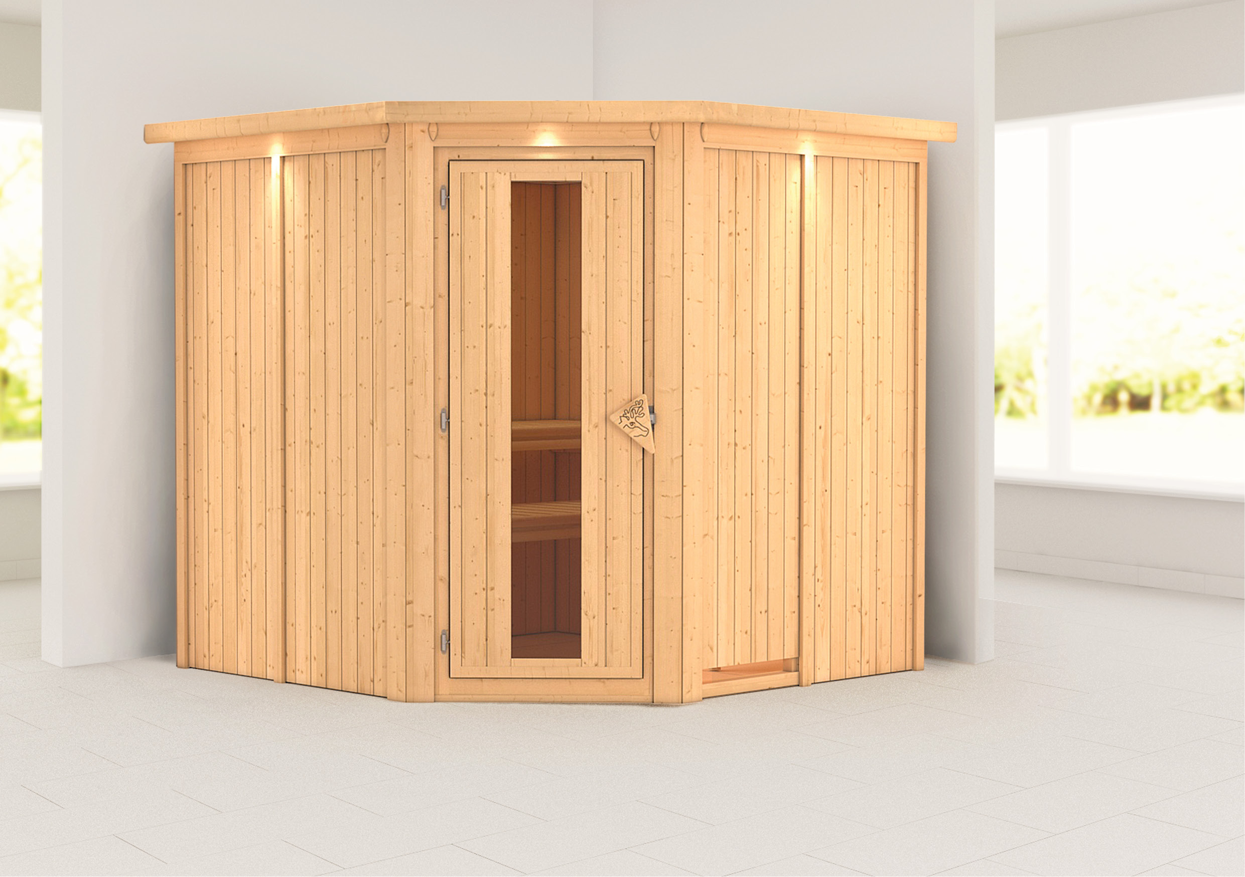 Sparen Sie wertvolle Energie mit der Systemsauna Jarin. Eine 68mm starke Konstruktion, bestehend aus einer Rahmenkonstruktion mit 42mm starker Mineraldämmwolle und einer Verkleidung an der Sichtseite aus 12,5mm Spezial-Softline-Profilholz, hält die Wärme optimal im Saunainneren. Die Decke besteht aus einer 57mm starken Spezialplatte mit Mineraldämmwolle. Die Außenmaße ohne Dachkranz betragen 196 x 196 x 198cm (B/T/H). Die Sauna verfügt über 3 Saunabänke aus Espenholz zum Entspannen und Wohlfühlen. Mit einem optional erhältlichen 9kW-Saunaofen bringen Sie das Innere schnell auf Temperatur. Bei dem Ofen können Sie zwischen einer Variante mit integrierter Steuerung, einer Variante mit externer Steuerung oder einem 9kW Bio-Kombiofen wählen. So ist garantiert für jeden das Richtige dabei. Durch einen optionalen Dachkranz inkl. drei LED-Spots können Sie Ihre Sauna von außen beleuchten und sie so perfekt in Szene setzen. In den Innenraum gelangen Sie durch eine Saunatür. Hier können Sie sich zwischen vier möglichen Varianten entscheiden. Egal ob klassisch mit bronziertem Glas, modern mit graphitfarbenem Glas, schlicht mit klarem Türglas oder passend mit einer energiesparenden, wärmegedämmten Holztür mit klarem Isolierglas. Durch die vorgefertigten Wand und Deckenelemente wird Ihnen ein einfacher Aufbau ermöglicht. Passen Sie die Sauna auf Ihre Bedürfnisse an mit unserem optional erhältlichen Zubehör. Eine ergonomische Kopfstütze für den optimalen Liegekomfort, eine ergonomische Rückenlehne zur perfekten Entspannung oder eine Saunaleuchte modern für das richtige Ambiente. Genießen Sie die Ruhe nach einem anstrengenden Arbeitstag bei einem ausgiebigen Saunagang und erholen Sie sich vom Alltag. Verringern Sie den Energieverbrauch beim Saunieren mit der 68mm Systemsauna Jarin.