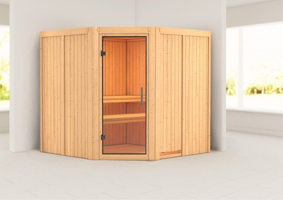 Sparen Sie wertvolle Energie mit der Systemsauna Jarin. Eine 68mm starke Konstruktion, bestehend aus einer Rahmenkonstruktion mit 42mm starker Mineraldämmwolle und einer Verkleidung an der Sichtseite aus 12,5mm Spezial-Softline-Profilholz, hält die Wärme optimal im Saunainneren. Die Decke besteht aus einer 57mm starken Spezialplatte mit Mineraldämmwolle. Die Außenmaße ohne Dachkranz betragen 196 x 196 x 198cm (B/T/H). Die Sauna verfügt über 3 Saunabänke aus Espenholz zum Entspannen und Wohlfühlen. Mit einem optional erhältlichen 9kW-Saunaofen bringen Sie das Innere schnell auf Temperatur. Bei dem Ofen können Sie zwischen einer Variante mit integrierter Steuerung, einer Variante mit externer Steuerung oder einem 9kW Bio-Kombiofen wählen. So ist garantiert für jeden das Richtige dabei. Durch einen optionalen Dachkranz inkl. drei LED-Spots können Sie Ihre Sauna von außen beleuchten und sie so perfekt in Szene setzen. In den Innenraum gelangen Sie durch eine Saunatür. Hier können Sie sich zwischen vier möglichen Varianten entscheiden. Egal ob klassisch mit bronziertem Glas, modern mit graphitfarbenem Glas, schlicht mit klarem Türglas oder passend mit einer energiesparenden, wärmegedämmten Holztür mit klarem Isolierglas. Durch die vorgefertigten Wand und Deckenelemente wird Ihnen ein einfacher Aufbau ermöglicht. Passen Sie die Sauna auf Ihre Bedürfnisse an mit unserem optional erhältlichen Zubehör. Eine ergonomische Kopfstütze für den optimalen Liegekomfort, eine ergonomische Rückenlehne zur perfekten Entspannung oder eine Saunaleuchte modern für das richtige Ambiente. Genießen Sie die Ruhe nach einem anstrengenden Arbeitstag bei einem ausgiebigen Saunagang und erholen Sie sich vom Alltag. Verringern Sie den Energieverbrauch beim Saunieren mit der 68mm Systemsauna Jarin.