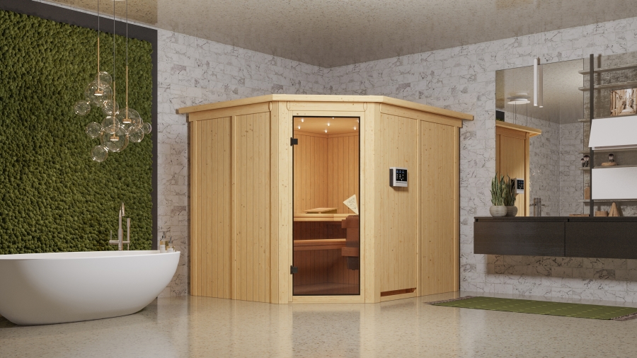Sparen Sie wertvolle Energie mit der Systemsauna Malin. Eine 68mm starke Konstruktion, bestehend aus einer Rahmenkonstruktion mit 42mm starker Mineraldämmwolle und einer Verkleidung an der Sichtseite aus 12,5mm Spezial-Softline-Profilholz, hält die Wärme optimal im Saunainneren. Die Decke besteht aus einer 57mm starken Spezialplatte mit Mineraldämmwolle. Die Außenmaße ohne Dachkranz betragen 231 x 196 x 198cm (B/T/H). Die Sauna verfügt über 3 Saunabänke aus Espenholz zum Entspannen und Wohlfühlen. Mit einem optional erhältlichen 9kW-Saunaofen bringen Sie das Innere schnell auf Temperatur. Bei dem Ofen können Sie zwischen einer Variante mit integrierter Steuerung, einer Variante mit externer Steuerung oder einem 9kW Bio-Kombiofen wählen. So ist garantiert für jeden das Richtige dabei. Durch einen optionalen Dachkranz inkl. drei LED-Spots können Sie Ihre Sauna von außen beleuchten und sie so perfekt in Szene setzen. In den Innenraum gelangen Sie durch eine Saunatür. Hier können Sie sich zwischen vier möglichen Varianten entscheiden. Egal ob klassisch mit bronziertem Glas, modern mit graphitfarbenem Glas, schlicht mit klarem Türglas oder passend mit einer energiesparenden, wärmegedämmten Holztür mit klarem Isolierglas. Durch die vorgefertigten Wand und Deckenelemente wird Ihnen ein einfacher Aufbau ermöglicht. Passen Sie die Sauna auf Ihre Bedürfnisse an mit unserem optional erhältlichen Zubehör. Eine ergonomische Kopfstütze für den optimalen Liegekomfort, eine ergonomische Rückenlehne zur perfekten Entspannung oder eine Saunaleuchte modern für das richtige Ambiente. Genießen Sie die Ruhe nach einem anstrengenden Arbeitstag bei einem ausgiebigen Saunagang und erholen Sie sich vom Alltag. Verringern Sie den Energieverbrauch beim Saunieren mit der 68mm Systemsauna Malin.