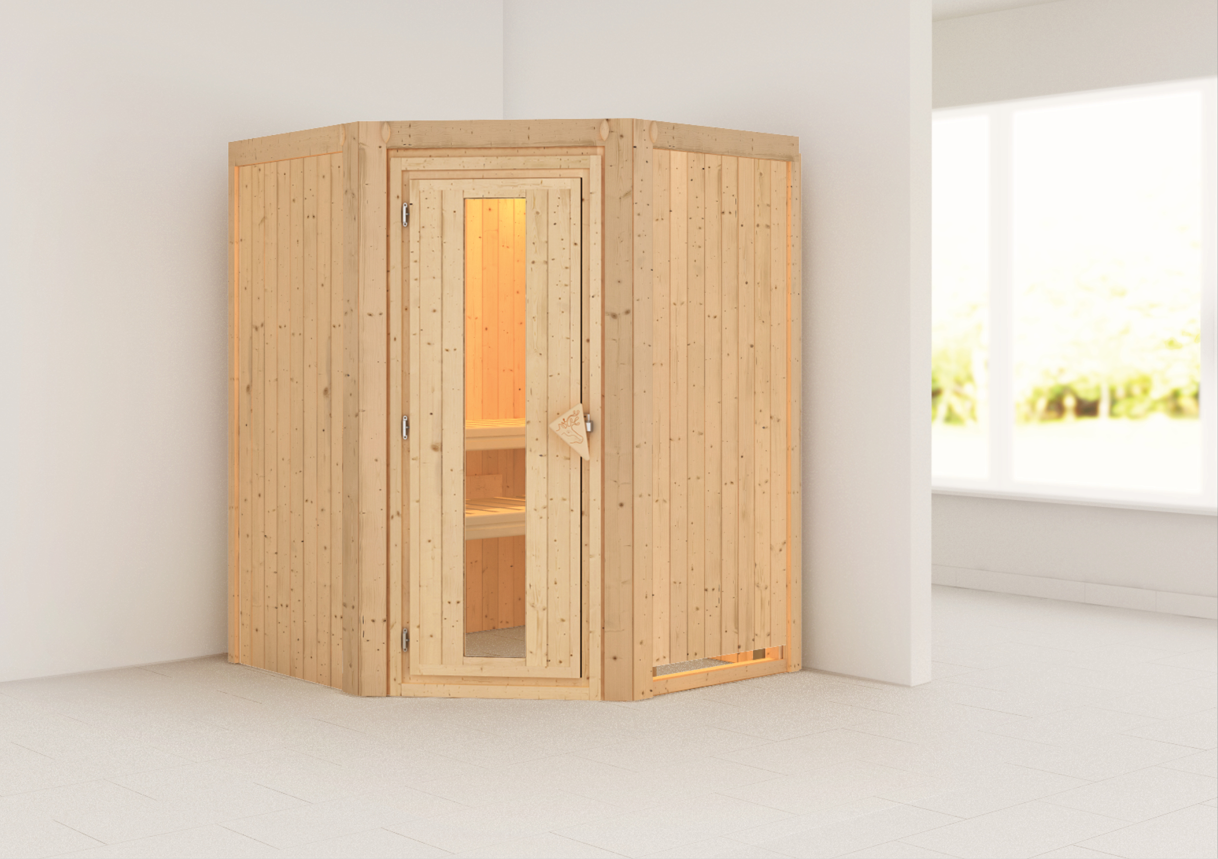 Das volle Saunaerlebnis genießen und dennoch Energie sparen. Dies ist möglich mit unserenr 68mm Systemsauna Nanja und dem steckerfertigen 3,6kW-Saunaofen. Durch die vormontierten Wandelemente kann die Sauna schnell und einfach montiert werden. Die 68mm starken Elemente bestehen aus einer Rahmenkonstruktion, welche an der Sichtseite mit 12,5mm starkem Spezial-Softline-Profilholz verstärkt sind. Diese Konstruktion bietet eine ideale Isolierung und hält die Wärme perfekt im Innenraum. Optional ist die Sauna Nanja mit einem Dachkranz inkl. drei LED-Spots erhältlich. Diese sorgen nicht nur für ein schönes Ambiente im Außenbereich der Sauna, sondern setzen diese auch noch gekonnt in Szene. Die Außenmaße betragen 151 x 151 x 198cm (B/T/H). In den großen Innenraum der Sauna gelangen Sie durch eine Saunatür. Hier haben Sie die Wahl aus vier Varianten und das ganz ohne Mehrkosten. Egal ob in der wärmegedämmten, energiesparenden Version, der klaren Ganzglastür, der Version mit bronzierte Ganzglastür oder der modernen graphitfarbenen Türversion. Hier ist garantiert für jeden Geschmack das Richtige dabei. Um sich im Saunainneren perfekt erholen zu können, wird hier1 Saunaliege aus massivem Espenholz montiert. Das Holz ist besonders weich und nimmt die Wärme nicht so stark an. Dies ermöglicht ein angenehmes Sitz- und Liegegefühl. Bei dem steckerfertigen Saunaofen können Sie zwischen drei Varianten wählen. Einer mit integrierter Steuerung, einer mit externem Steuergerät Easy und einem 3,6kW Bio-Kombi-Ofen. Das Besondere an diesem Saunaofen ist aber nicht seine Variantenvielfallt, sondern der Anschluss. Der Ofen wird mithilfe eines Steckers zur Inbetriebnahme an eine hausübliche 230Volt-Steckdose angeschlossen. Da hierfür kein Fachmann erforderlich ist, entfallen die Kosten für einen Elektriker und einen Umbau auf einen 400 Volt-Anschluss. Genießen Sie das volle Saunaerlebnis und sparen zusätzlich Energie mit der 68mm Plug & Play Sauna Nanja.
