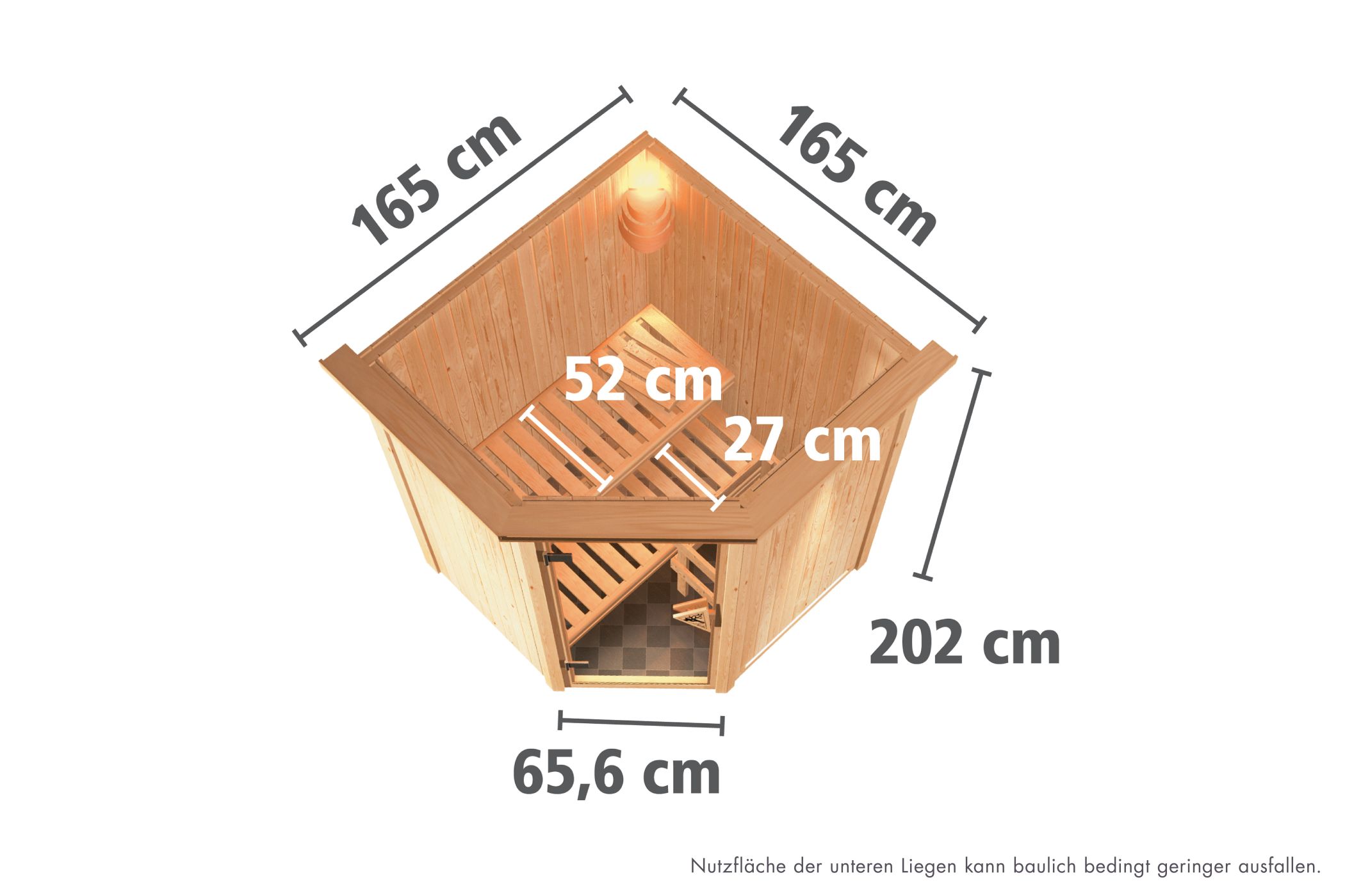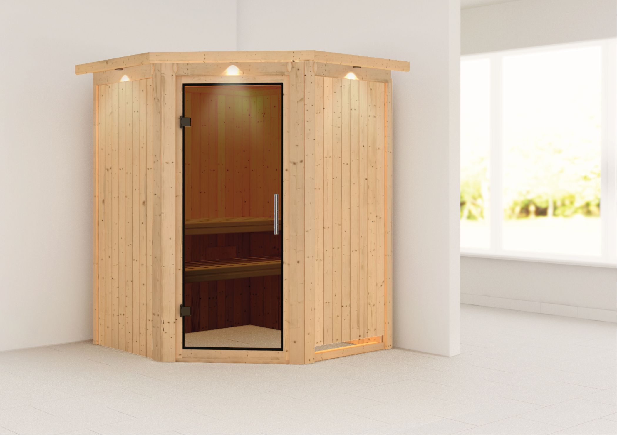 Das volle Saunaerlebnis genießen und dennoch Energie sparen. Dies ist möglich mit unserenr 68mm Systemsauna Nanja und dem steckerfertigen 3,6kW-Saunaofen. Durch die vormontierten Wandelemente kann die Sauna schnell und einfach montiert werden. Die 68mm starken Elemente bestehen aus einer Rahmenkonstruktion, welche an der Sichtseite mit 12,5mm starkem Spezial-Softline-Profilholz verstärkt sind. Diese Konstruktion bietet eine ideale Isolierung und hält die Wärme perfekt im Innenraum. Optional ist die Sauna Nanja mit einem Dachkranz inkl. drei LED-Spots erhältlich. Diese sorgen nicht nur für ein schönes Ambiente im Außenbereich der Sauna, sondern setzen diese auch noch gekonnt in Szene. Die Außenmaße betragen 151 x 151 x 198cm (B/T/H). In den großen Innenraum der Sauna gelangen Sie durch eine Saunatür. Hier haben Sie die Wahl aus vier Varianten und das ganz ohne Mehrkosten. Egal ob in der wärmegedämmten, energiesparenden Version, der klaren Ganzglastür, der Version mit bronzierte Ganzglastür oder der modernen graphitfarbenen Türversion. Hier ist garantiert für jeden Geschmack das Richtige dabei. Um sich im Saunainneren perfekt erholen zu können, wird hier1 Saunaliege aus massivem Espenholz montiert. Das Holz ist besonders weich und nimmt die Wärme nicht so stark an. Dies ermöglicht ein angenehmes Sitz- und Liegegefühl. Bei dem steckerfertigen Saunaofen können Sie zwischen drei Varianten wählen. Einer mit integrierter Steuerung, einer mit externem Steuergerät Easy und einem 3,6kW Bio-Kombi-Ofen. Das Besondere an diesem Saunaofen ist aber nicht seine Variantenvielfallt, sondern der Anschluss. Der Ofen wird mithilfe eines Steckers zur Inbetriebnahme an eine hausübliche 230Volt-Steckdose angeschlossen. Da hierfür kein Fachmann erforderlich ist, entfallen die Kosten für einen Elektriker und einen Umbau auf einen 400 Volt-Anschluss. Genießen Sie das volle Saunaerlebnis und sparen zusätzlich Energie mit der 68mm Plug & Play Sauna Nanja.