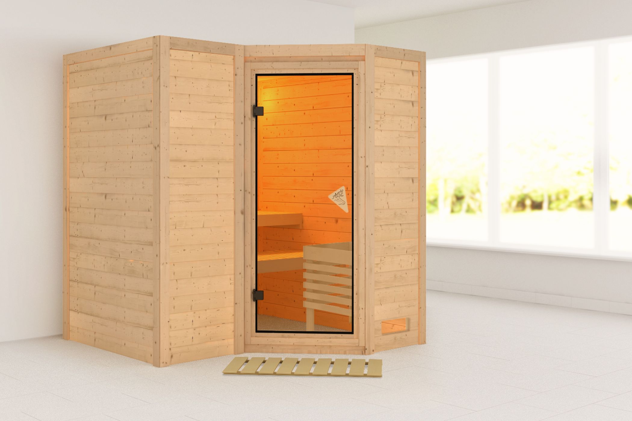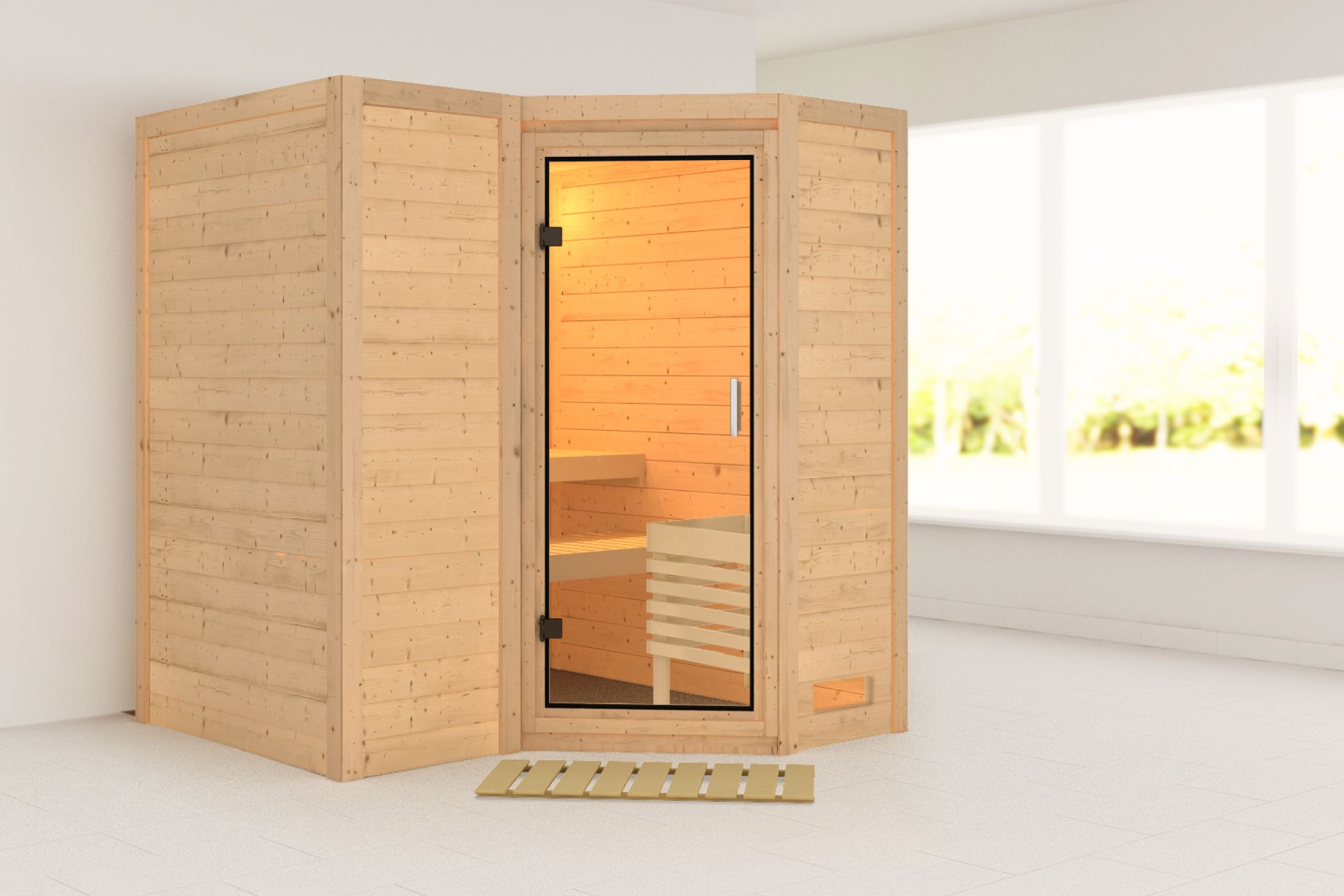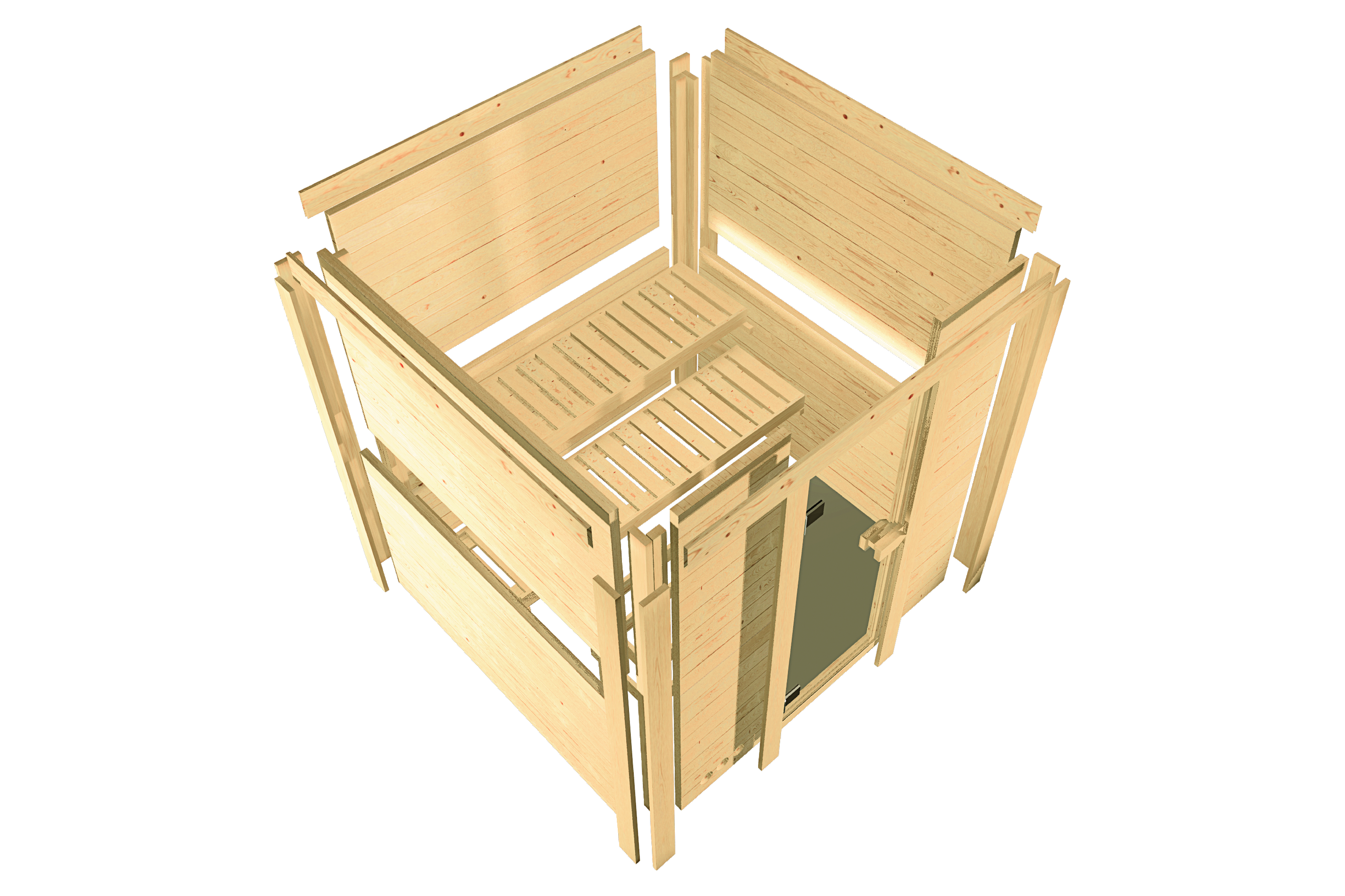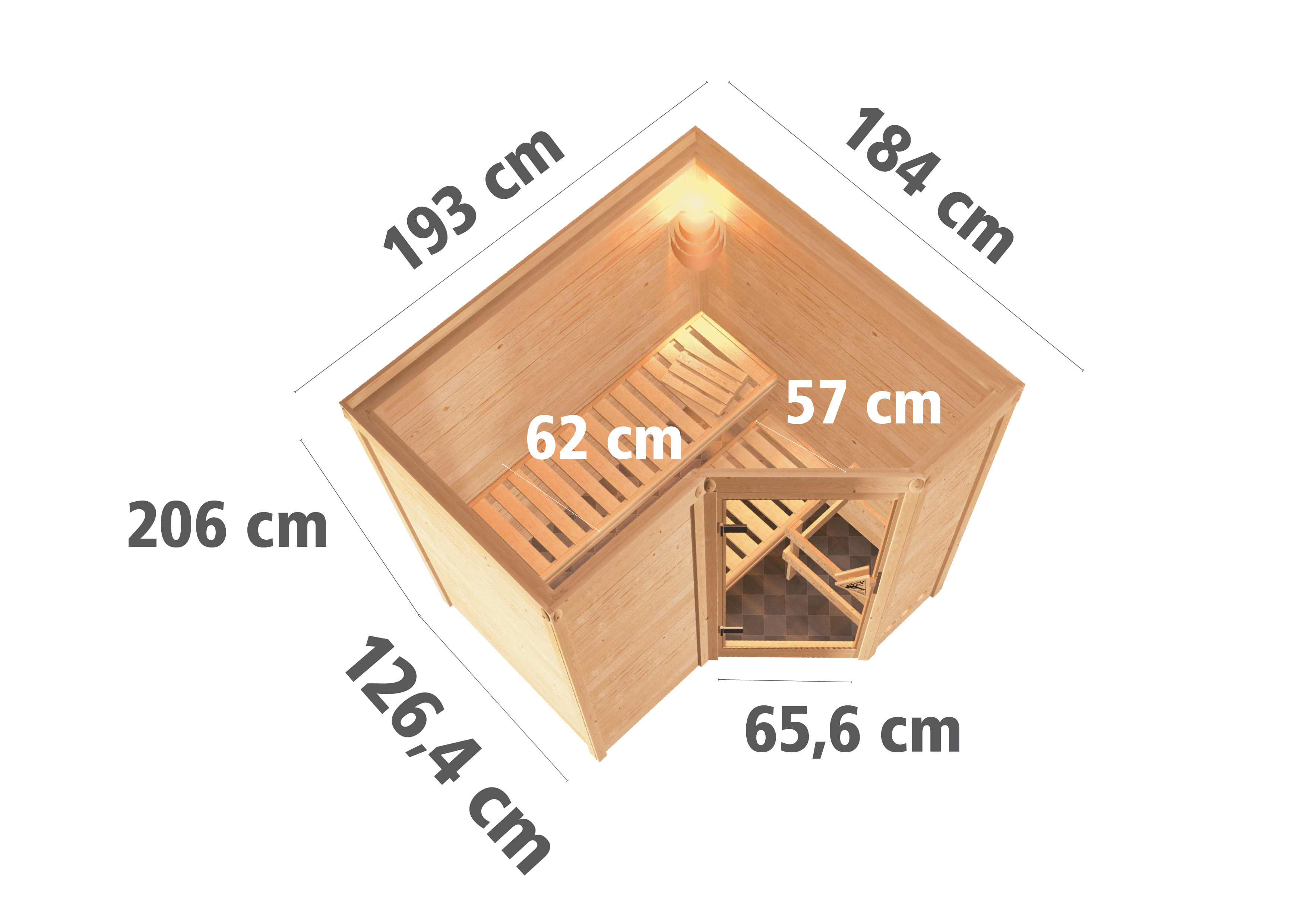 Mit der 38 mm Massivholzsauna Sahib 1 haben Sie die Möglichkeit, bei sich zuhause, eine eigene Oase zu schaffen. Nach einem anstrengenden Tag oder aber auch im Winter gibt es nichts besseres, als etwas Wärme zu spüren. Die 38 mm Bohlen aus nordischem Fichtenholz werden im Elementsystem montiert und durch die Vollholzwände kann die Wärme aus dem Saunainneren nicht entfliehen. Um die Sauna individueller zu gestalten, können Sie optional einen Dachkranz inkl. LED Spots hineinsetzten. Zudem haben Sie die Möglichkeit zwischen vier verschiedenen Türvarianten zu wählen, sodass für jeden etwas dabei ist. Ob eine Holztür, Isolierglas, klassisch mit einer bronzierten Ganzglastür, modern in einer Ganzglastür in graphitfarben oder schlicht mit einer klaren Ganzglastür. Hier können Sie die Sauna zu Ihrer Sauna machen. Mit der großzügigen Größe von 193 x 184 x 209 cm (B/T/H) haben Sie jede Menge Platz um auf andere Gedanken zu kommen. Erweitern Sie die Sauna mit dem optional zu erwerbenden 9kW-Bio-Kombiofen. Hier haben Sie neben der klassischen finnischen Sauna noch die Möglichkeiten eine Kräuter-Kur, ein Dampfbad und eine Familiensauna zu genießen. Teilen Sie das Erlebnis mit Ihrer Familie und tuen Sie sich etwas Gutes. Ein richtiges Saunagefühl kommt durch die Saunaliegen und einer Kopfstütze auf und wer einen besonderen Liegekomfort möchte, kann zur extra breiten Saunaliege von 62 cm Breite greifen. Um Sie vor Verbrennungen zu schützen ist ein Ofenschutzgitter am Saunaofen montiert. Um Ihre Atemwege zu befreien und wieder tief einzuatmen, ist optional ein Salzkristall Vital Sole oder eine Salzkristall-Leuchte erhältlich. Schaffen Sie sich Ihren kleinen Ruhetempel mit der Massivholzsauna Sahib 1.