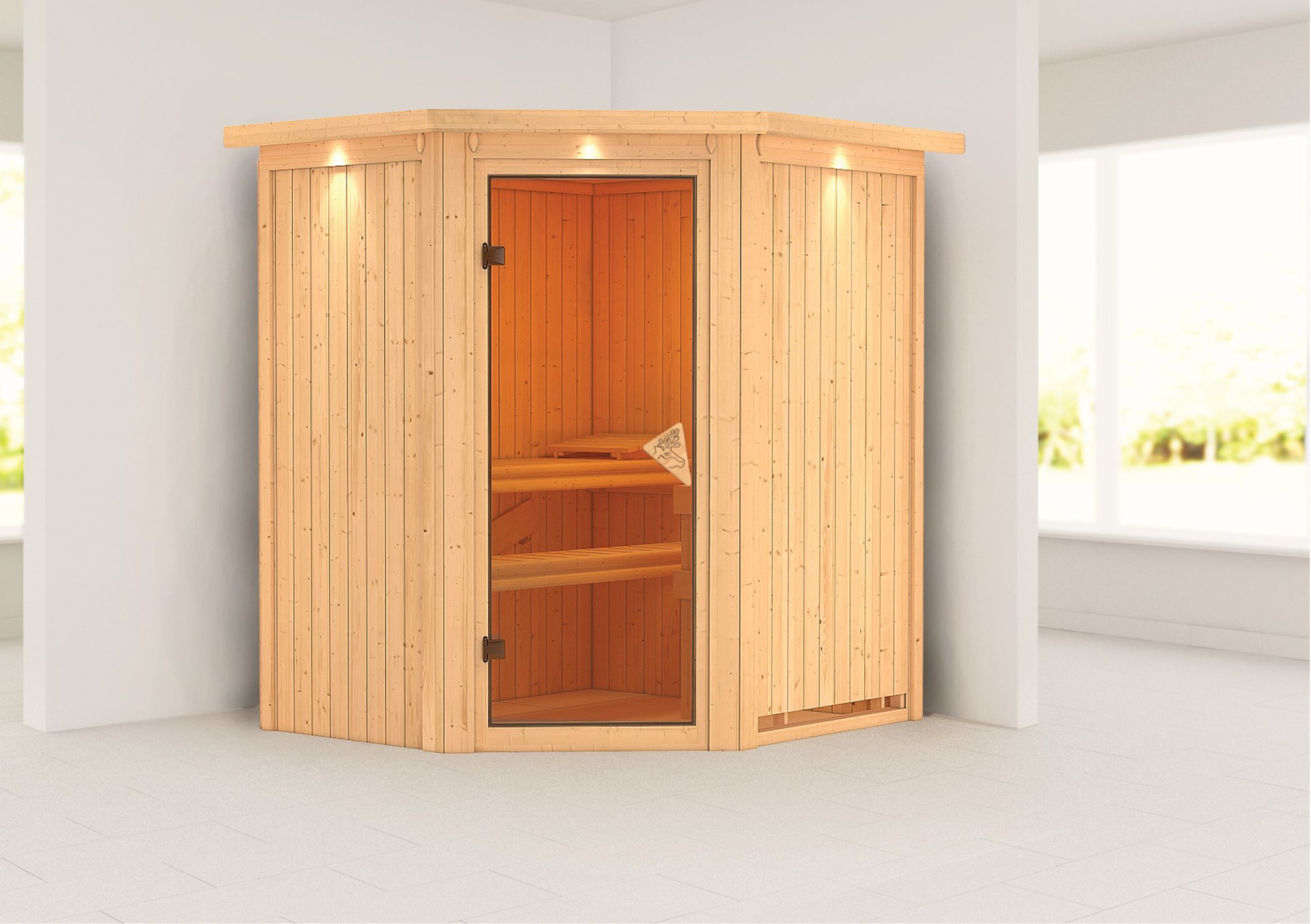 Das volle Saunaerlebnis genießen und dennoch Energie sparen. Dies ist möglich mit unserenr 68mm Systemsauna Tonja und dem steckerfertigen 3,6kW-Saunaofen. Durch die vormontierten Wandelemente kann die Sauna schnell und einfach montiert werden. Die 68mm starken Elemente bestehen aus einer Rahmenkonstruktion, welche an der Sichtseite mit 12,5mm starkem Spezial-Softline-Profilholz verstärkt sind. Diese Konstruktion bietet eine ideale Isolierung und hält die Wärme perfekt im Innenraum. Optional ist die Sauna Tonja mit einem Dachkranz inkl. drei LED-Spots erhältlich. Diese sorgen nicht nur für ein schönes Ambiente im Außenbereich der Sauna, sondern setzen diese auch noch gekonnt in Szene. Die Außenmaße betragen 170 x 151 x 198cm (B/T/H). In den großen Innenraum der Sauna gelangen Sie durch eine Saunatür. Hier haben Sie die Wahl aus vier Varianten und das ganz ohne Mehrkosten. Egal ob in der wärmegedämmten, energiesparenden Version, der klaren Ganzglastür, der Version mit bronzierte Ganzglastür oder der modernen graphitfarbenen Türversion. Hier ist garantiert für jeden Geschmack das Richtige dabei. Um sich im Saunainneren perfekt erholen zu können, wird hier1 Saunaliege aus massivem Espenholz montiert. Das Holz ist besonders weich und nimmt die Wärme nicht so stark an. Dies ermöglicht ein angenehmes Sitz- und Liegegefühl. Bei dem steckerfertigen Saunaofen können Sie zwischen drei Varianten wählen. Einer mit integrierter Steuerung, einer mit externem Steuergerät Easy und einem 3,6kW Bio-Kombi-Ofen. Das Besondere an diesem Saunaofen ist aber nicht seine Variantenvielfallt, sondern der Anschluss. Der Ofen wird mithilfe eines Steckers zur Inbetriebnahme an eine hausübliche 230Volt-Steckdose angeschlossen. Da hierfür kein Fachmann erforderlich ist, entfallen die Kosten für einen Elektriker und einen Umbau auf einen 400 Volt-Anschluss. Genießen Sie das volle Saunaerlebnis und sparen zusätzlich Energie mit der 68mm Plug & Play Sauna Tonja.