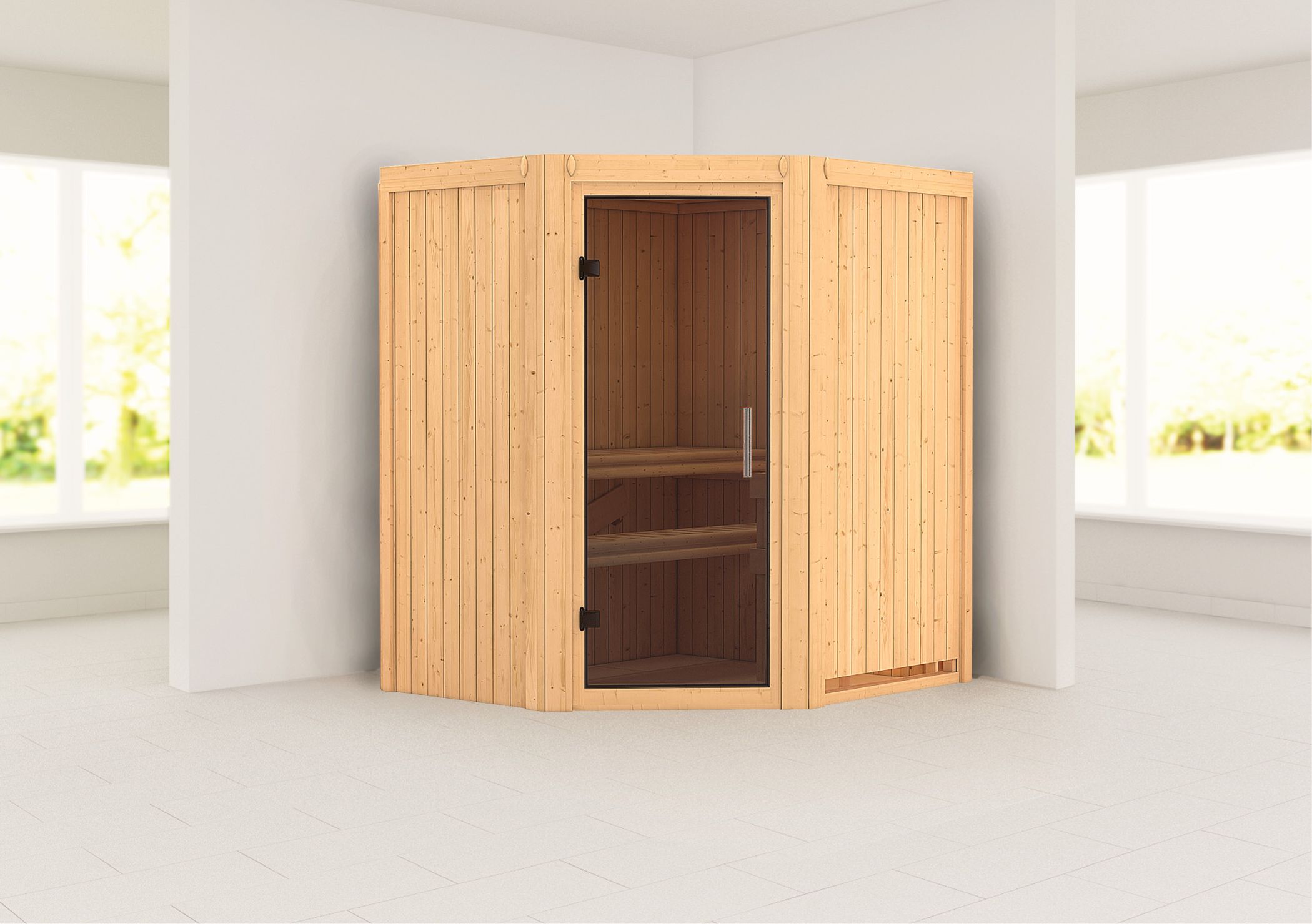 Das volle Saunaerlebnis genießen und dennoch Energie sparen. Dies ist möglich mit unserenr 68mm Systemsauna Tonja und dem steckerfertigen 3,6kW-Saunaofen. Durch die vormontierten Wandelemente kann die Sauna schnell und einfach montiert werden. Die 68mm starken Elemente bestehen aus einer Rahmenkonstruktion, welche an der Sichtseite mit 12,5mm starkem Spezial-Softline-Profilholz verstärkt sind. Diese Konstruktion bietet eine ideale Isolierung und hält die Wärme perfekt im Innenraum. Optional ist die Sauna Tonja mit einem Dachkranz inkl. drei LED-Spots erhältlich. Diese sorgen nicht nur für ein schönes Ambiente im Außenbereich der Sauna, sondern setzen diese auch noch gekonnt in Szene. Die Außenmaße betragen 170 x 151 x 198cm (B/T/H). In den großen Innenraum der Sauna gelangen Sie durch eine Saunatür. Hier haben Sie die Wahl aus vier Varianten und das ganz ohne Mehrkosten. Egal ob in der wärmegedämmten, energiesparenden Version, der klaren Ganzglastür, der Version mit bronzierte Ganzglastür oder der modernen graphitfarbenen Türversion. Hier ist garantiert für jeden Geschmack das Richtige dabei. Um sich im Saunainneren perfekt erholen zu können, wird hier1 Saunaliege aus massivem Espenholz montiert. Das Holz ist besonders weich und nimmt die Wärme nicht so stark an. Dies ermöglicht ein angenehmes Sitz- und Liegegefühl. Bei dem steckerfertigen Saunaofen können Sie zwischen drei Varianten wählen. Einer mit integrierter Steuerung, einer mit externem Steuergerät Easy und einem 3,6kW Bio-Kombi-Ofen. Das Besondere an diesem Saunaofen ist aber nicht seine Variantenvielfallt, sondern der Anschluss. Der Ofen wird mithilfe eines Steckers zur Inbetriebnahme an eine hausübliche 230Volt-Steckdose angeschlossen. Da hierfür kein Fachmann erforderlich ist, entfallen die Kosten für einen Elektriker und einen Umbau auf einen 400 Volt-Anschluss. Genießen Sie das volle Saunaerlebnis und sparen zusätzlich Energie mit der 68mm Plug & Play Sauna Tonja.