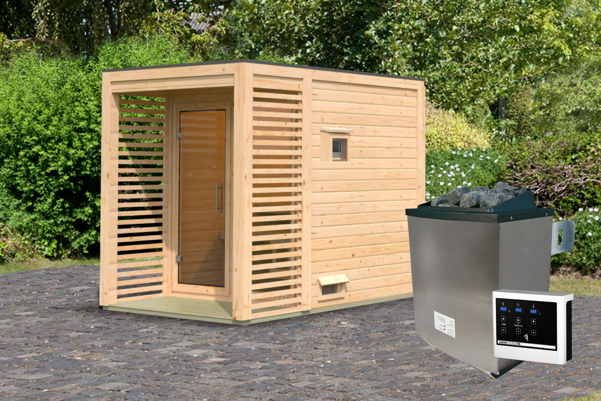 Genießen Sie ultimativen Komfort auf unseren Bänken aus Espe, einem Holz von außergewöhnlicher Qualität, das sich durch seine angenehme Textur und Wärme auszeichnet. Die Terrasse mit kesseldruckimprägnierter Beplankung bietet Ihnen einen stilvollen Außenbereich, um sich nach Ihrer Saunasitzung zu entspannen und die frische Luft zu genießen. Für Privatsphäre und Ästhetik sorgen die Lamellenwände, die als Sichtschutz dienen und gleichzeitig eine moderne Optik verleihen.
