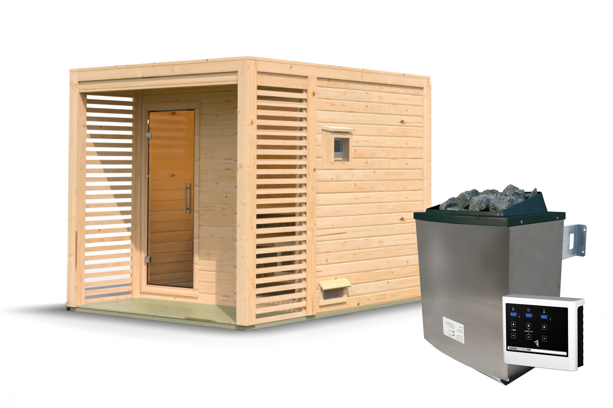 Genießen Sie ultimativen Komfort auf unseren Bänken aus Espe, einem Holz von außergewöhnlicher Qualität, das sich durch seine angenehme Textur und Wärme auszeichnet. Die Terrasse mit kesseldruckimprägnierter Beplankung bietet Ihnen einen stilvollen Außenbereich, um sich nach Ihrer Saunasitzung zu entspannen und die frische Luft zu genießen. Für Privatsphäre und Ästhetik sorgen die Lamellenwände, die als Sichtschutz dienen und gleichzeitig eine moderne Optik verleihen.
