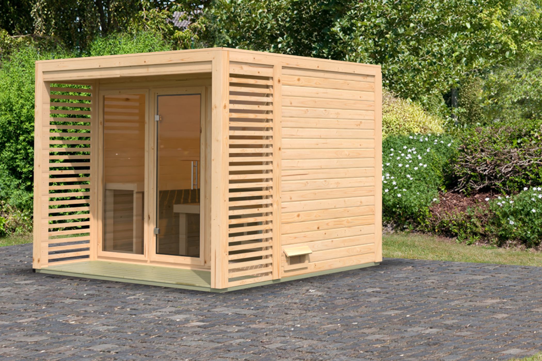 Genießen Sie ultimativen Komfort auf unseren Bänken aus Espe, einem Holz von außergewöhnlicher Qualität, das sich durch seine angenehme Textur und Wärme auszeichnet. Die Terrasse mit kesseldruckimprägnierter Beplankung bietet Ihnen einen stilvollen Außenbereich, um sich nach Ihrer Saunasitzung zu entspannen und die frische Luft zu genießen. Für Privatsphäre und Ästhetik sorgen die Lamellenwände, die als Sichtschutz dienen und gleichzeitig eine moderne Optik verleihen.