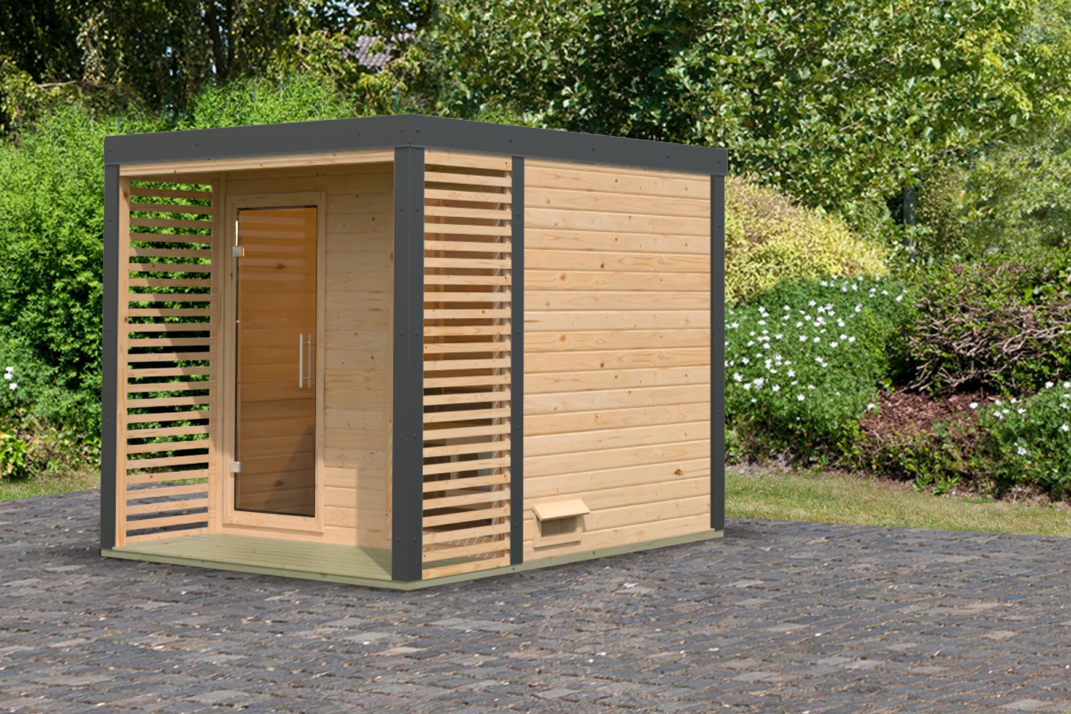 Die Wände bestehen aus nordischer Fichte, bekannt für ihre natürliche Schönheit und Robustheit. Stahlecken verleihen dem Design einen modernen Touch. Ein großer Vorteil ist die geringe Wartung, dank der Stahlelemente im Vergleich zu reinen Holzgartenhäusern. So haben Sie mehr Zeit zum Saunieren statt zur Instandhaltung. Das Gartenhaus ist individualisierbar und in verschiedenen Farben erhältlich, die frei kombiniert werden können. Gestalten Sie es nach Ihrem persönlichen Geschmack und lassen Sie Ihren Garten erstrahlen.
