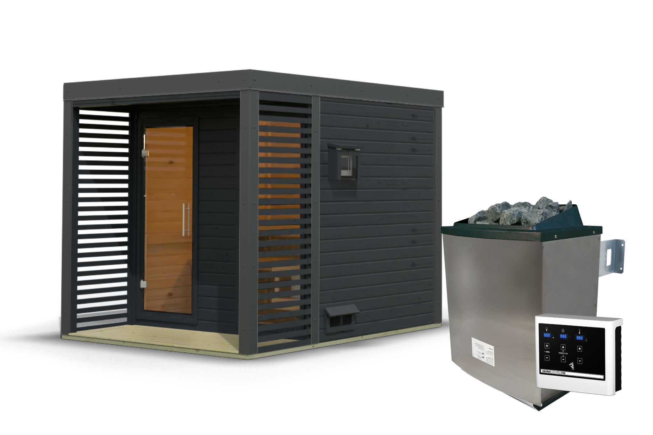 Die Wände bestehen aus nordischer Fichte, bekannt für ihre natürliche Schönheit und Robustheit. Stahlecken verleihen dem Design einen modernen Touch. Ein großer Vorteil ist die geringe Wartung, dank der Stahlelemente im Vergleich zu reinen Holzgartenhäusern. So haben Sie mehr Zeit zum Saunieren statt zur Instandhaltung. Das Gartenhaus ist individualisierbar und in verschiedenen Farben erhältlich, die frei kombiniert werden können. Gestalten Sie es nach Ihrem persönlichen Geschmack und lassen Sie Ihren Garten erstrahlen.