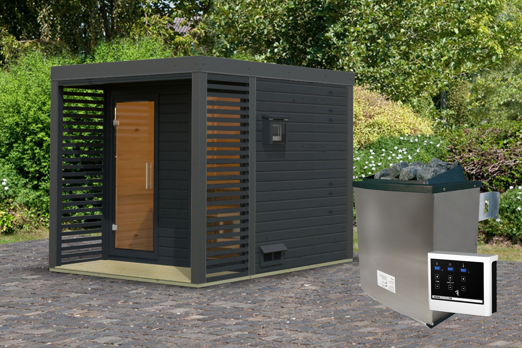 Die Bänke aus Espe laden zum Entspannen und Wohlfühlen ein, während die Terrasse mit kesseldruckimprägnierter Beplankung einen stilvollen Außenbereich schafft, um die frische Luft zu genießen. Für Privatsphäre und eine moderne Ästhetik sorgen die Lamellenwände als Sichtschutz, während die Ganzglasfront einen offenen und einladenden Raum schafft und gleichzeitig einen atemberaubenden Ausblick auf Ihre Umgebung ermöglicht.