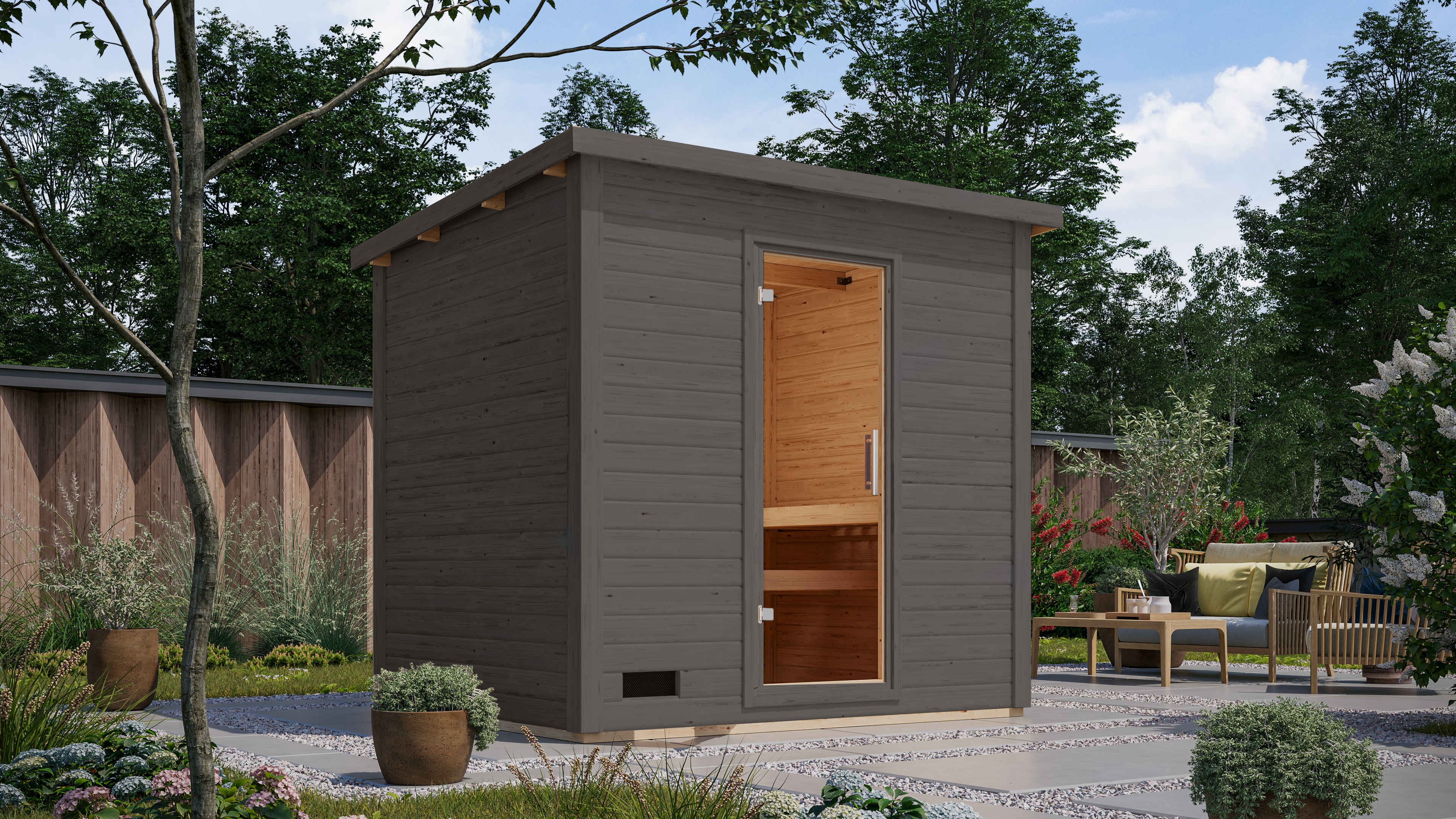 Das Saunahaus besteht aus 38 mm Massivholzbohlen aus nordischem Fichtenholz und wird im einfachen Steck- und Schraubsystem montiert. Es ist in klassischem Naturbelassen oder Terragrau lackiert erhältlich.