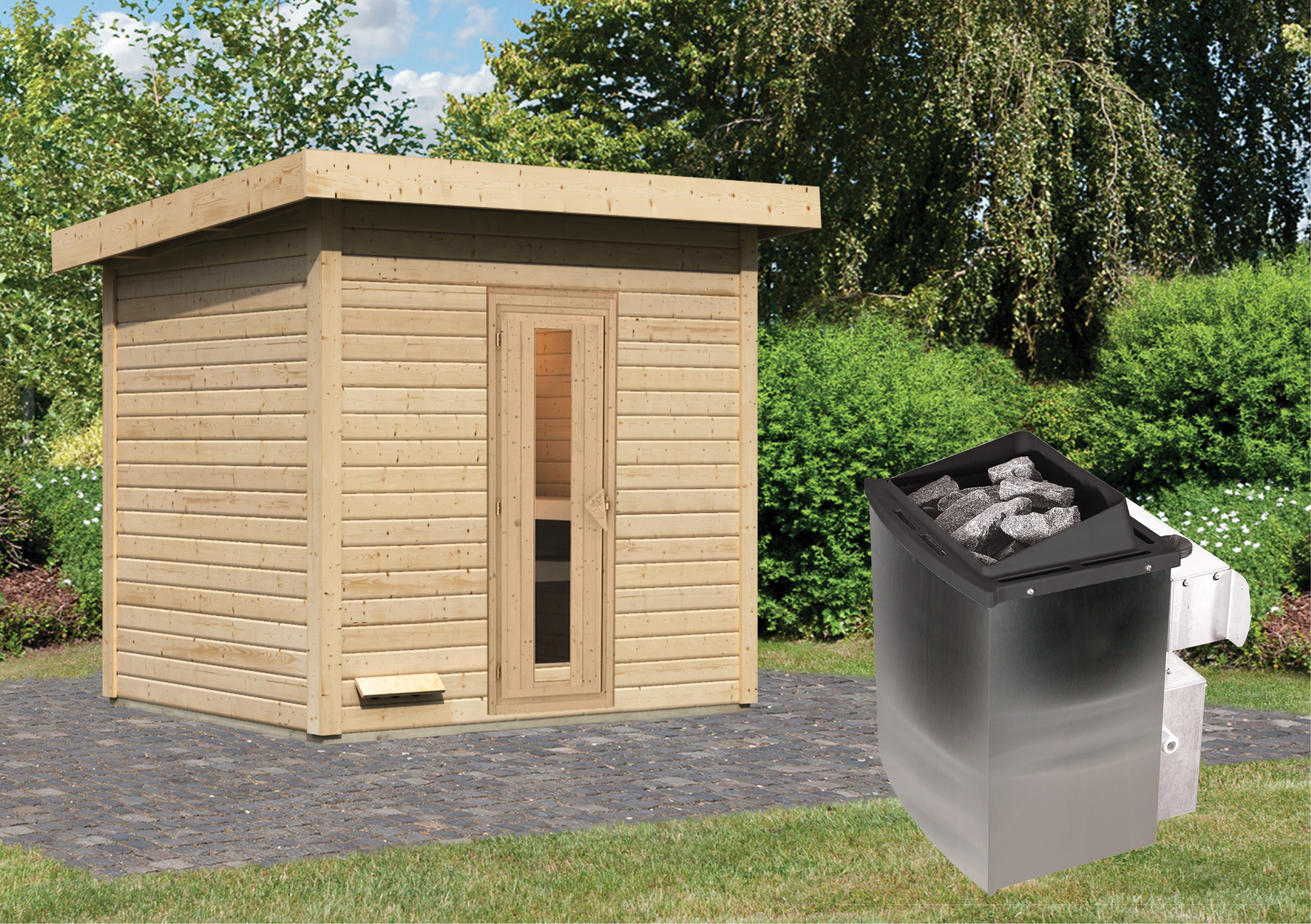 Saunieren nach dem Vorbild der Finnen. Mit dem Saunahaus Hytti 3 ist dies im eigenen Garten möglich. So ist das typische Eis- oder Schneebaden nach dem Saunagang zumindest im Winter durchaus möglich. Sollten Sie sogar einen See vor dem Haus haben, können Sie auch diesen nutzen, um sich abzukühlen. Das Saunahaus Hytti 3 bietet mit einem Außenmaß von 231 x 196 x 228 cm genügend Raum zum Entspannen. Nach einem stressigen Arbeitstag sich in den eigenen Garten zurückziehen und in der Außensauna entspannen oder den Urlaubstag im Garten mit einem ausgiebigen Saunagang abrunden